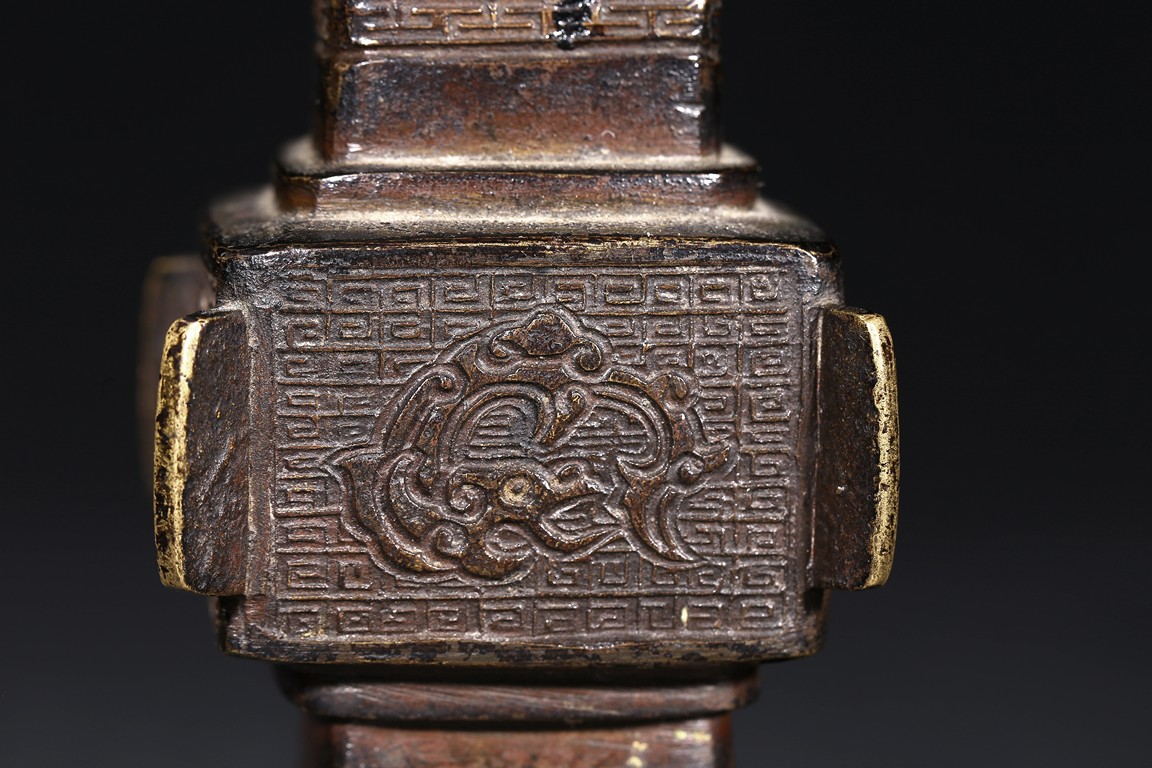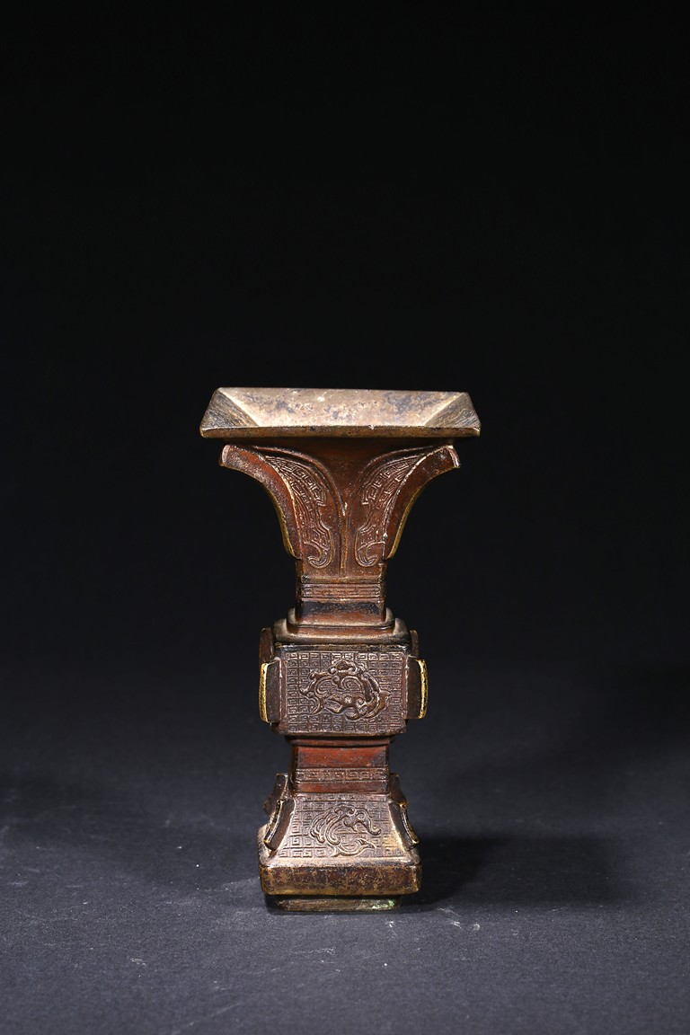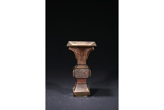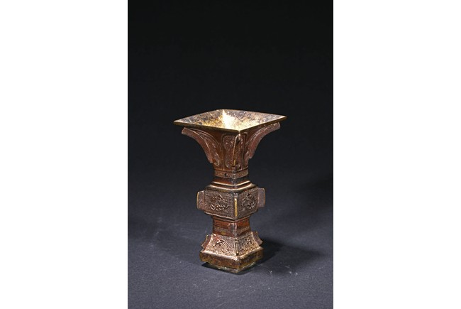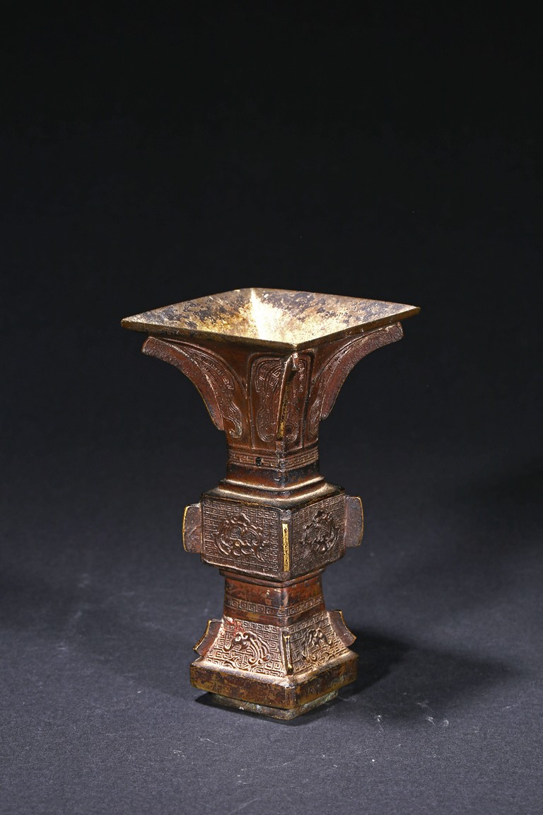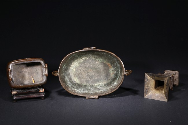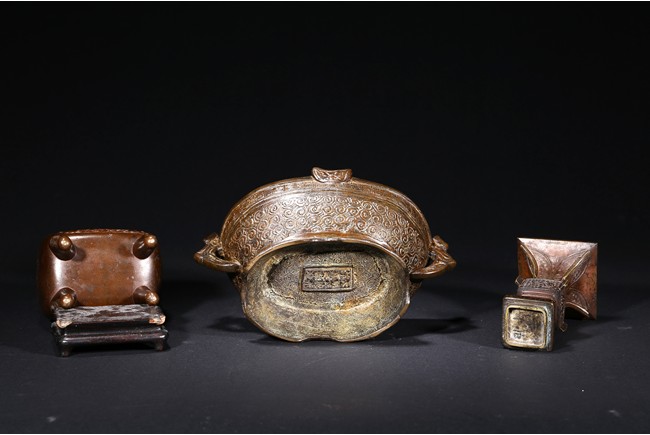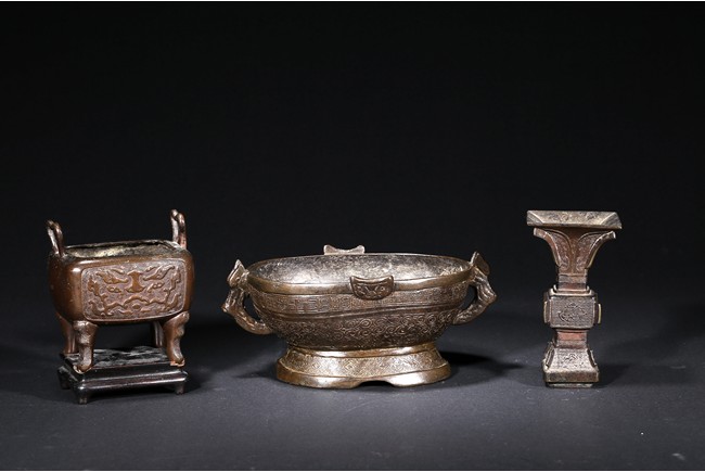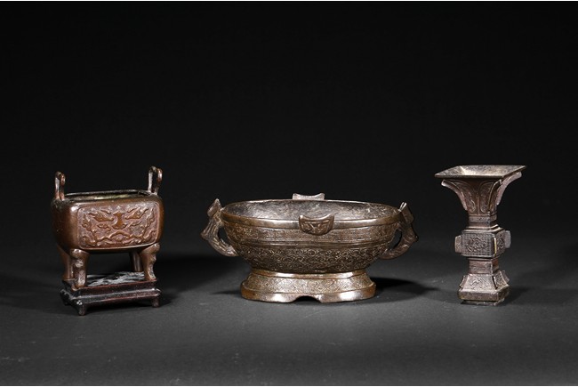 Consisting of a bronze three-sectioned gu-form vessel, a bronze fu-form vessel with inscription mark to the base, and a bronze four-feet square ding vessel. Qing Dynasty period.
