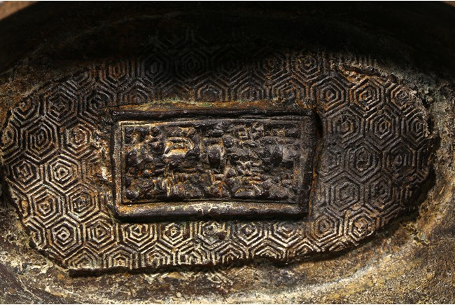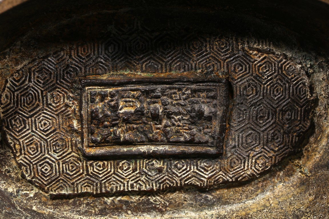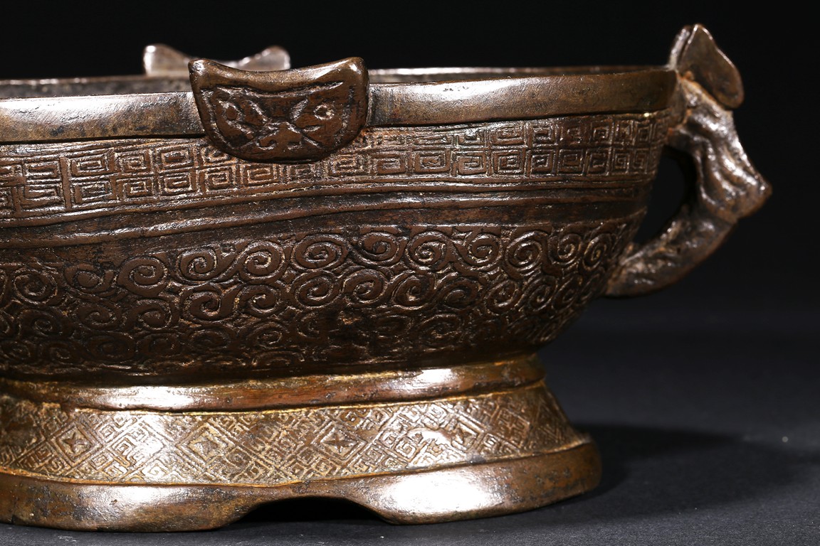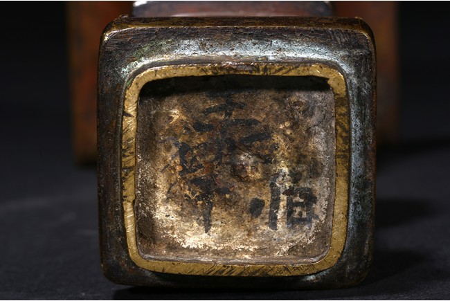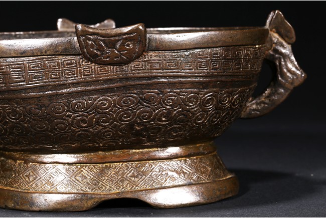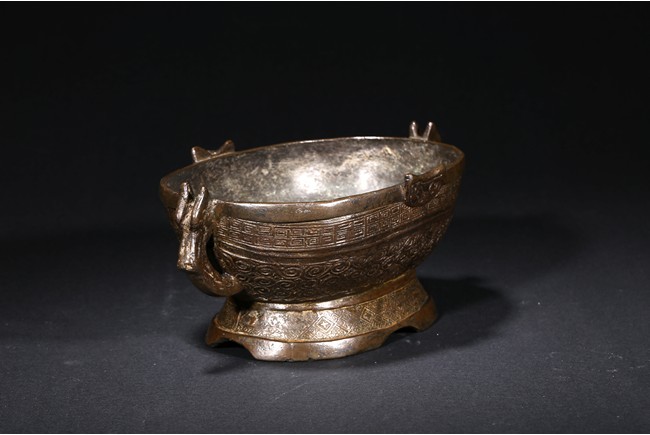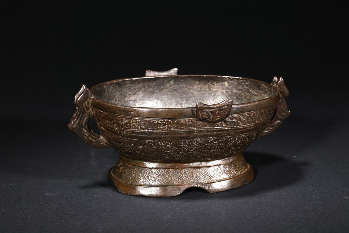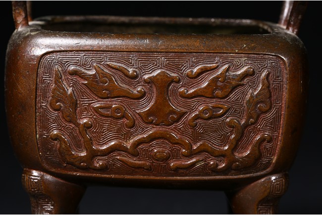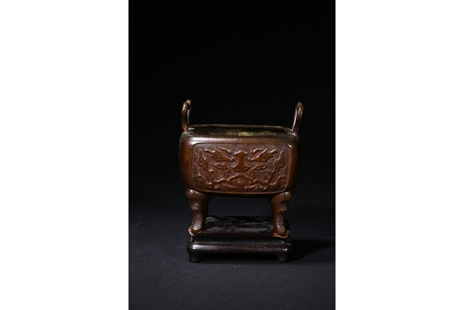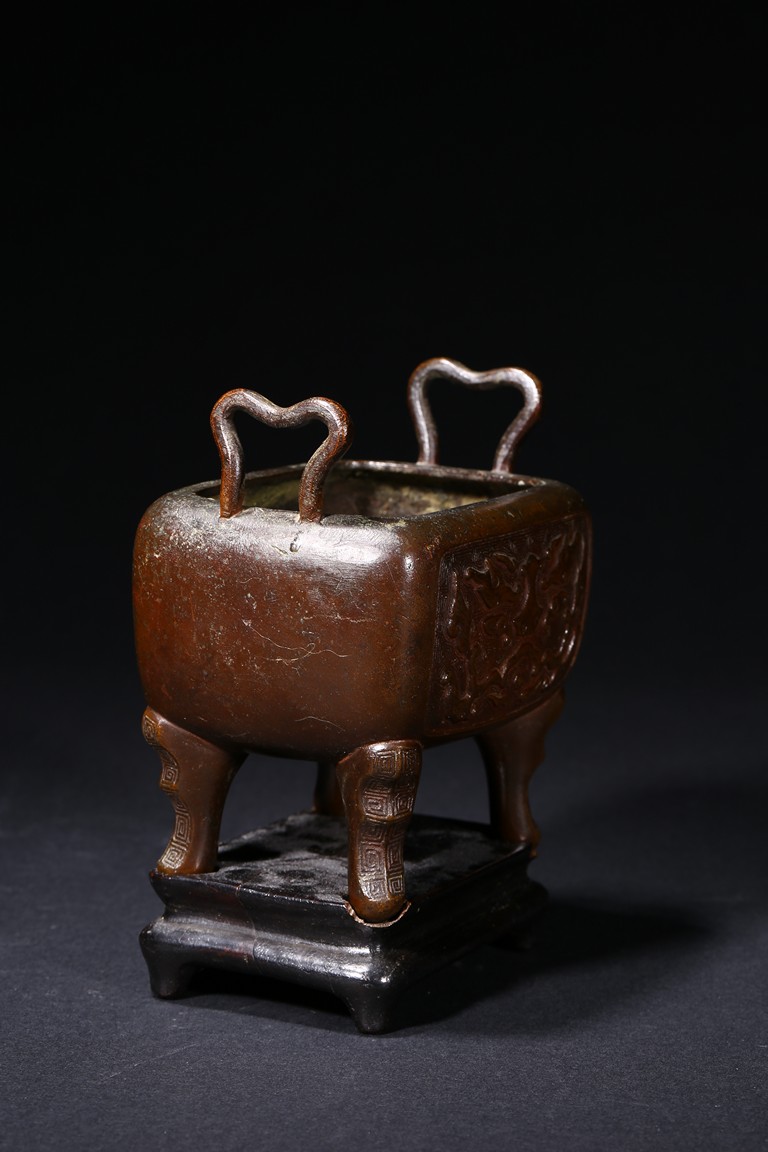 Consisting of a bronze three-sectioned gu-form vessel, a bronze fu-form vessel with inscription mark to the base, and a bronze four-feet square ding vessel. Qing Dynasty period.