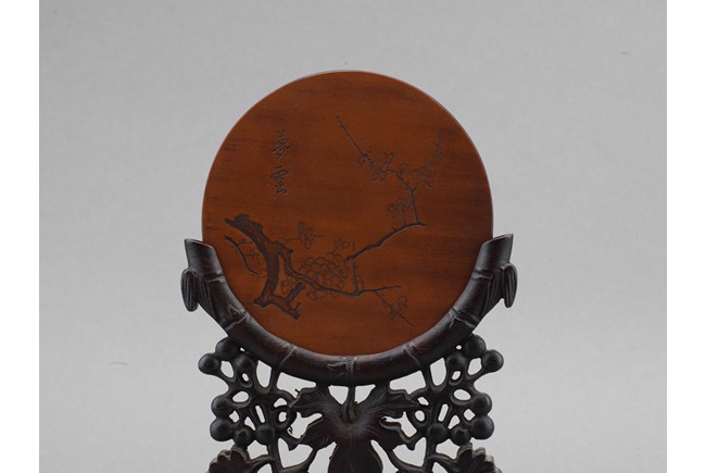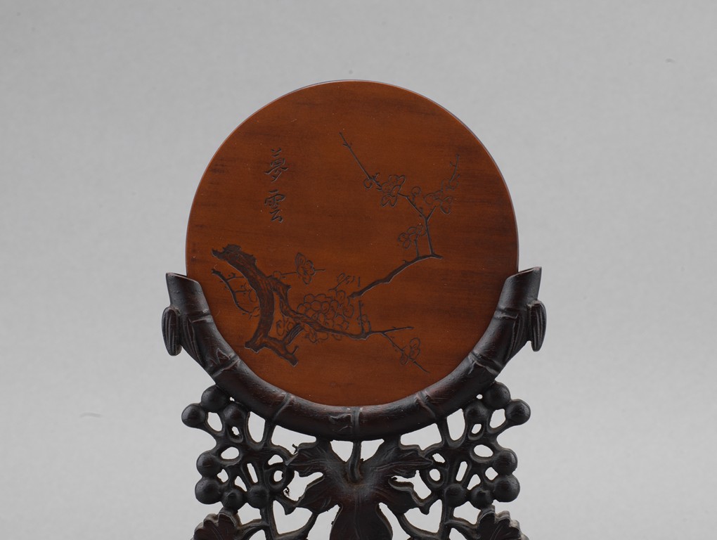 Of circular form, carved with plum blossom and two character inscription. Qing Dynasty period.