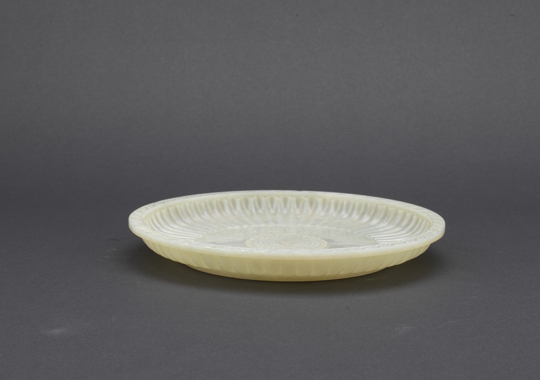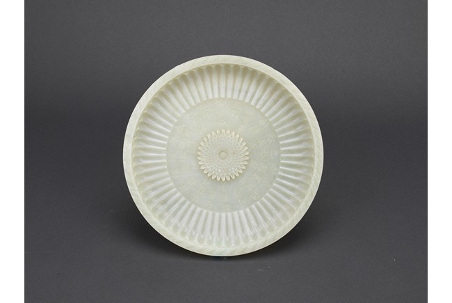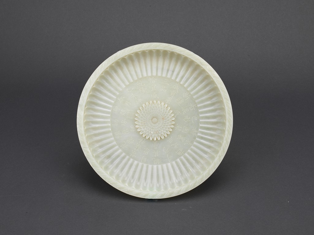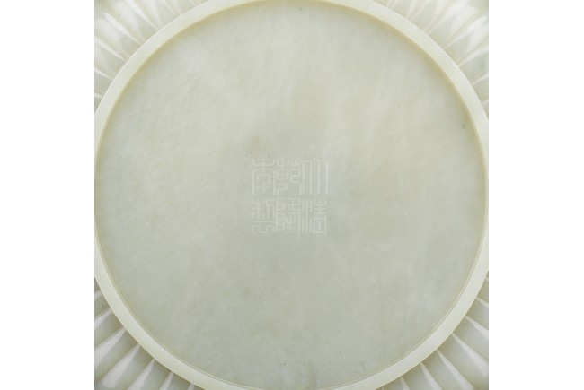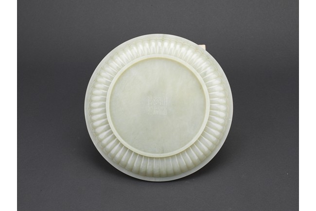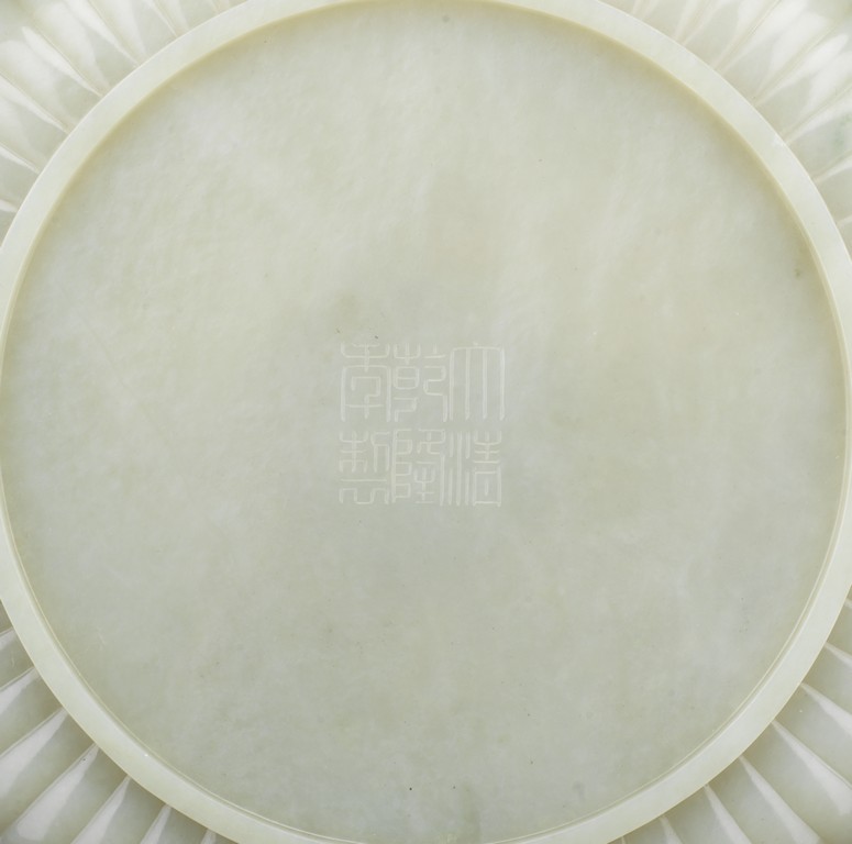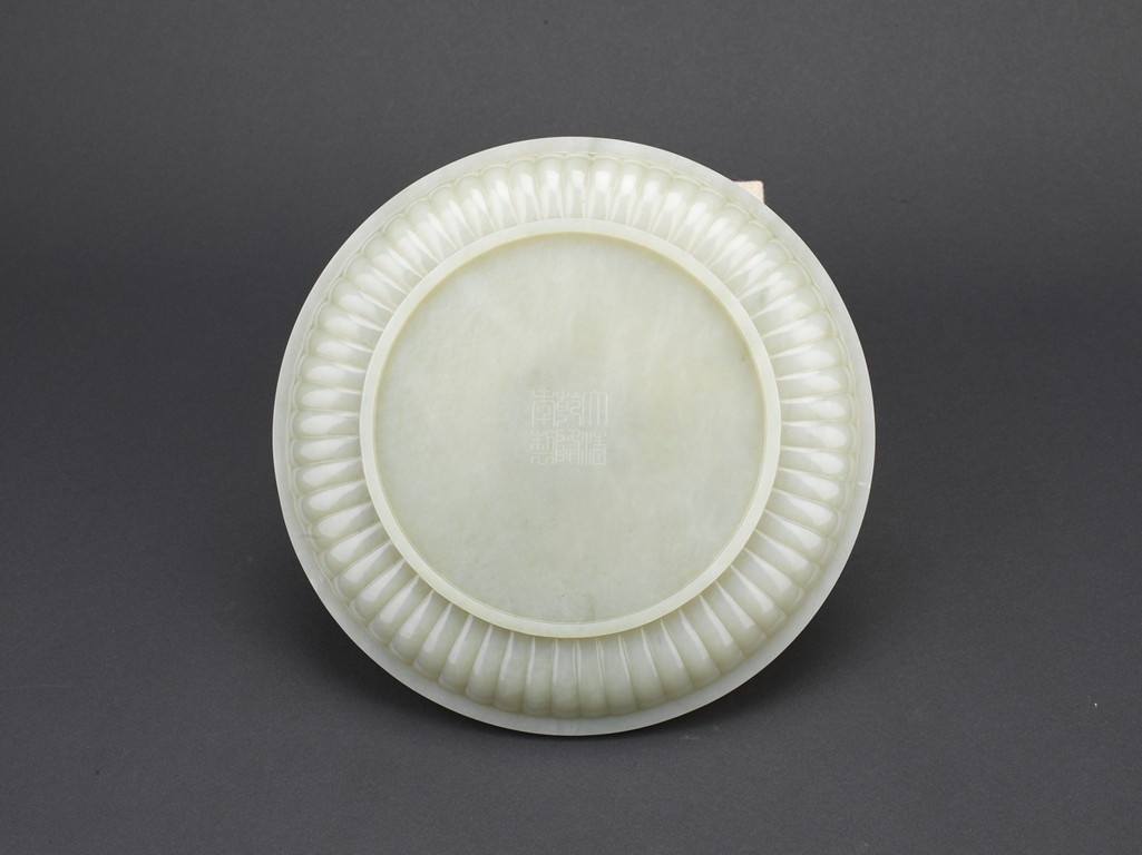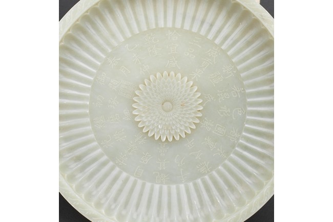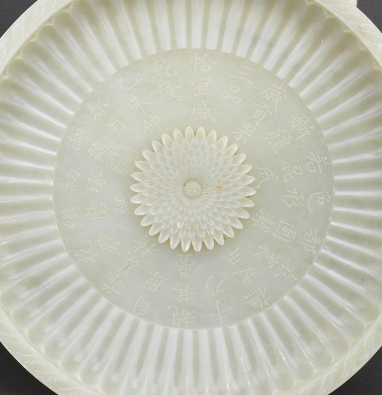 The dish has thin, rounded sides carved with a chrysanthemum flower at the center surrounded with a row of imperial regular script inscription and a row of chrysanthemum petals to the rim. The underside with six character Qianlong mark. Qing Dynasty period.