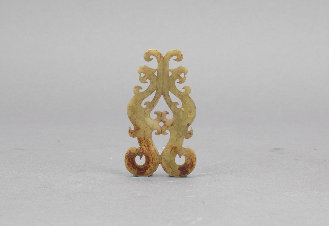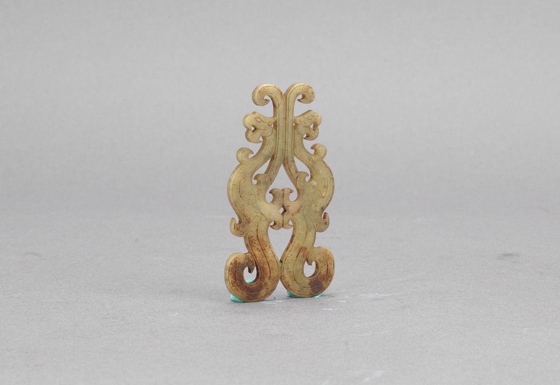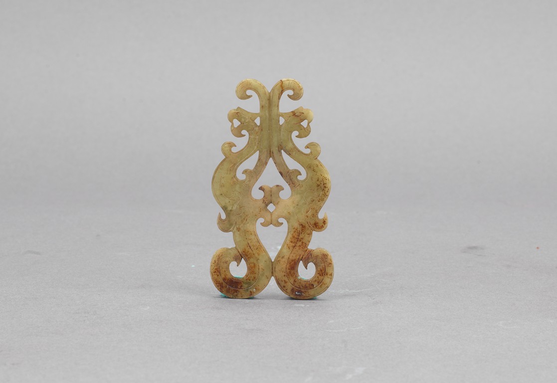 Carved in the form of two stylized phoenix opposite to each other, finely carved and incised as curled tail and wings. Warring State period.