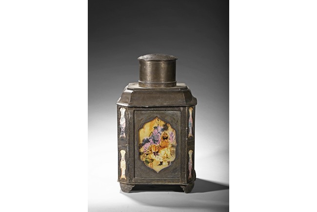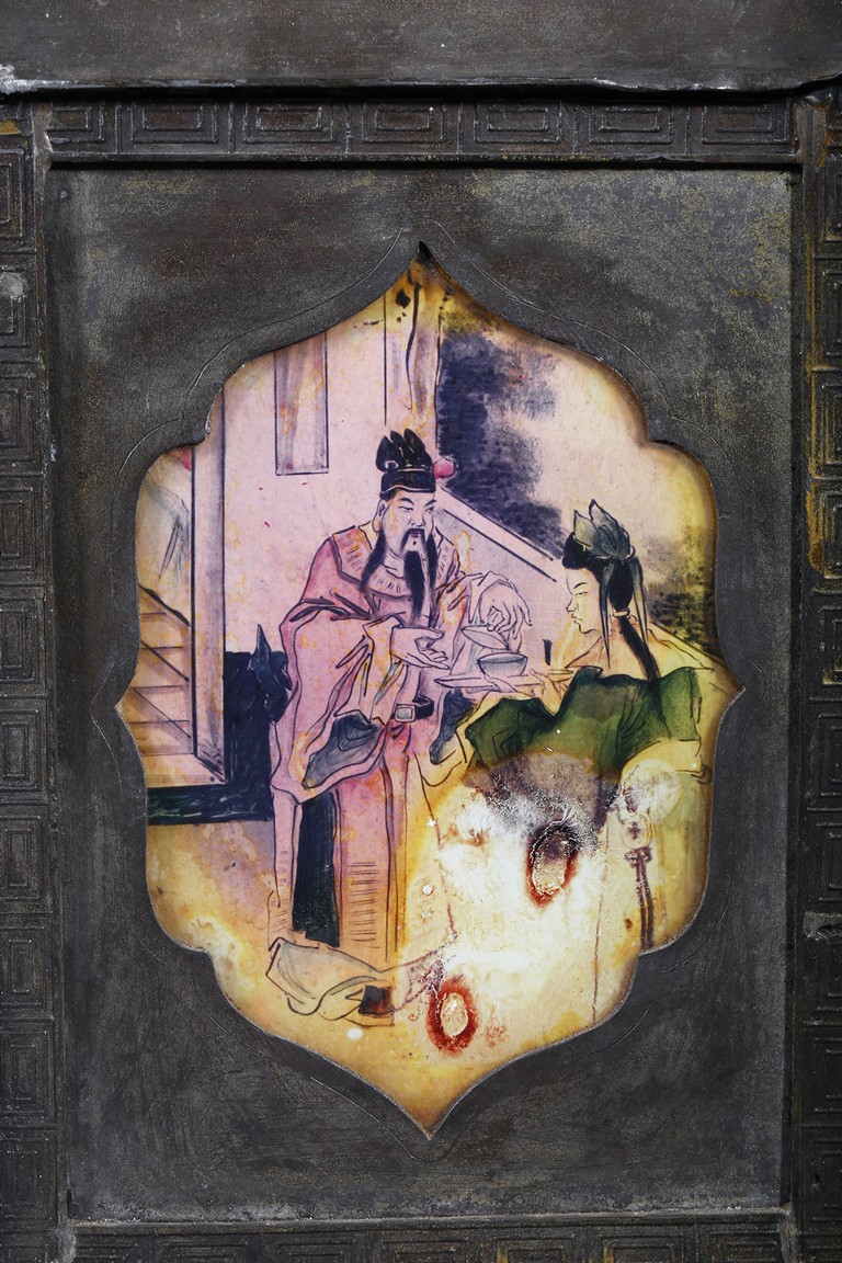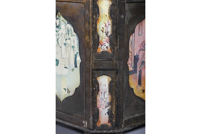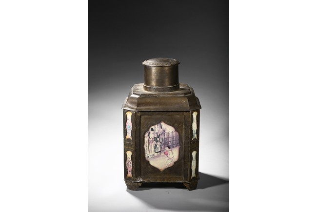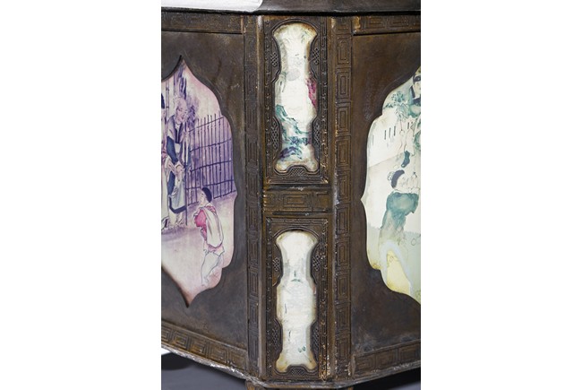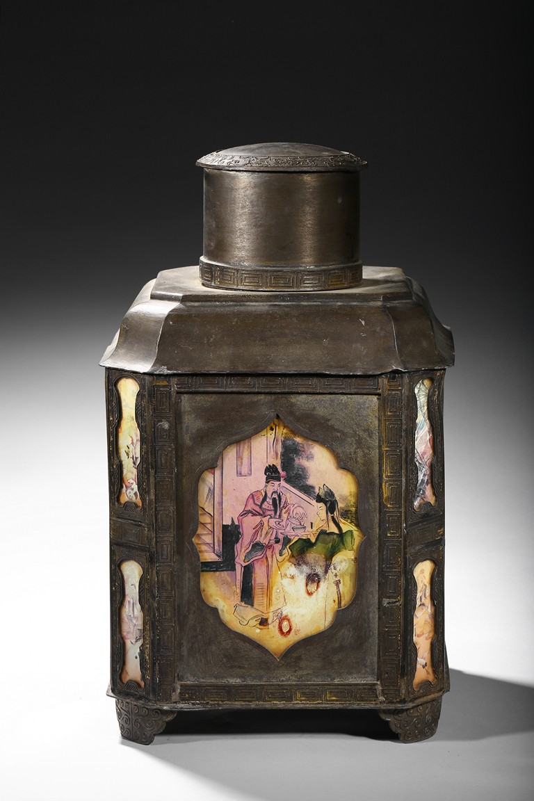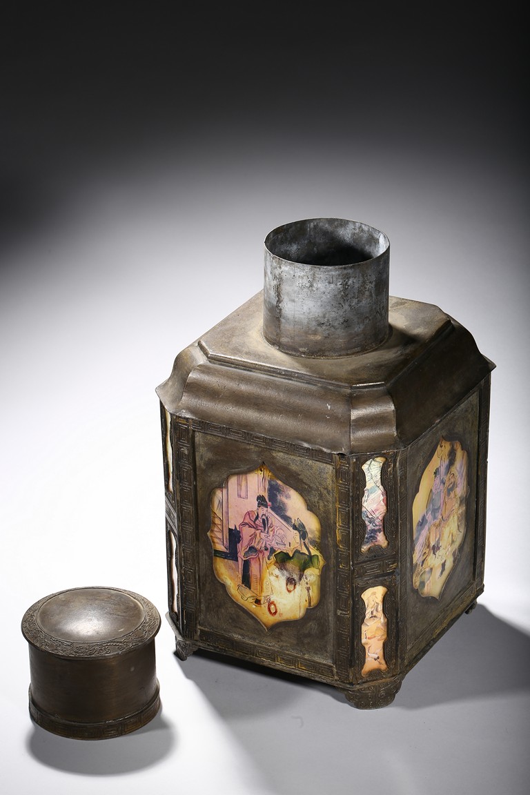 Usually large size, of hexagonal section and raised on four ruyi-shaped feet with scrolled decorations, each side with shaped cartouche enclosing reverse-painted traditional story scenes on glass, the cylindrical neck fitted with a cover, the base impressed with a mark. Qing Dynasty period.