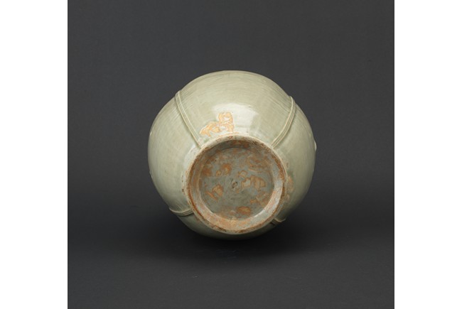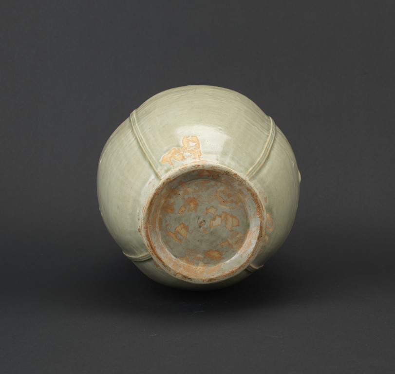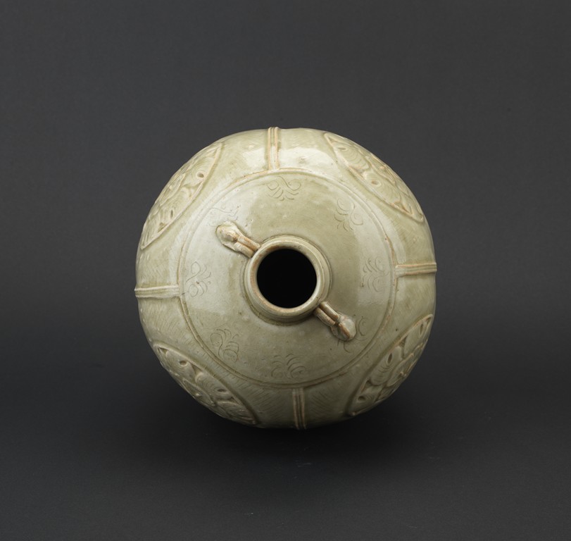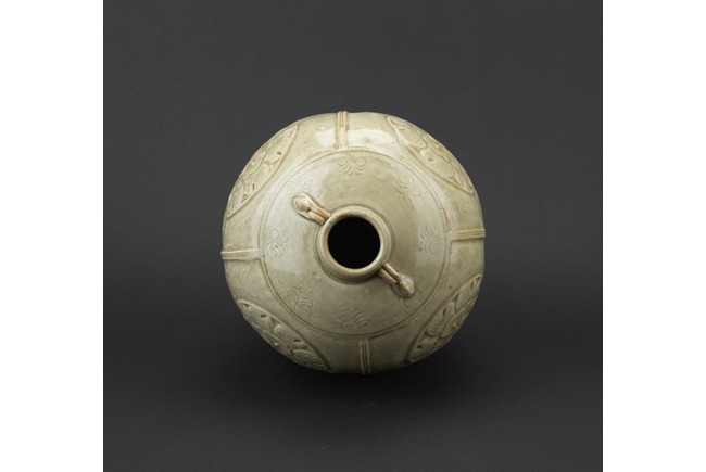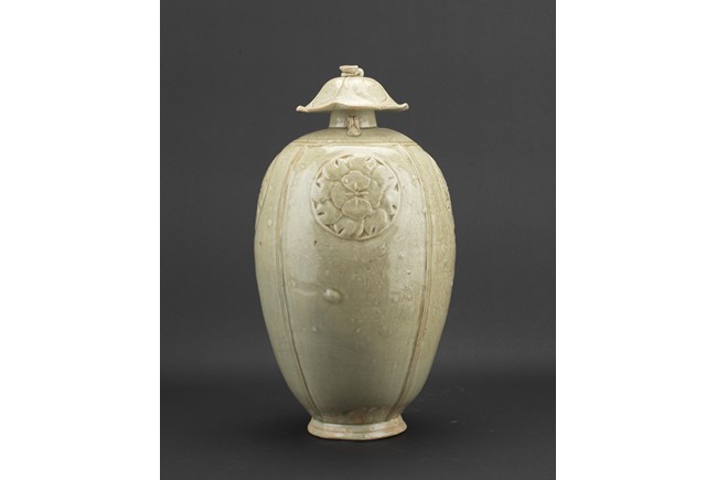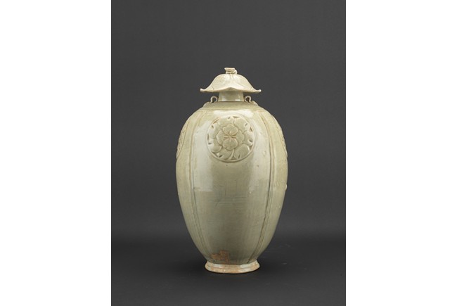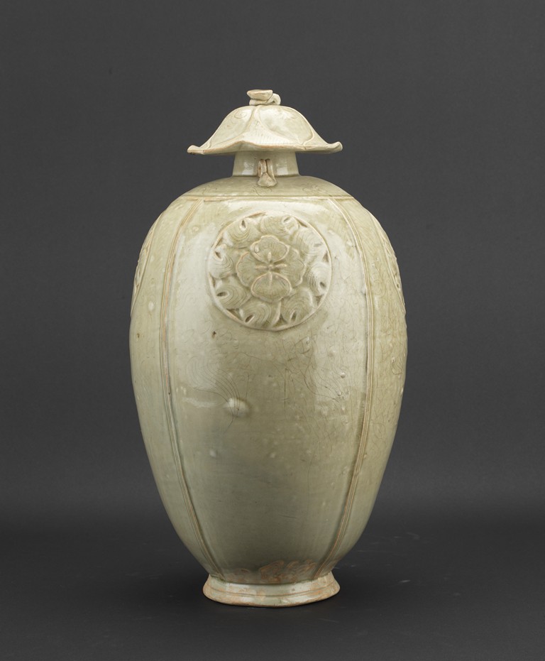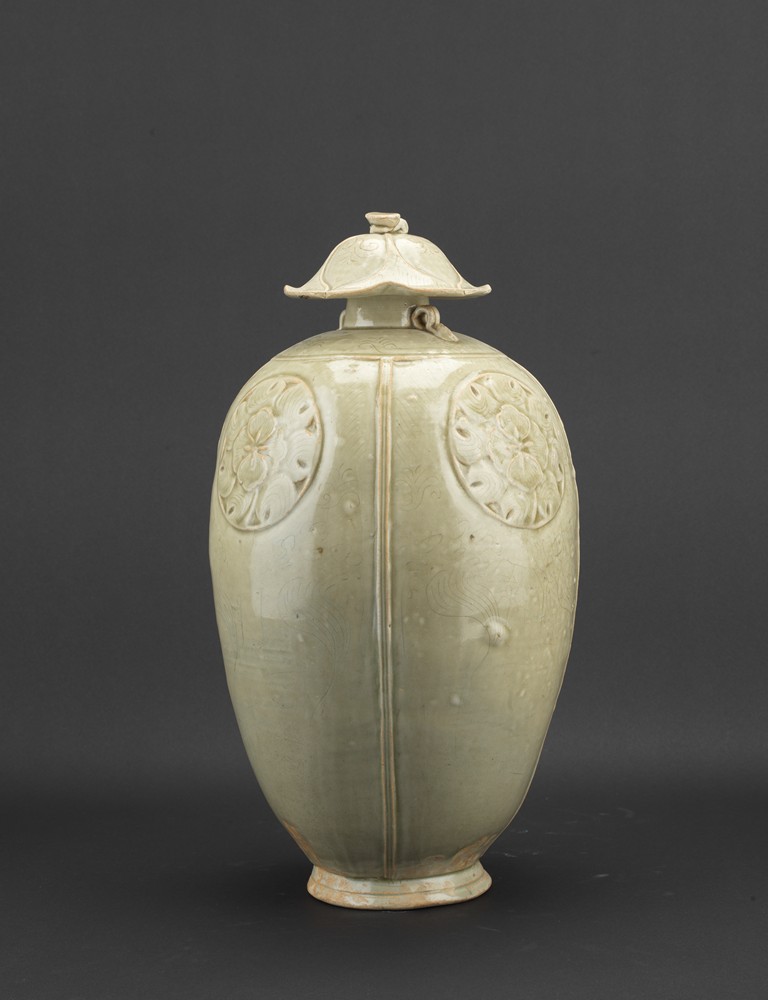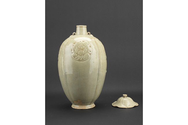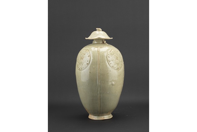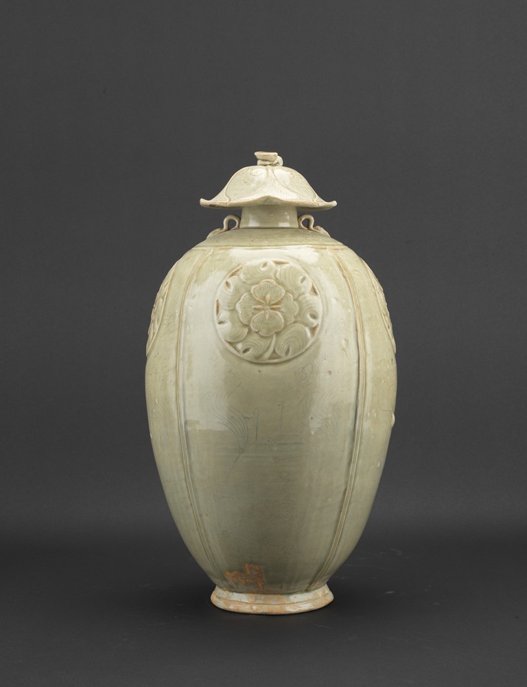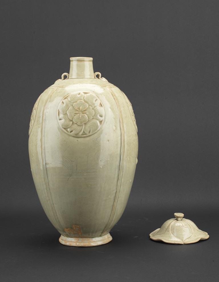 The ovoid body rising from a spreading foot, the body divided into four lobes, each moulded with raised floral mendallion, applied with two handles on the shoulder, covered overall olive-green glaze. Song Dynasty period.