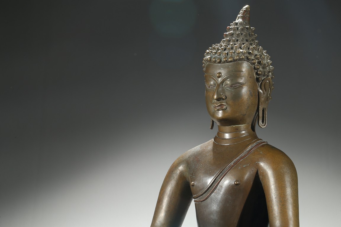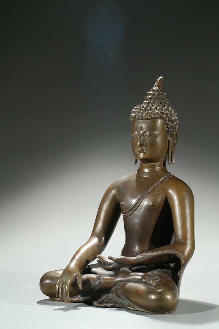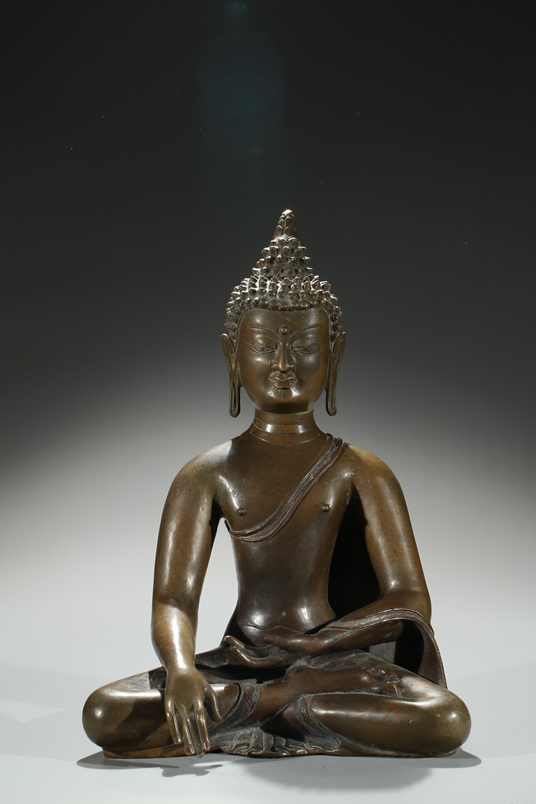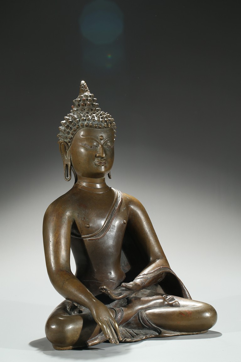 Seated in vajrasana with his right hand lowered in bhumisparsha mudra while the left is resting on his lap, clad in a dhoti with incised hems, his face with a serene expression with downcast eyes below arched eyebrows centered by a raised urna, flanked by elongated earlobes, hair drawn into a high chignon. 18th century.