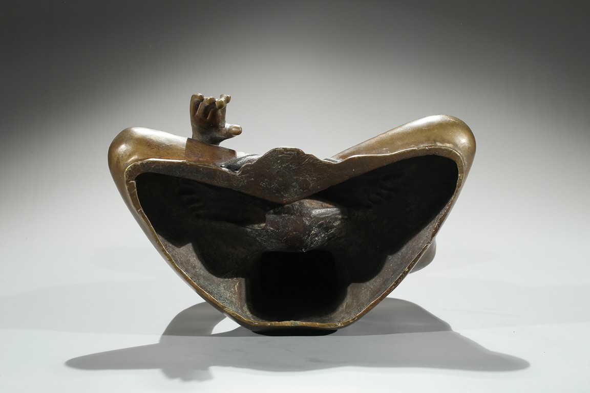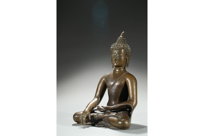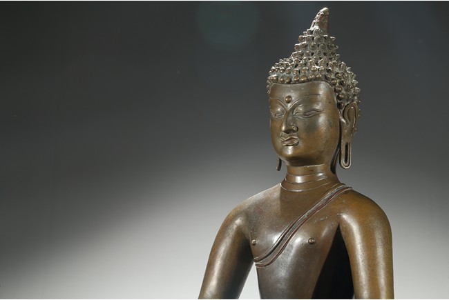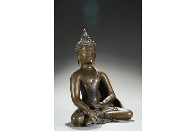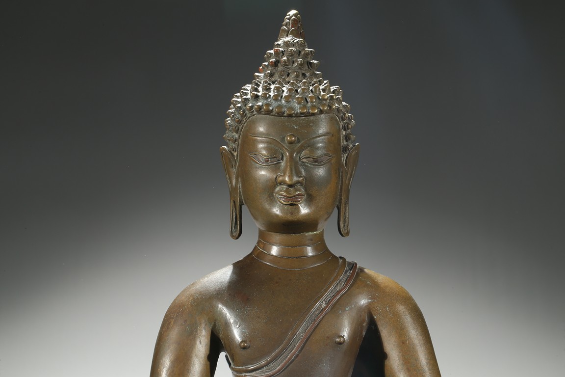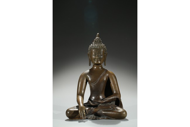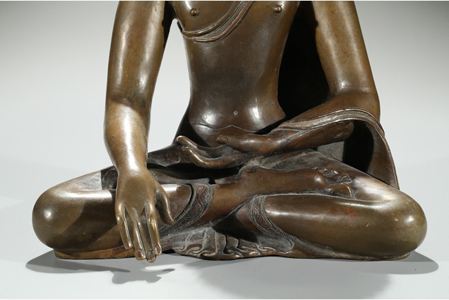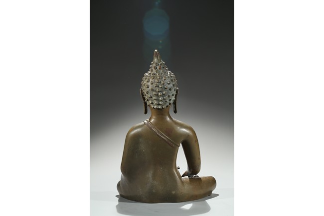 Seated in vajrasana with his right hand lowered in bhumisparsha mudra while the left is resting on his lap, clad in a dhoti with incised hems, his face with a serene expression with downcast eyes below arched eyebrows centered by a raised urna, flanked by elongated earlobes, hair drawn into a high chignon. 18th century.