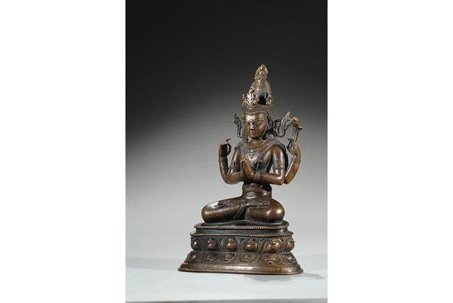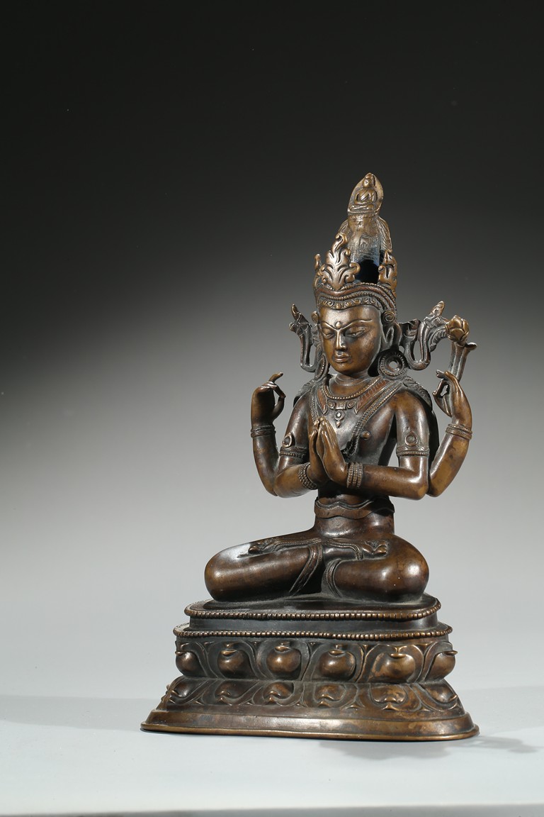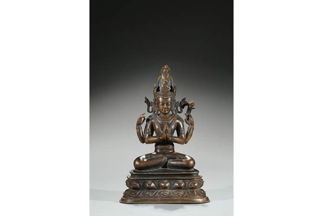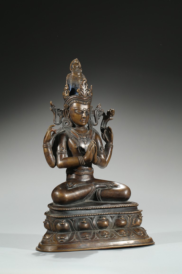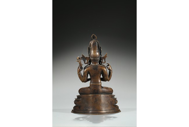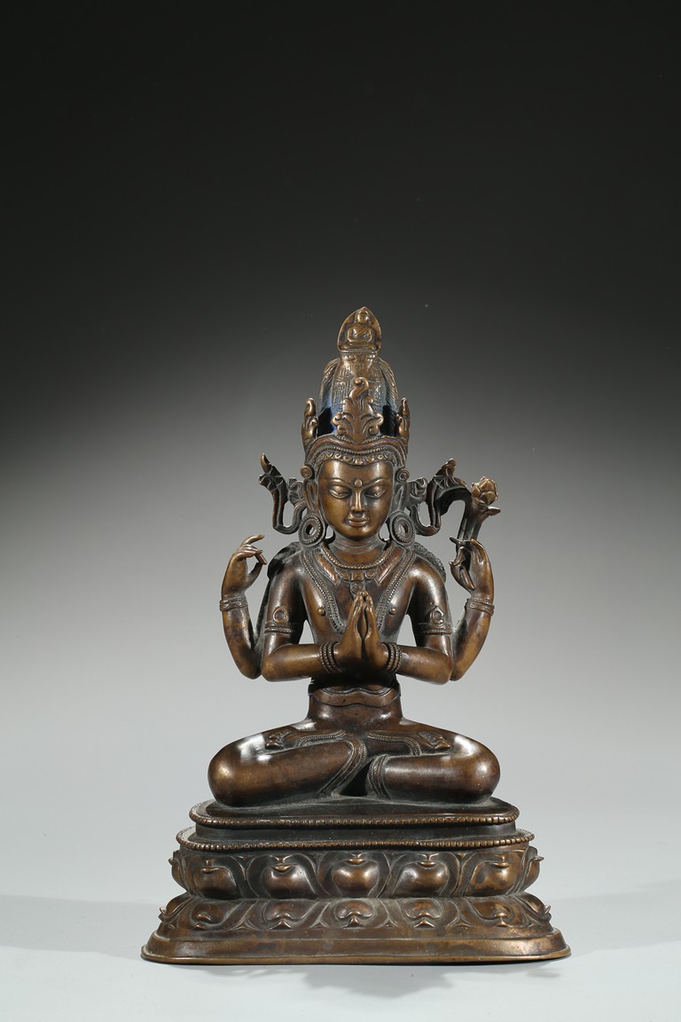 Cast seated in dhyanasana on a double-lotus base, the principle arms clasped in namaskara mudra before the chest with two attendant arms raised in vitarka mudra, dressed in a dhoti further embellished with jewellery, the hair gathered in a high knotted chignon. 18th century.
