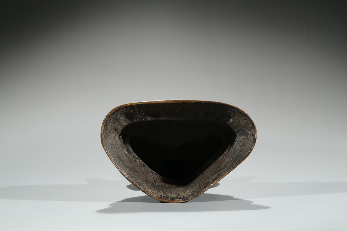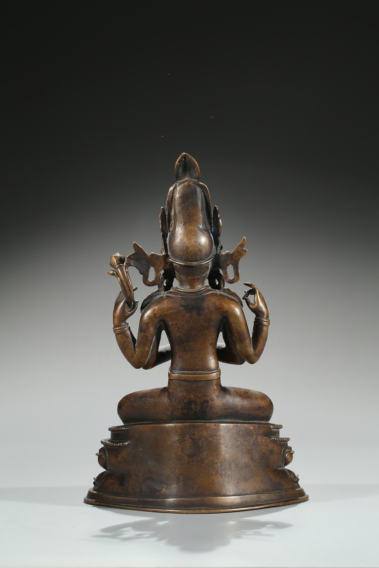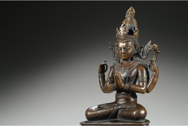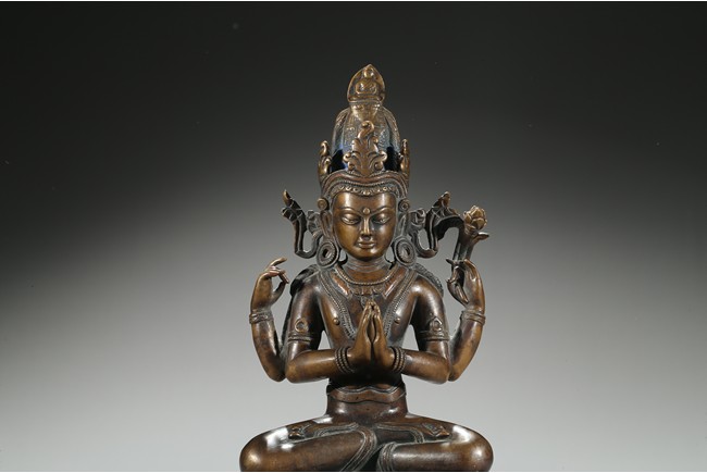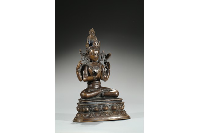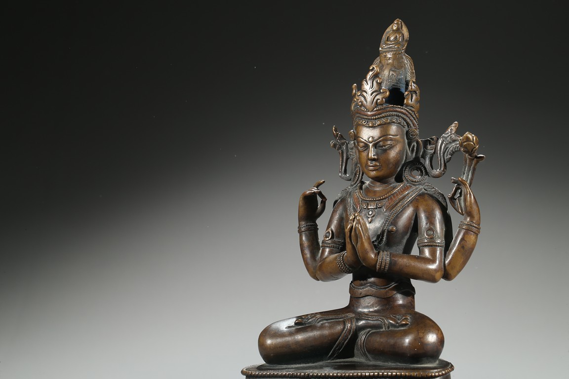 Cast seated in dhyanasana on a double-lotus base, the principle arms clasped in namaskara mudra before the chest with two attendant arms raised in vitarka mudra, dressed in a dhoti further embellished with jewellery, the hair gathered in a high knotted chignon. 18th century.