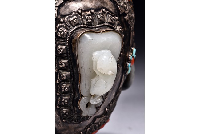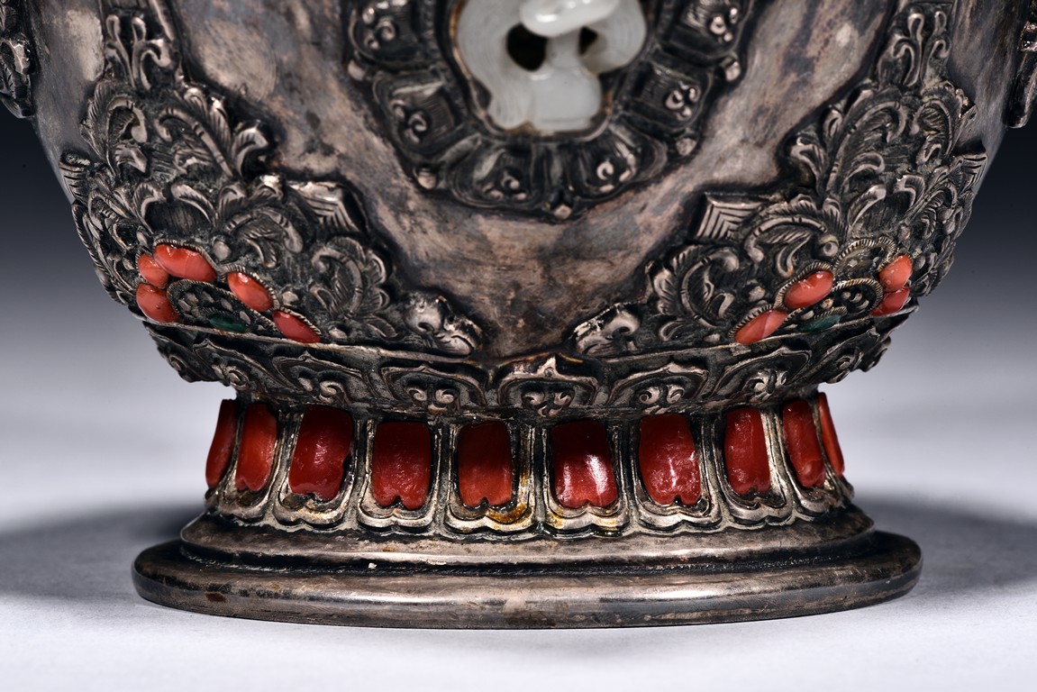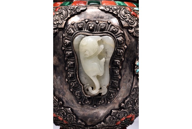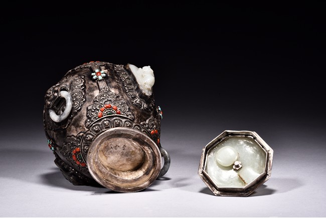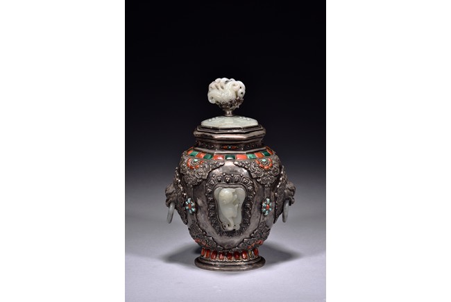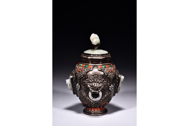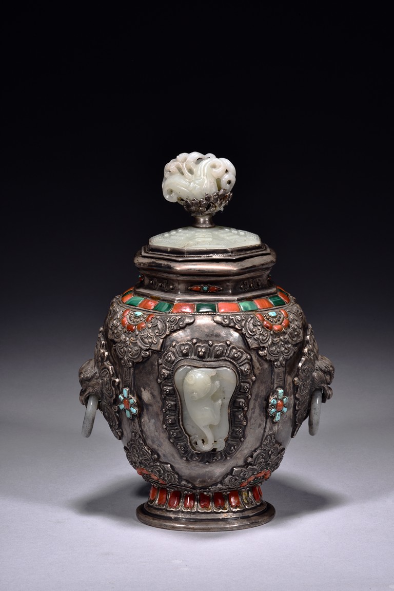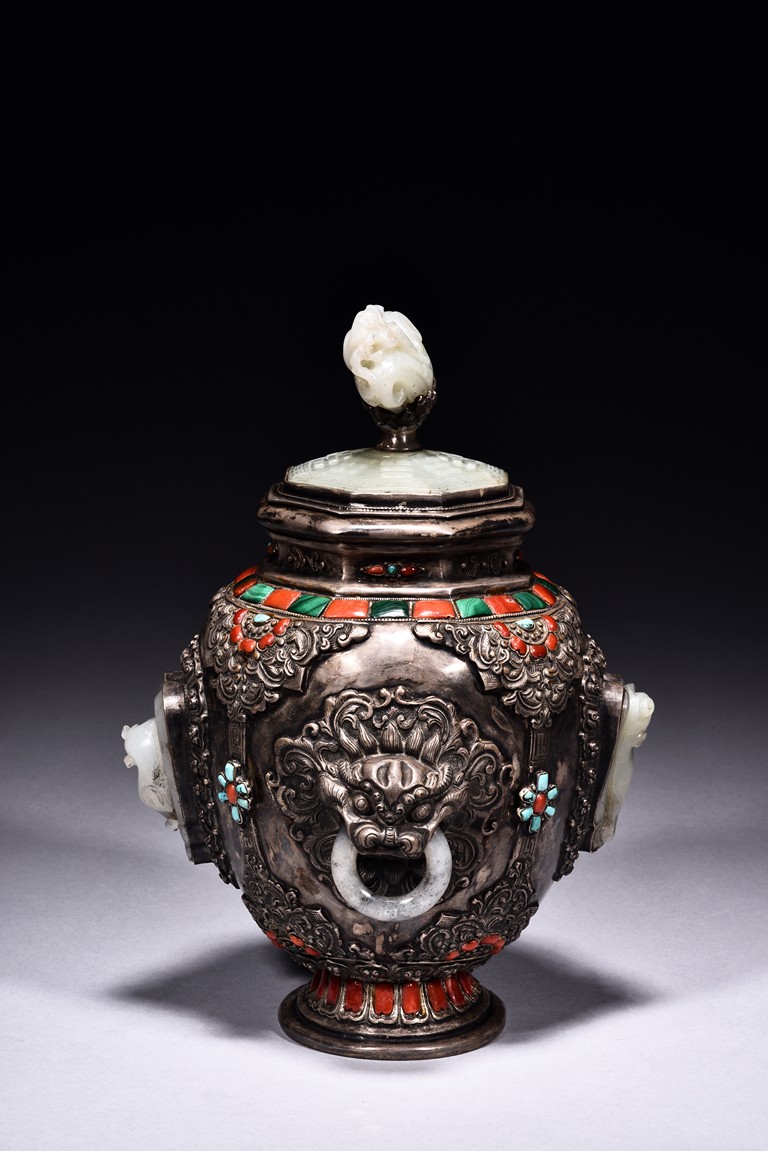 Of ovoid form and raised from coral-petal inset foot ring, the jar is finely decorated with white jade plaques of recumbent mythical beast enclosed by raised lotus pattern on both sides, the sides flanked by raised Buddhist lion head mask with jade ring, the cover further fitted with white jade plaque with bagua decoration, surmounted with a reticulated white jade finial. Qing Dynasty period.