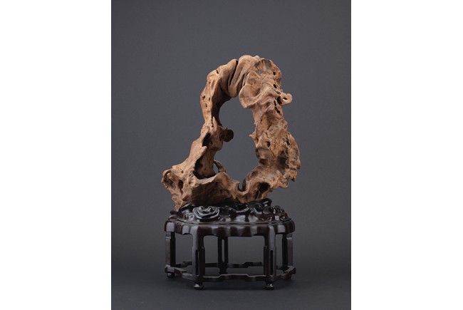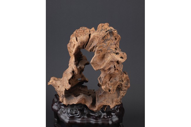 The naturalistic rendered wood with a central aperture and jagged edge, all supported on a wooden stand.