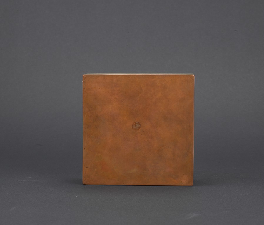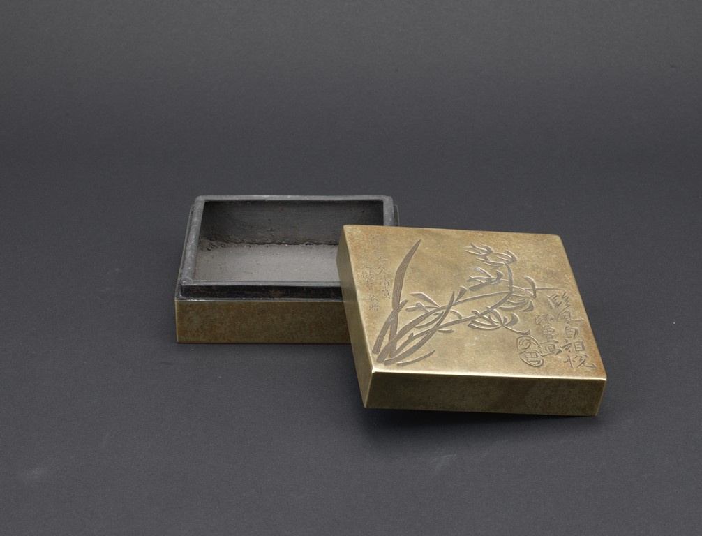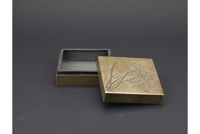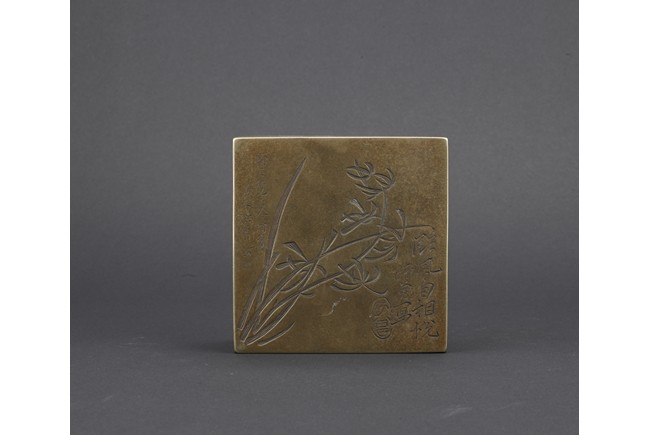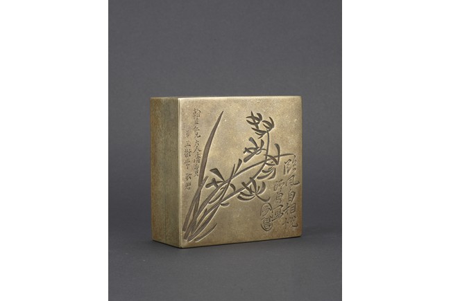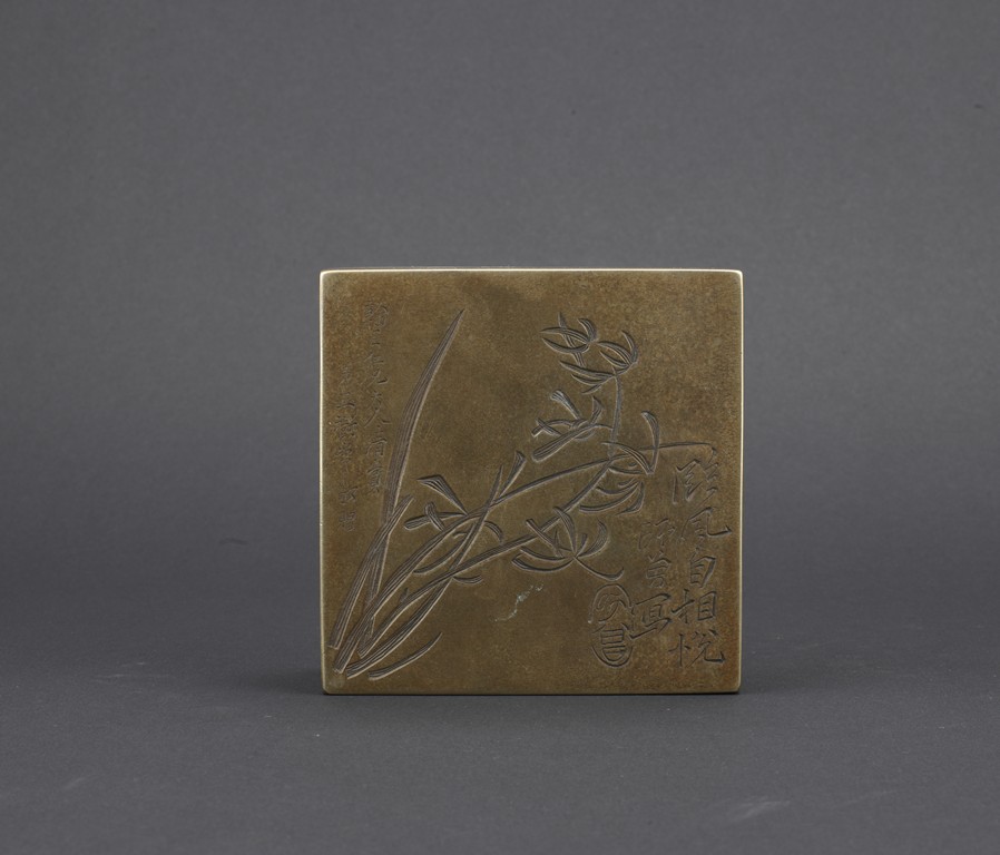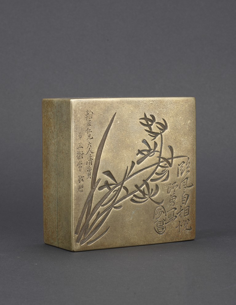 Of square section, the cover decorated with orchids and inscription in the style of Chen Shizeng's works, the underside with four character mark.