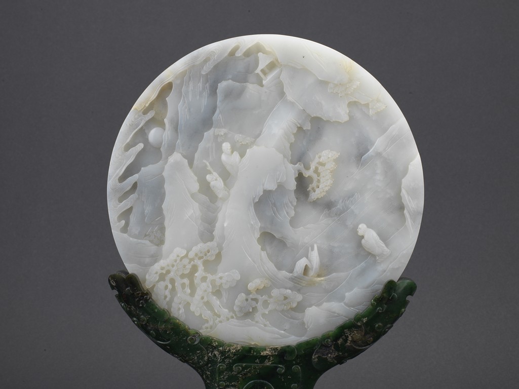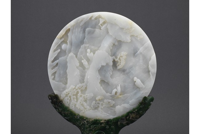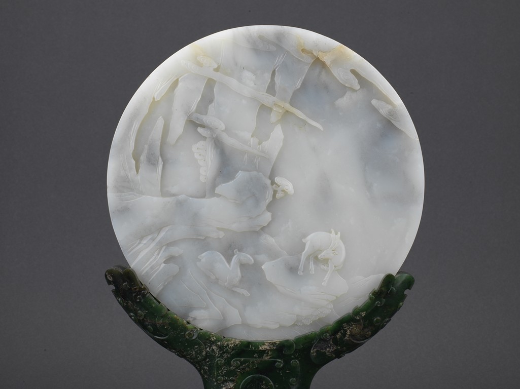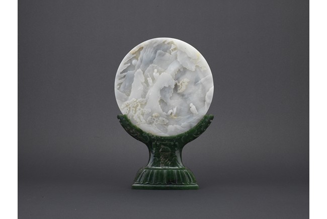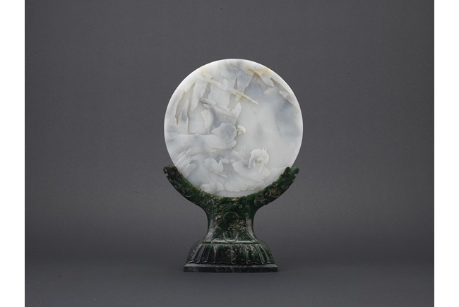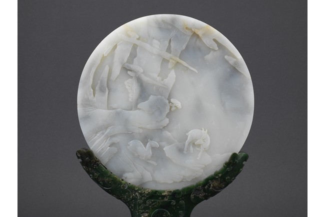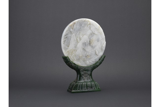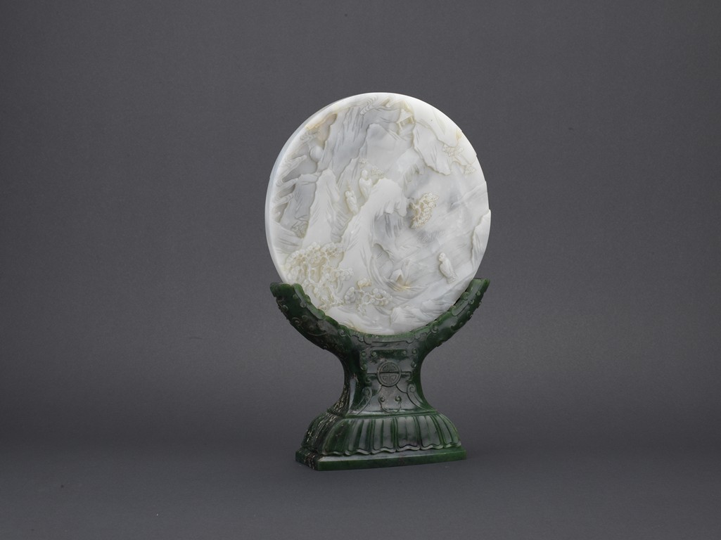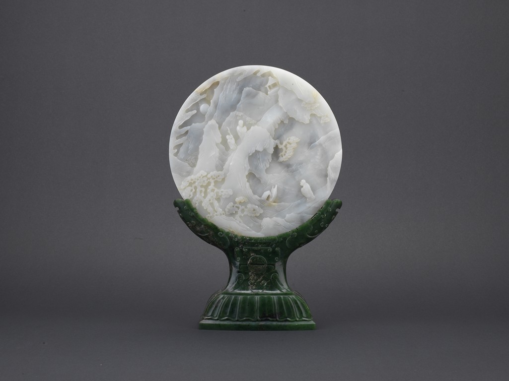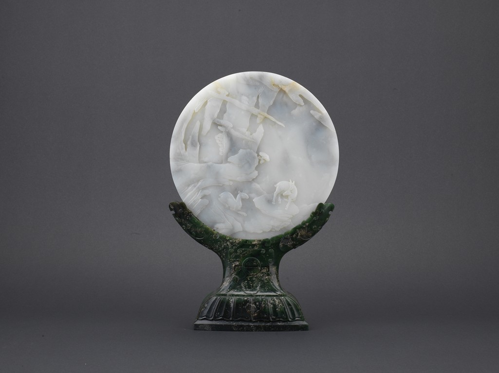 The circular screen panel deeply carved to depict a monk accompanied with a young attendant on an overhang cliff, conversing with a monk standing on the riverbank underneath him, with a distant view of pavillion and moon within the clouds, all framed in a mountain landscape; the reverse depicting two deer in a similar mountainous landscape with rocky outcrops, with further lingzhi branches and pine trees issuing from the rocks, all supported on a spinach green jade stand. Qing Dynasty period.