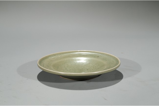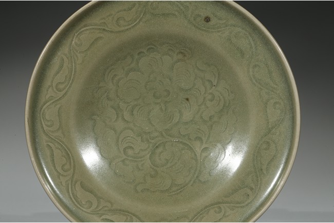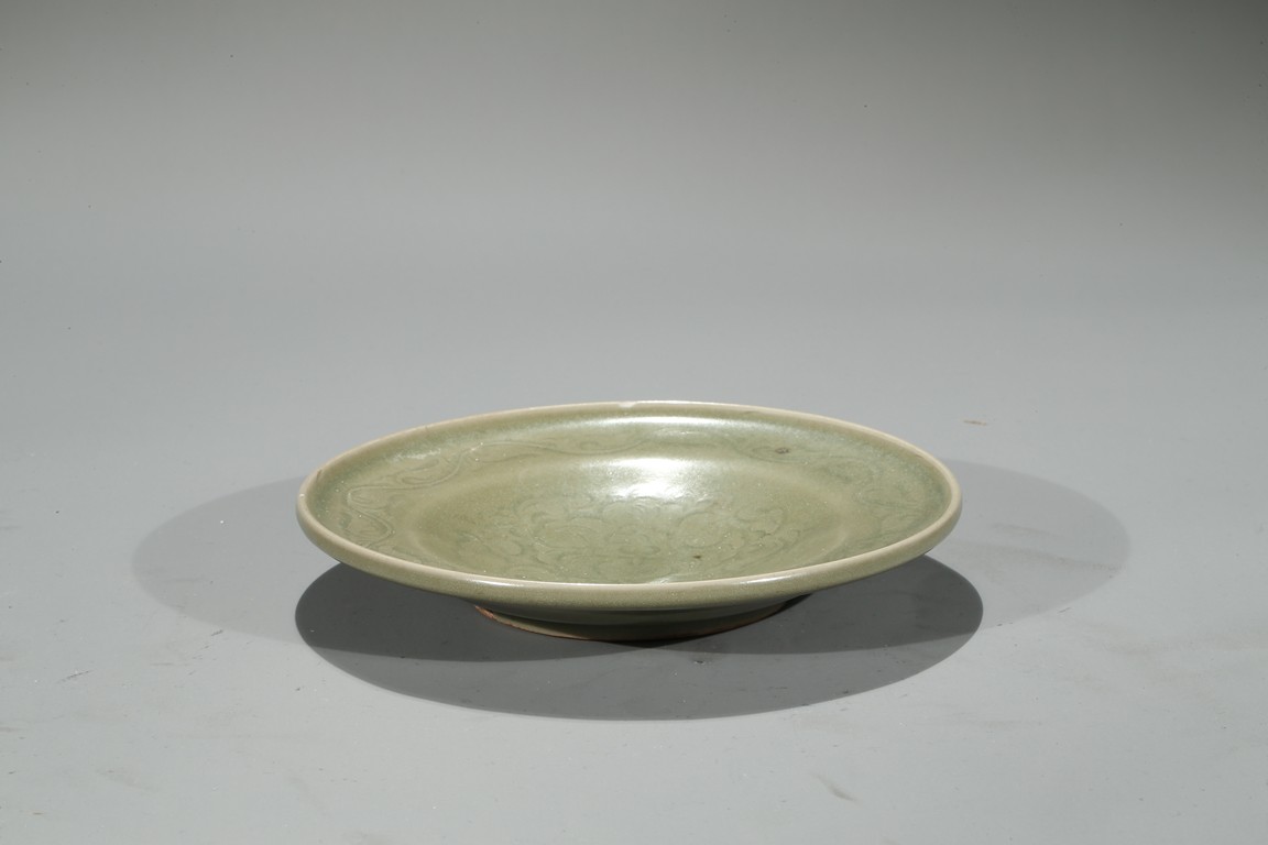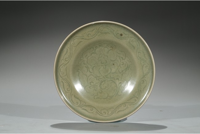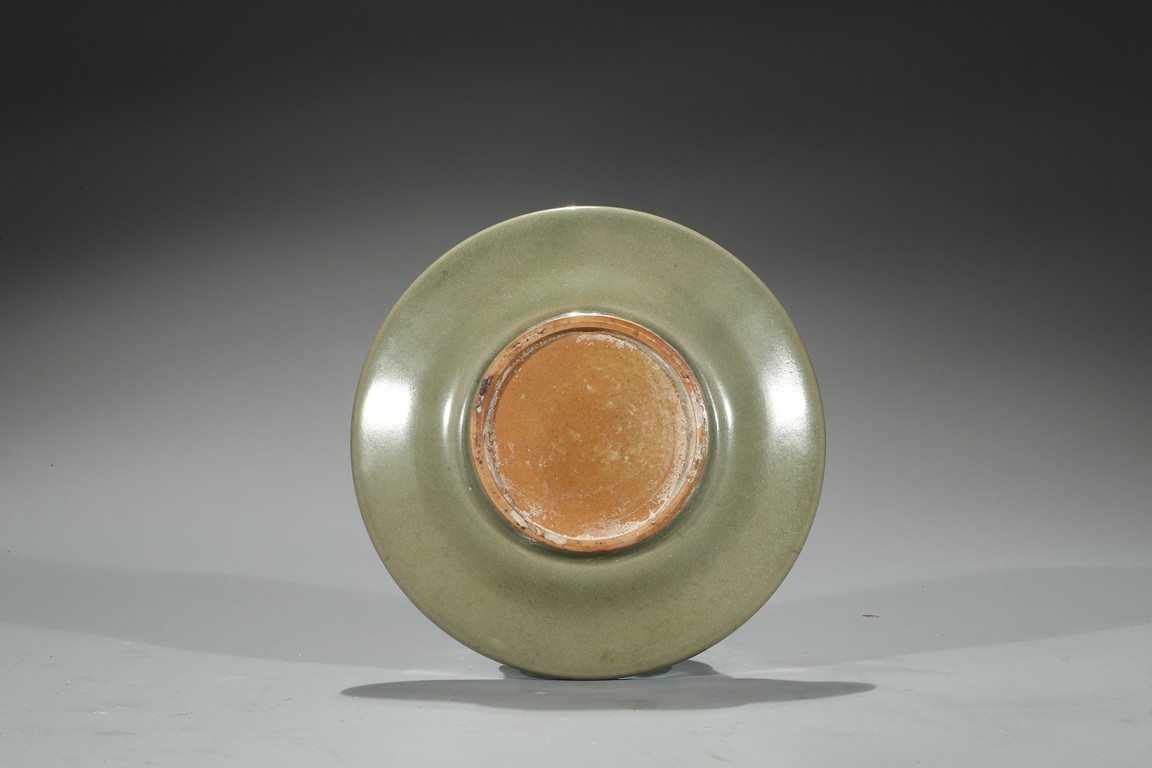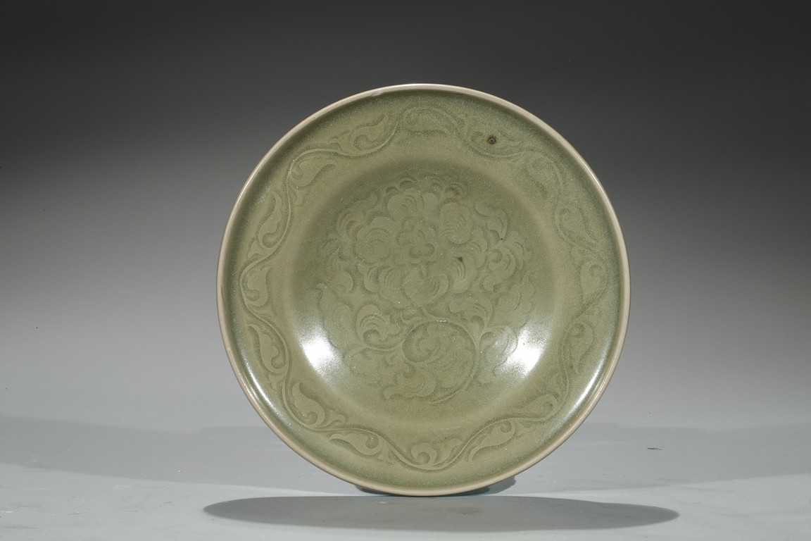 The interior moulded with a chrysanthemums wreathed by foliate scrolls, covered in an olive-green glaze. Song Dynasty period.