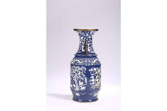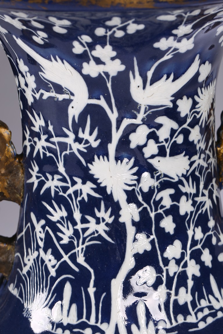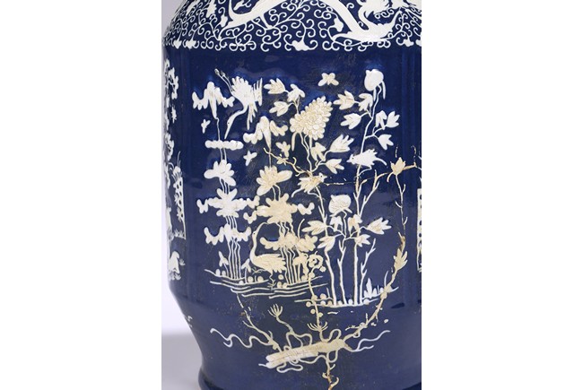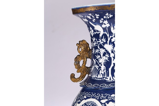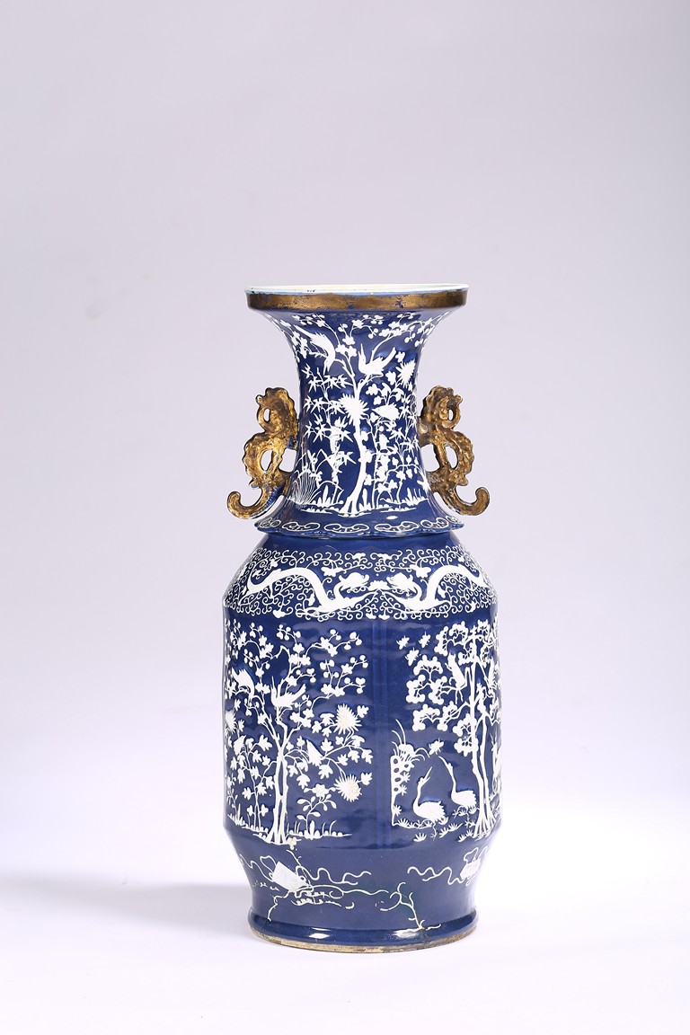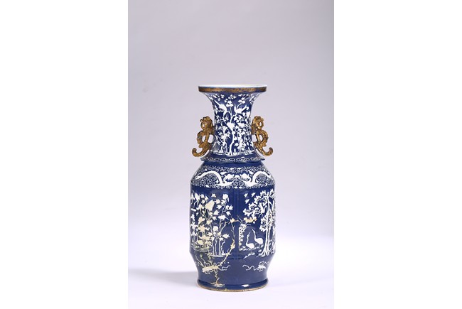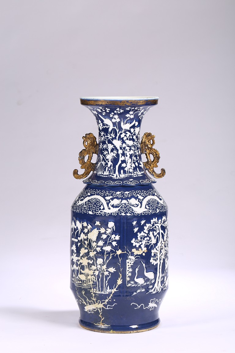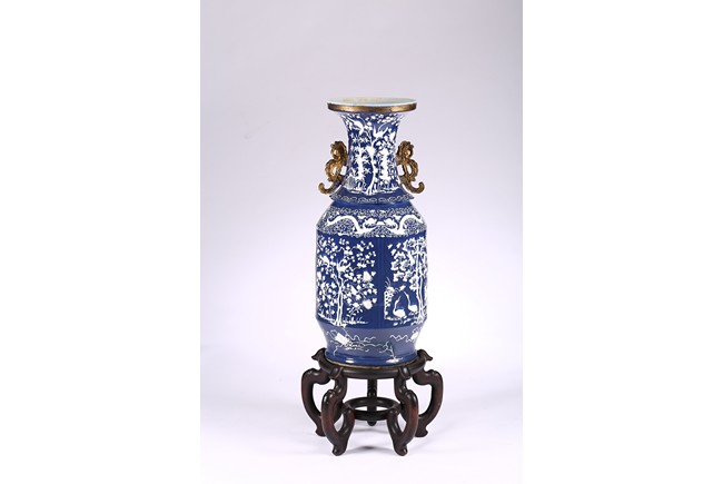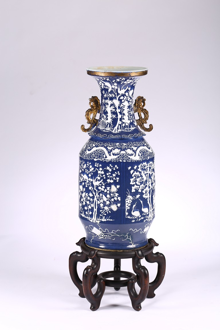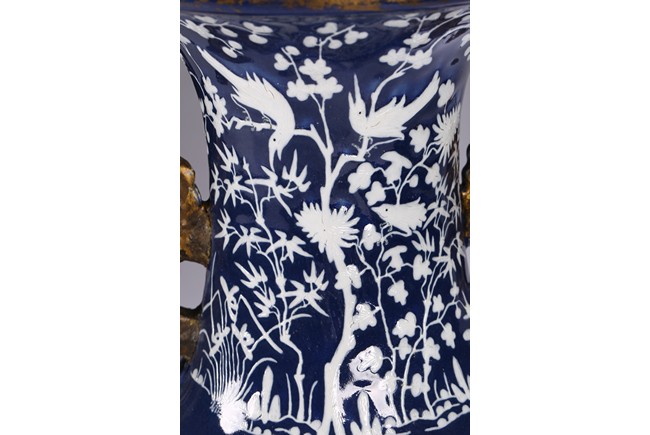 Of cylindrical form rising to a cylindrical neck with an everted mouth, the body finely decorated with scenes of birds and flowers below a band of sinous dragon traveling through floral scrolls, the neck further decorated with scene of various flowers and birds, flanked by a pair of gilt-painted handles, all reserved on blue ground. Accompanied with hardwood stand. Qing Dynasty period.