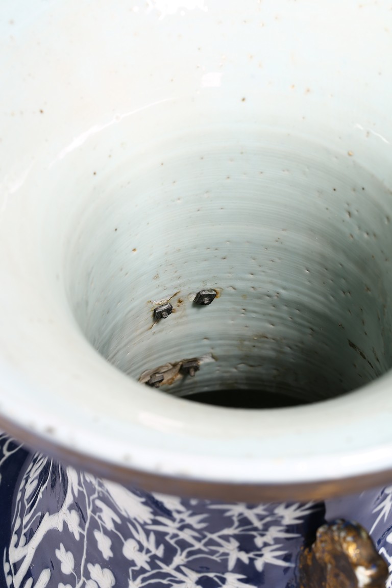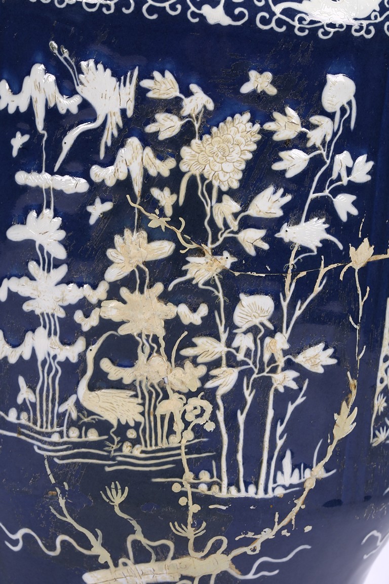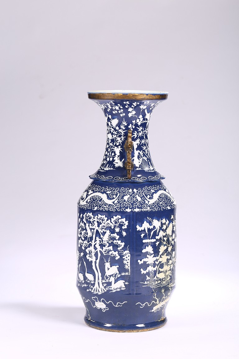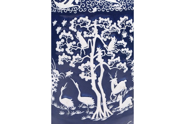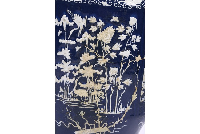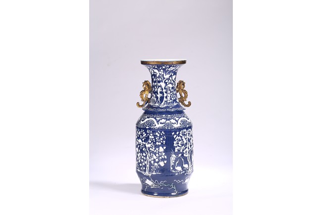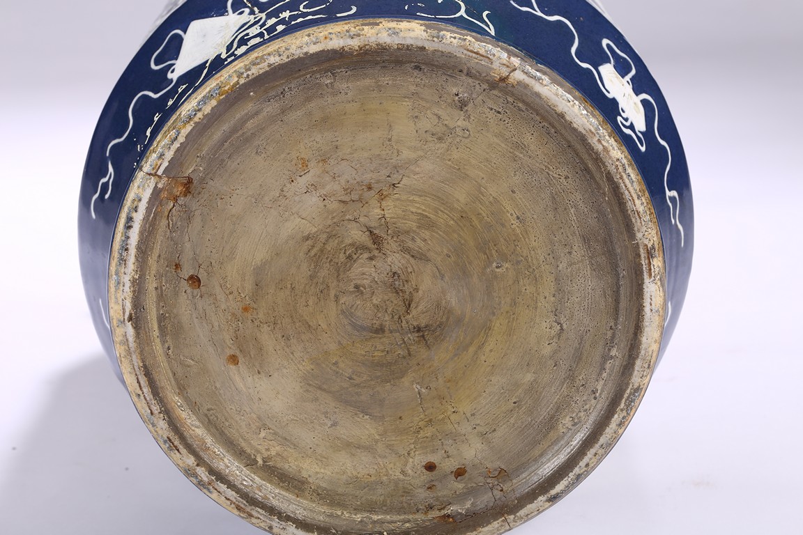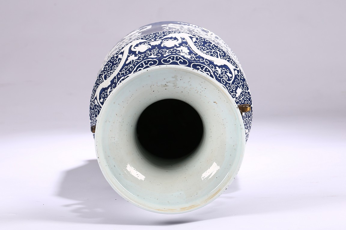 Of cylindrical form rising to a cylindrical neck with an everted mouth, the body finely decorated with scenes of birds and flowers below a band of sinous dragon traveling through floral scrolls, the neck further decorated with scene of various flowers and birds, flanked by a pair of gilt-painted handles, all reserved on blue ground. Accompanied with hardwood stand. Qing Dynasty period.