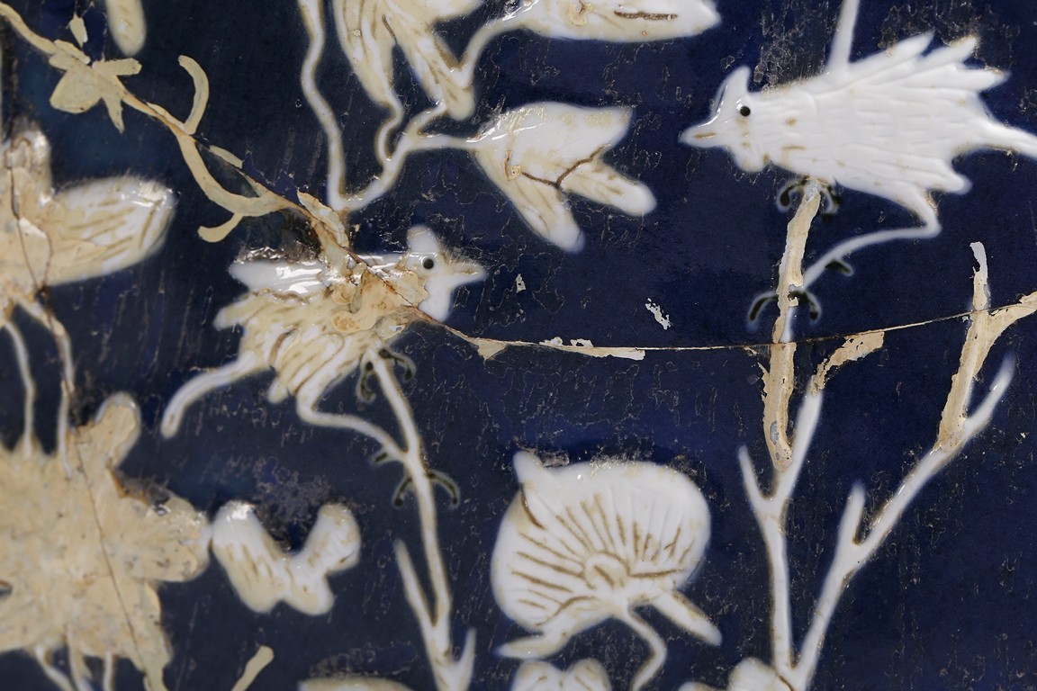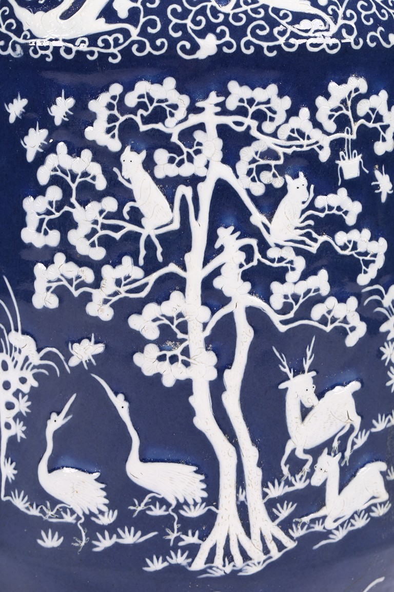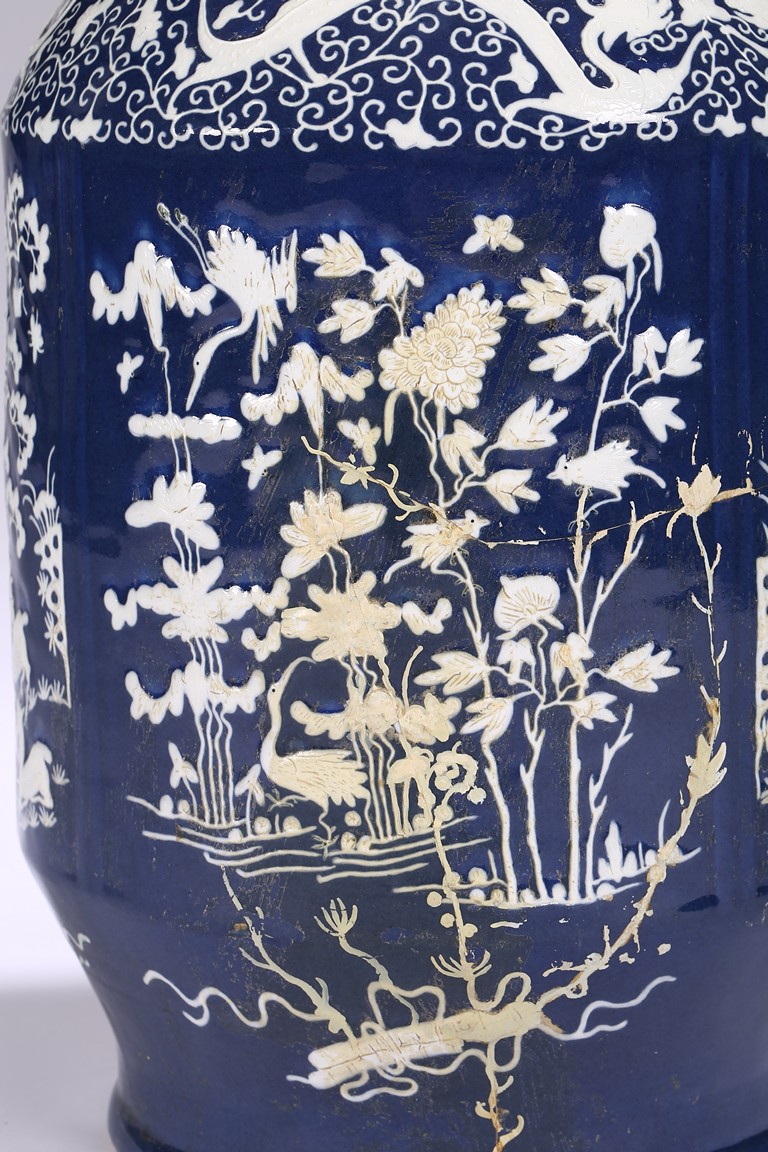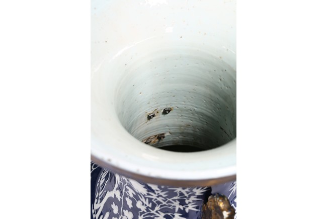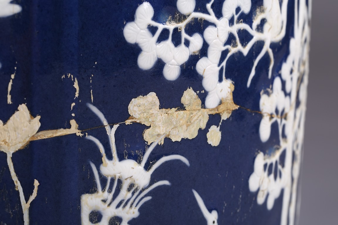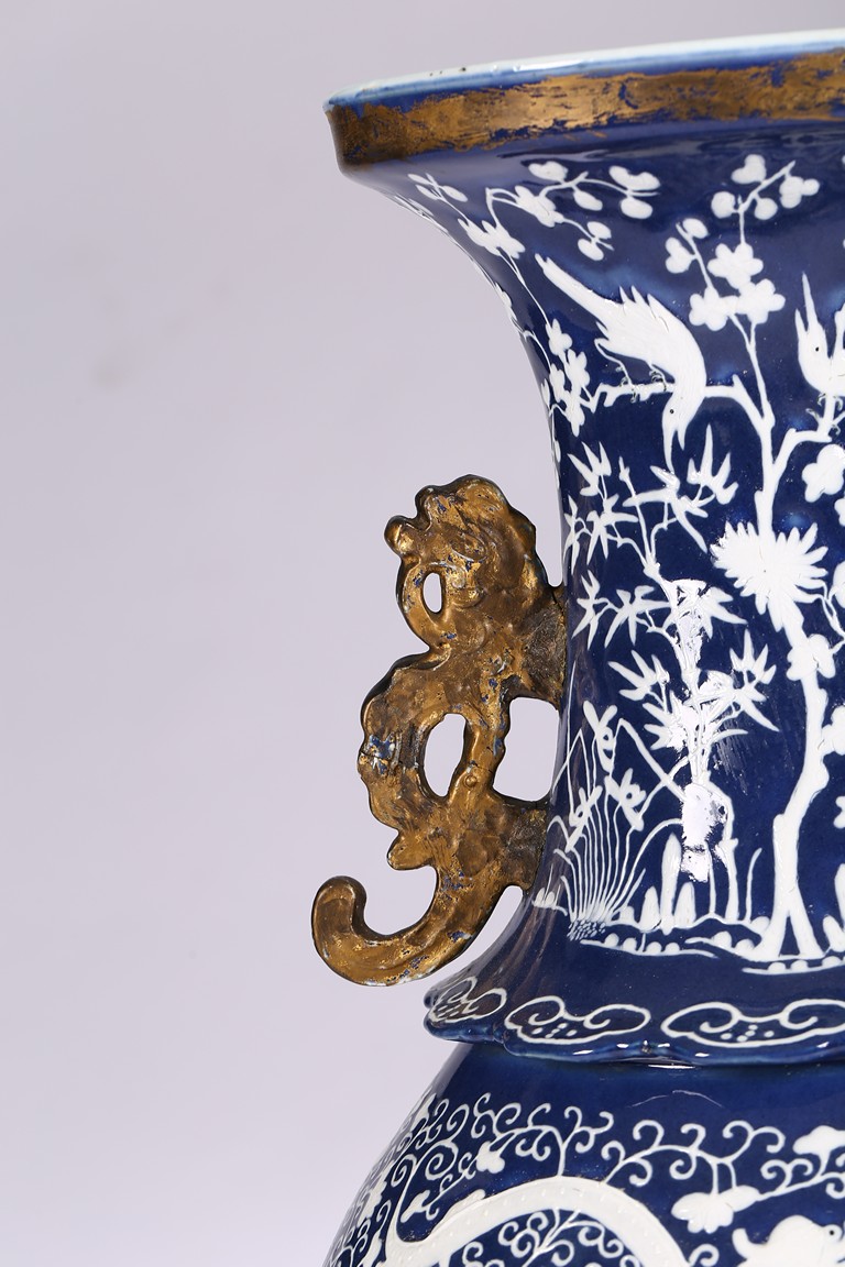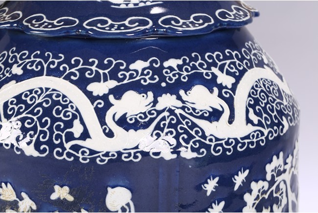 Of cylindrical form rising to a cylindrical neck with an everted mouth, the body finely decorated with scenes of birds and flowers below a band of sinous dragon traveling through floral scrolls, the neck further decorated with scene of various flowers and birds, flanked by a pair of gilt-painted handles, all reserved on blue ground. Accompanied with hardwood stand. Qing Dynasty period.
