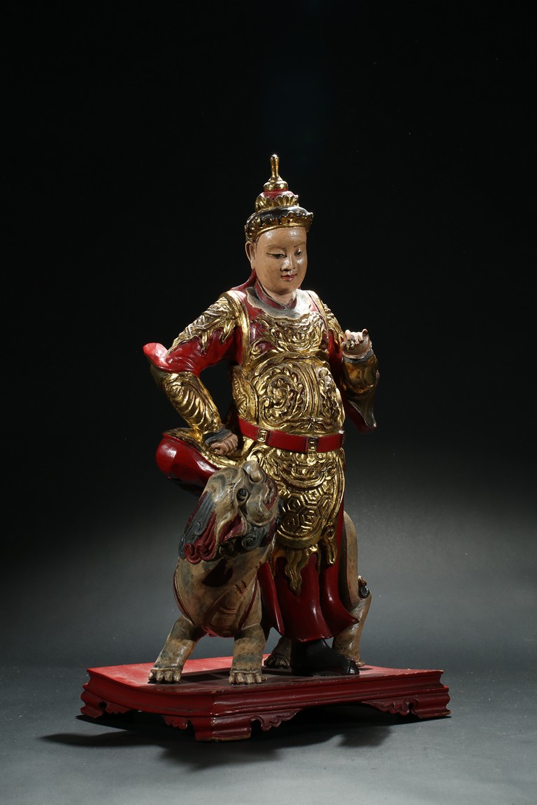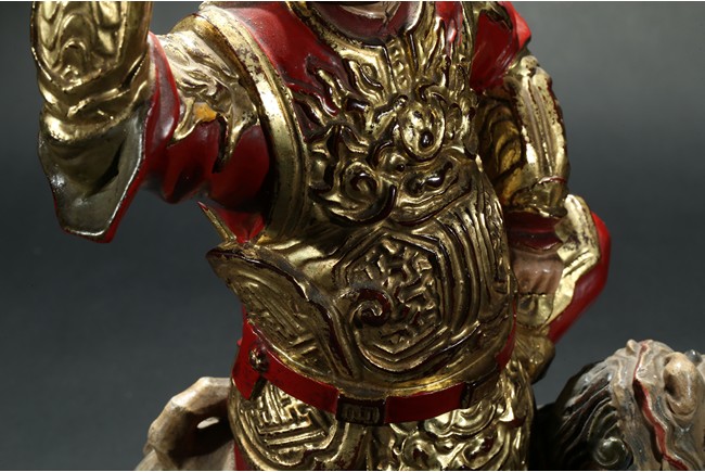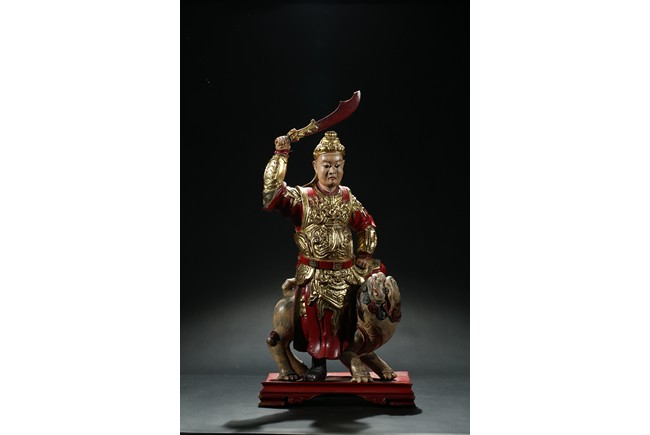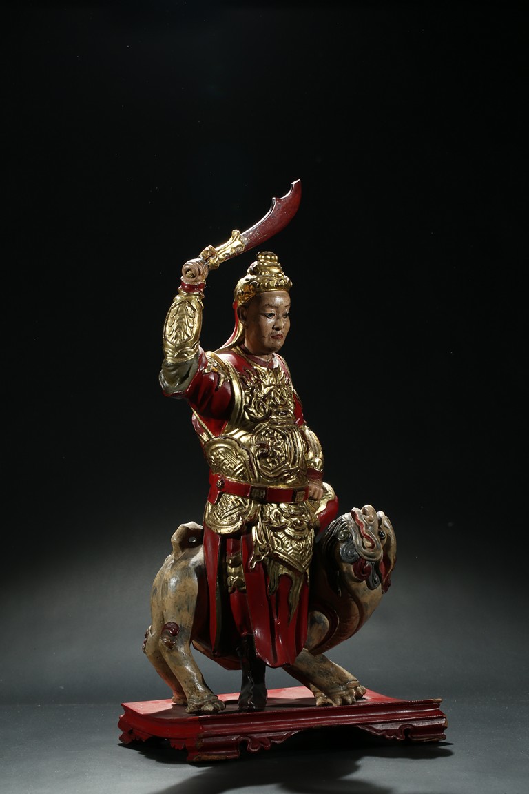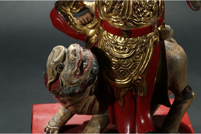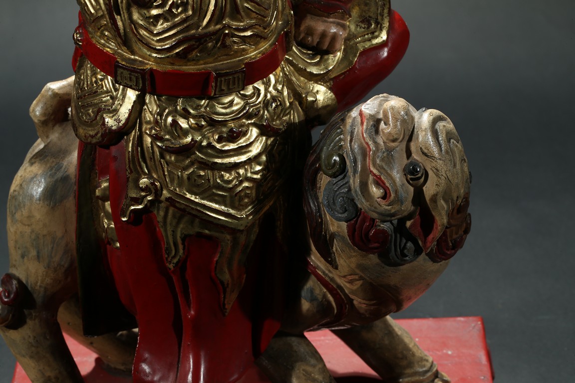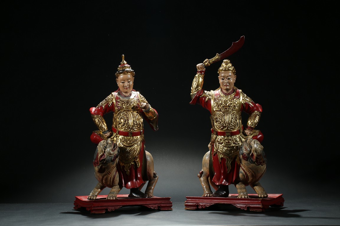 Each is carved seated upon a buddhist lion, wearing full armor and holding weapons, overall gilt and red lacquered, face with stern expression. Qing Dynasty period.