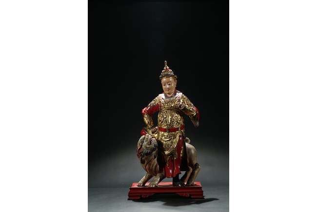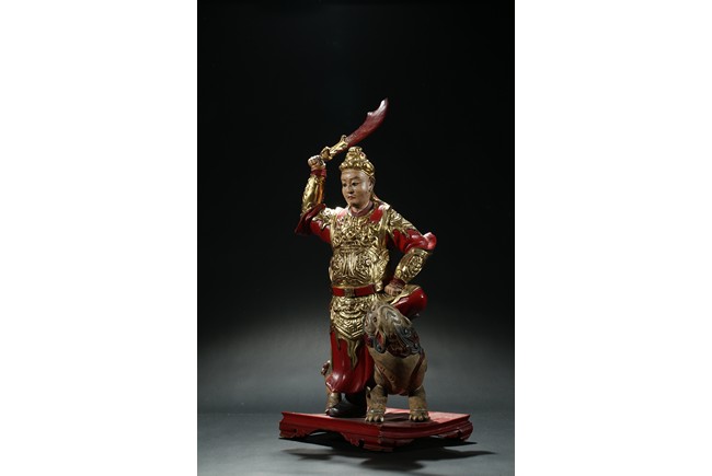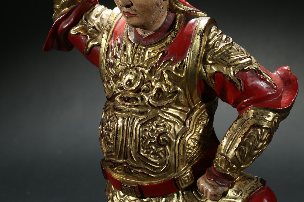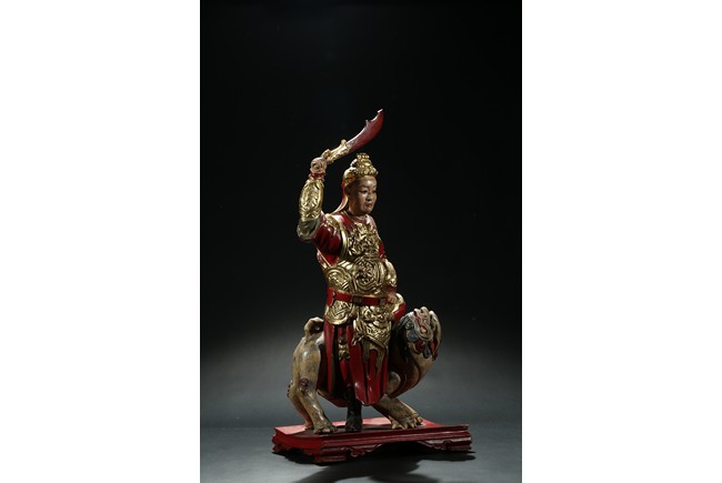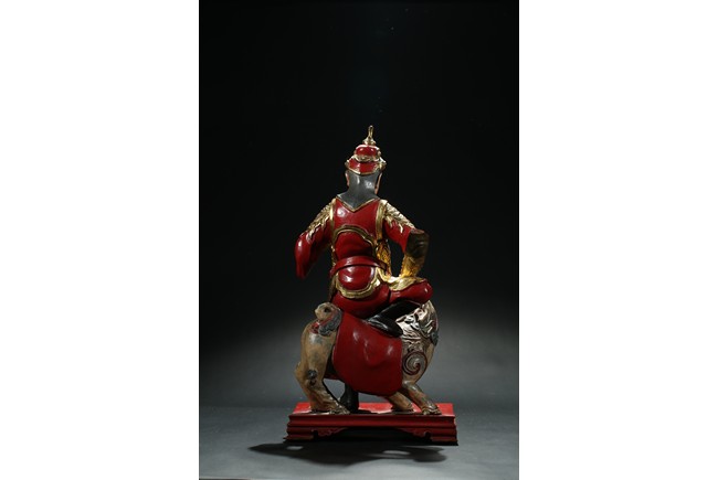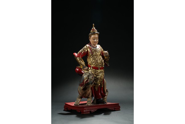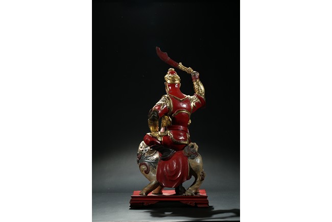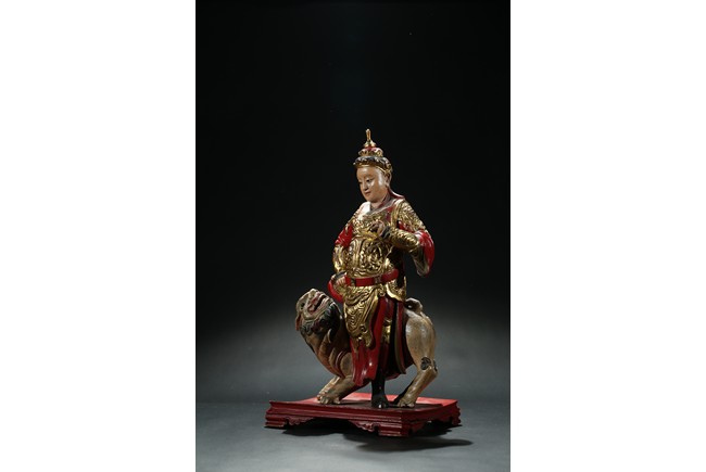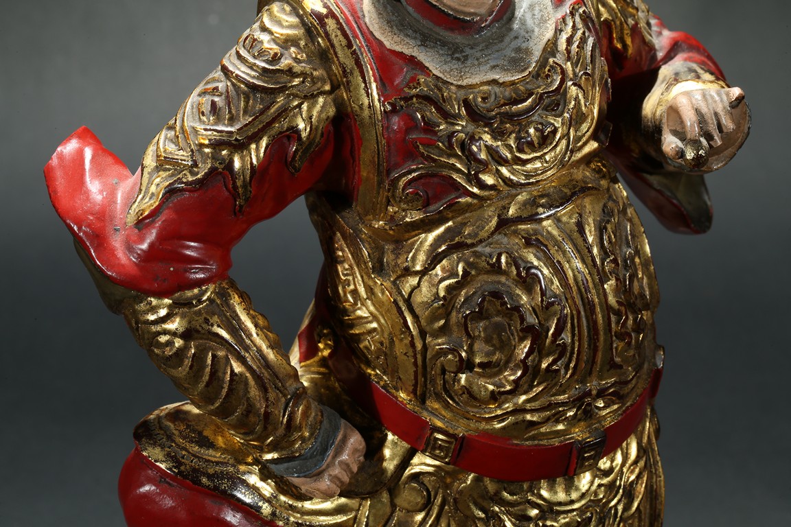 Each is carved seated upon a buddhist lion, wearing full armor and holding weapons, overall gilt and red lacquered, face with stern expression. Qing Dynasty period.