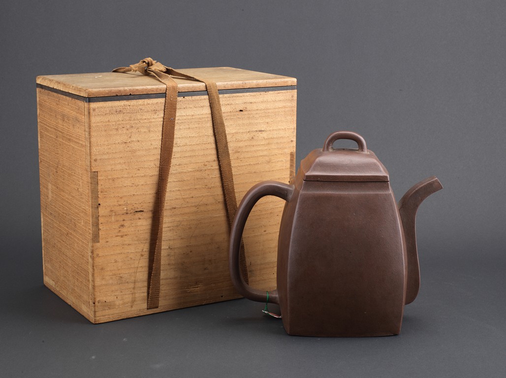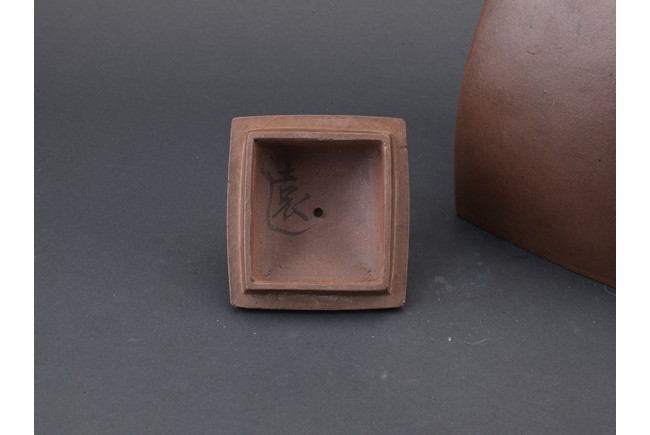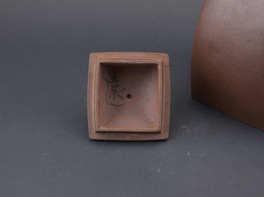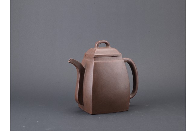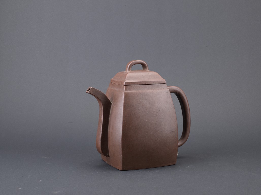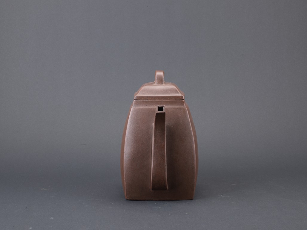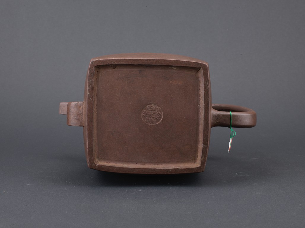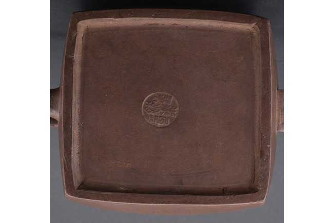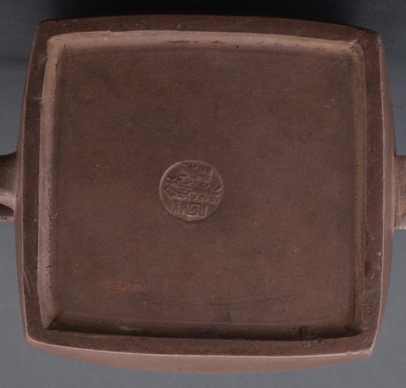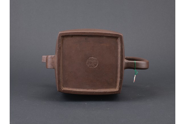 Of rectangular section, with deep curved sides rising to a short neck, set with a curved spout opposite a C-shaped handle, the domed cover surmounted by a loop, the base impressed with a square mark. Qing Dynasty period.