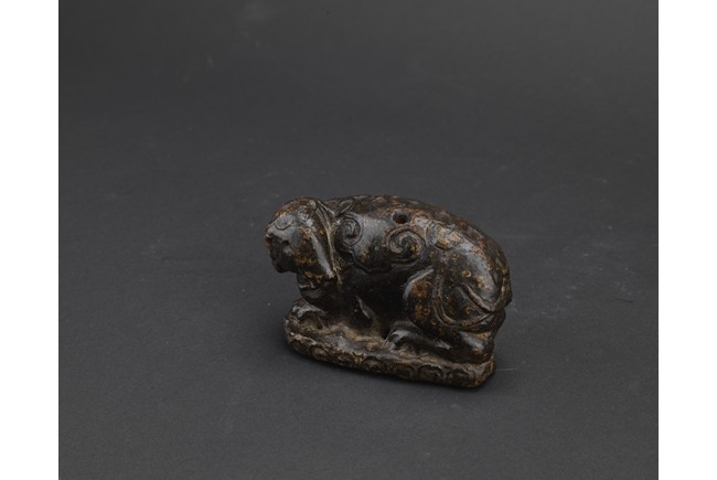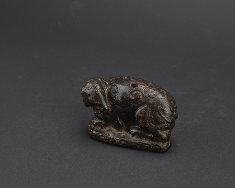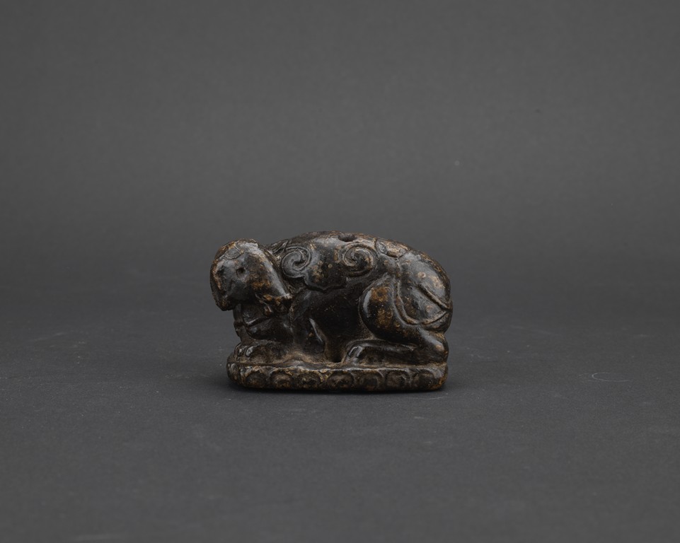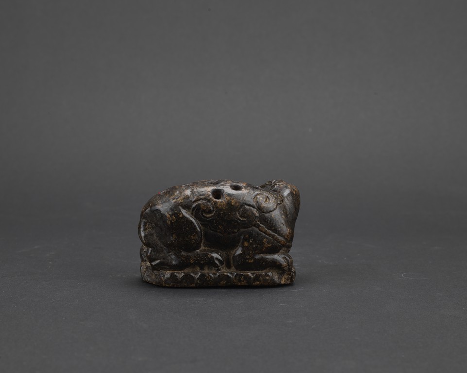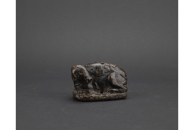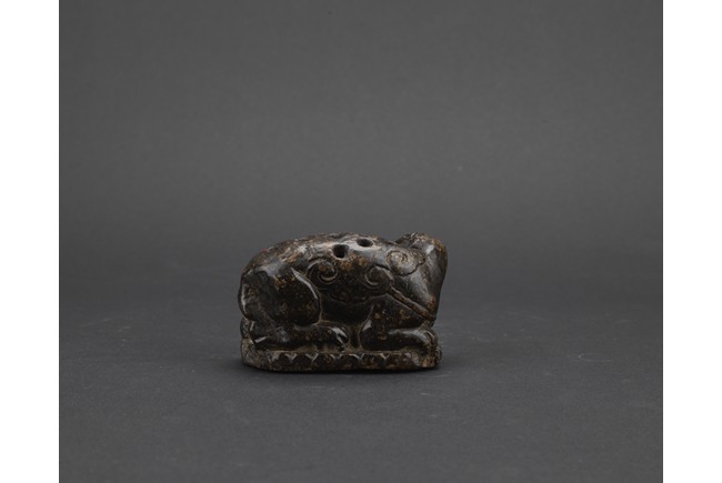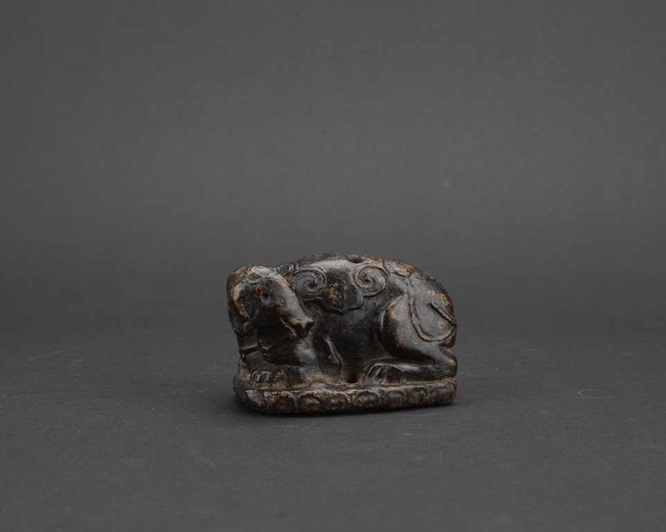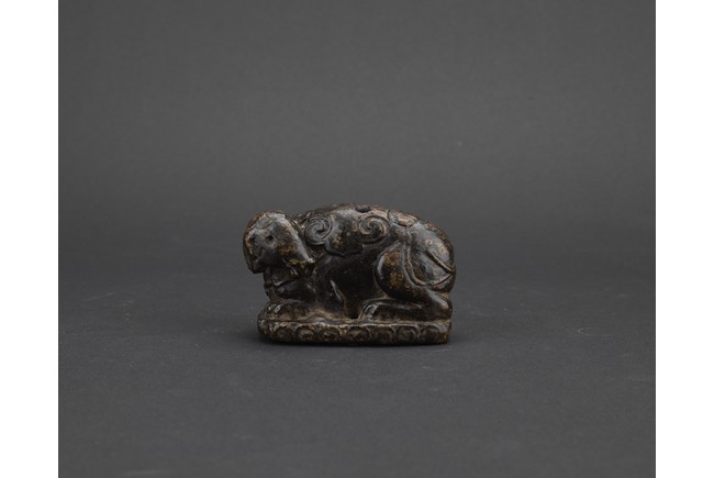 Carved in the form of a recumbent elephant on lotus base with head turned to one side, back carved with a hole. Song Dynasty period.