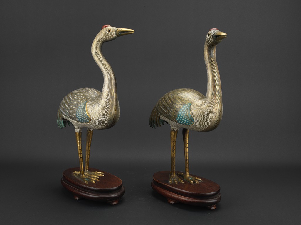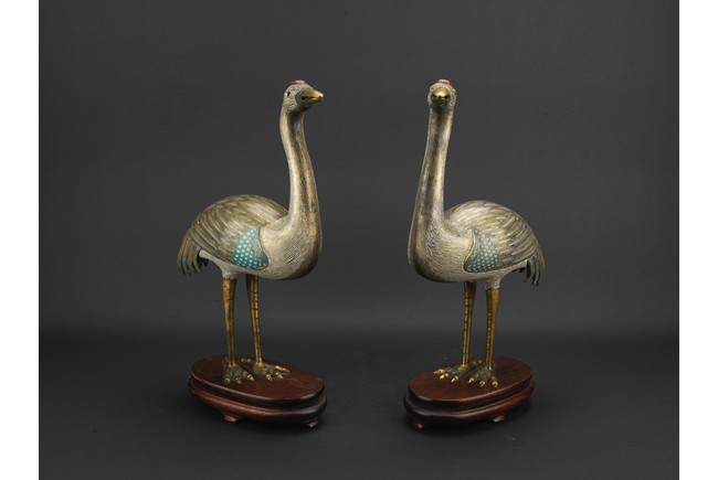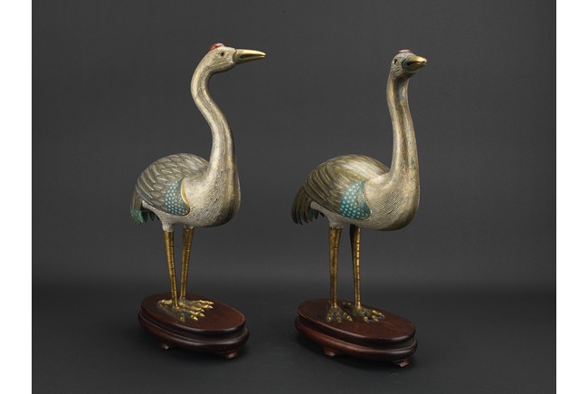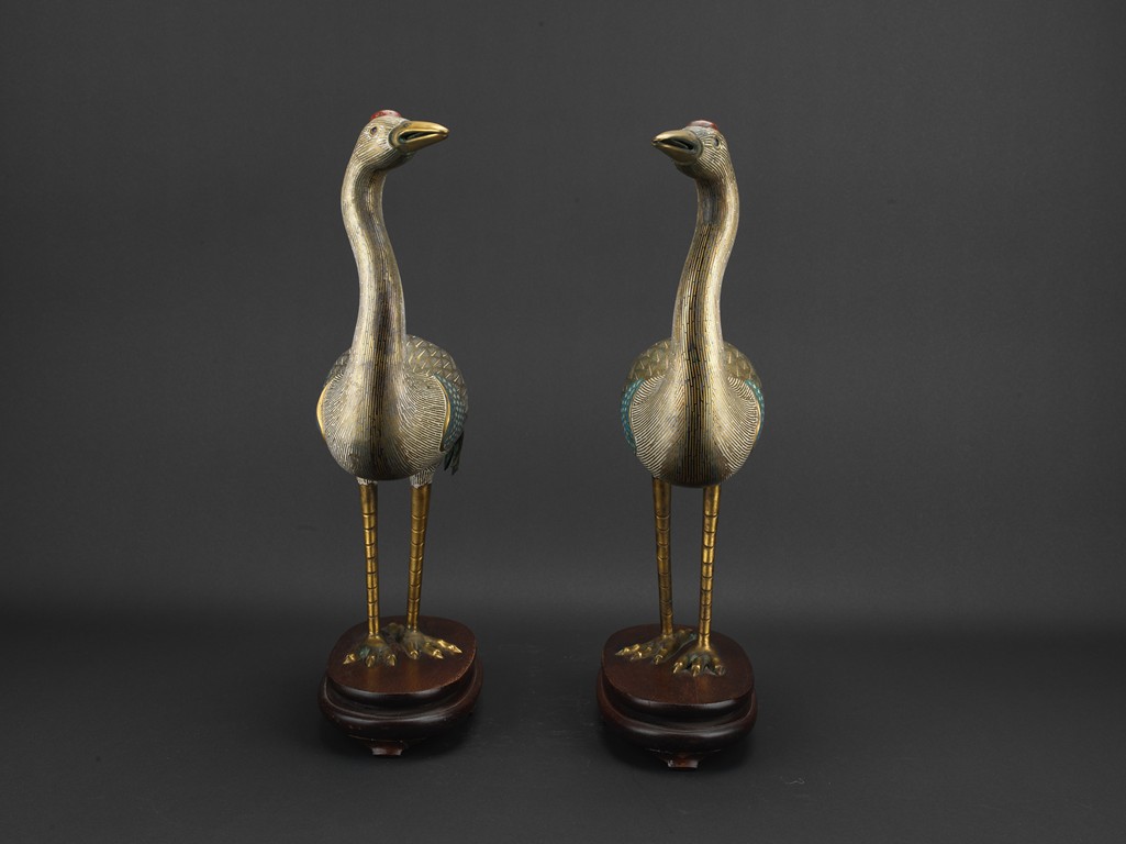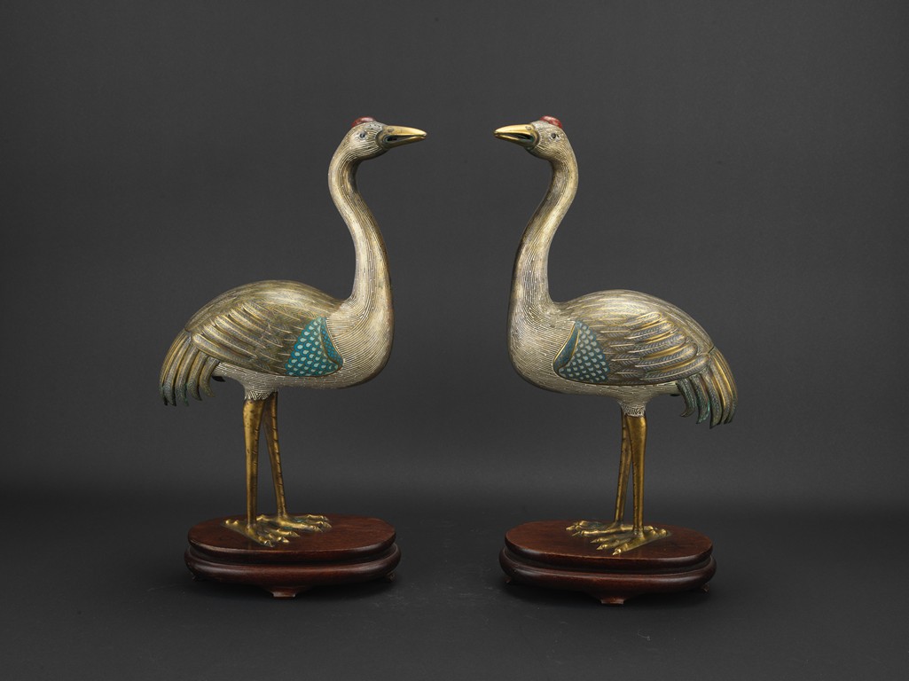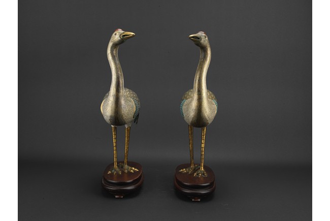 Each crane supported on a wood base, the body enamelled in creamy white with feathers intricately outlined , its long slender neck gracefully curved in an 'S'-shaped with head raised high, detailed with expressive eyes and a beak. Qing Dynasty period.