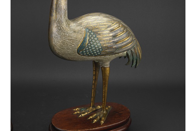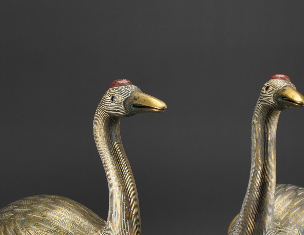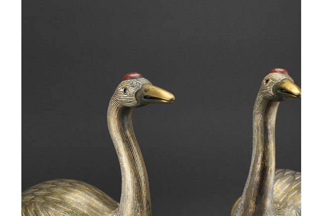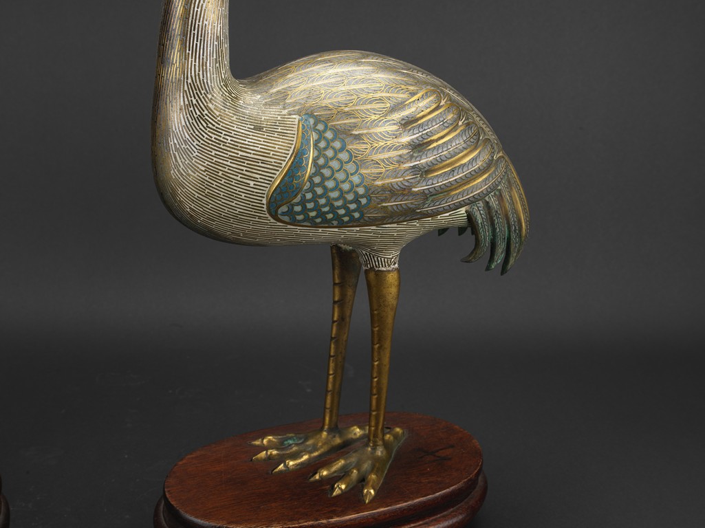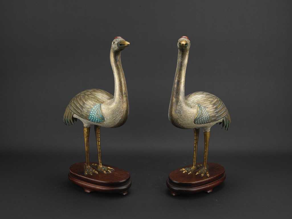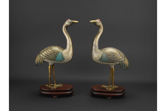 Each crane supported on a wood base, the body enamelled in creamy white with feathers intricately outlined , its long slender neck gracefully curved in an 'S'-shaped with head raised high, detailed with expressive eyes and a beak. Qing Dynasty period.