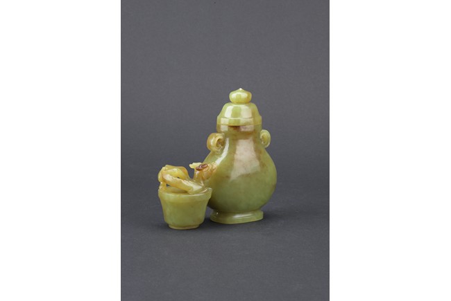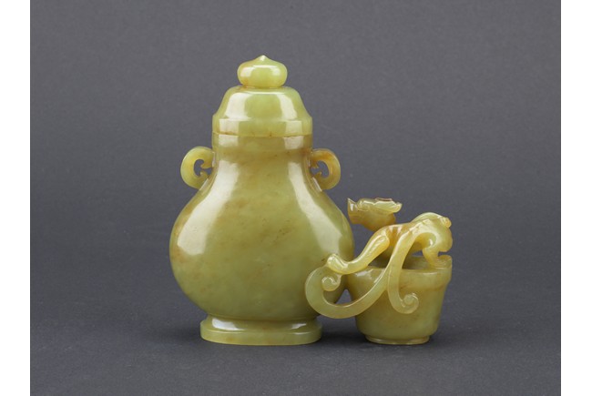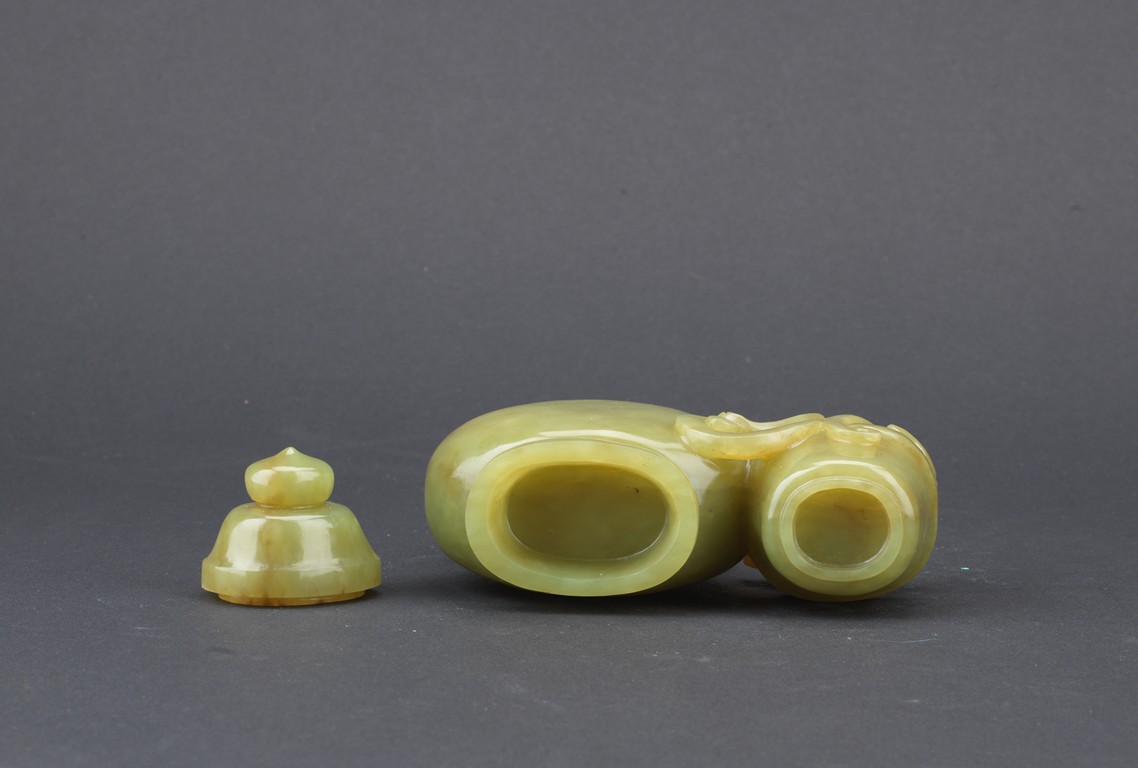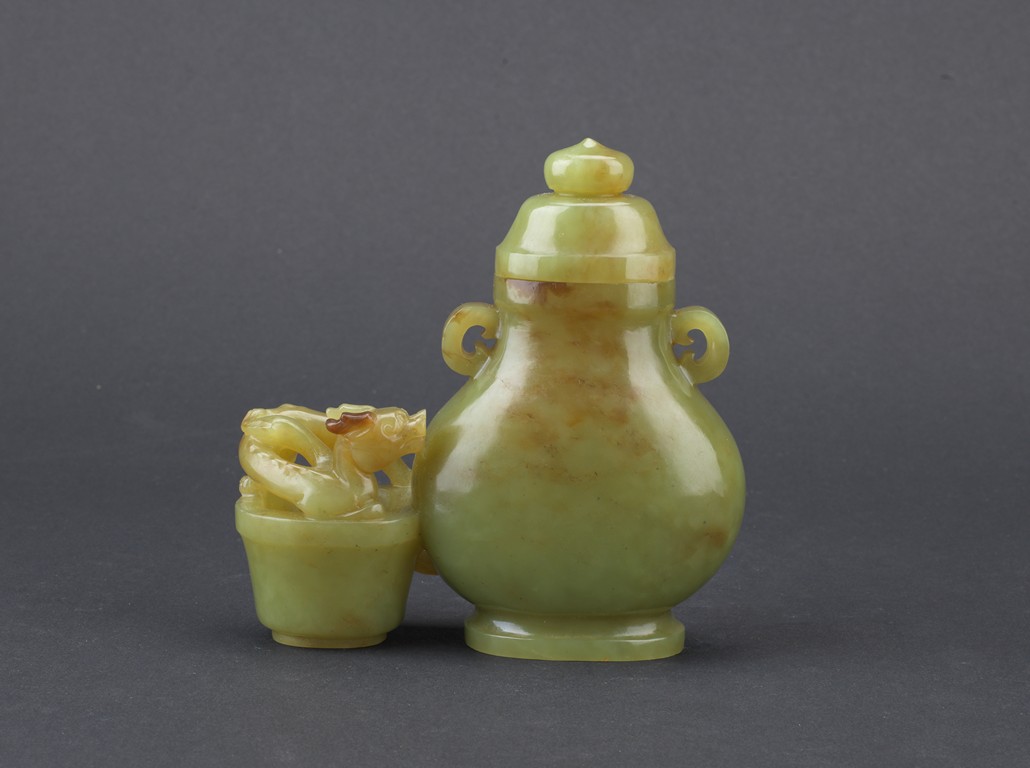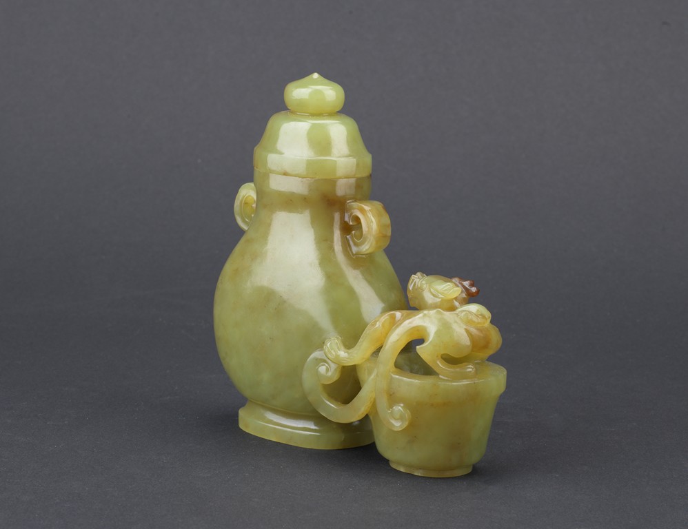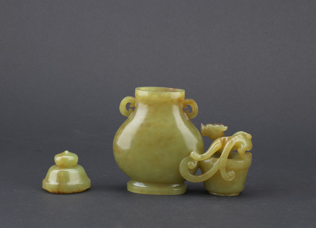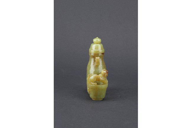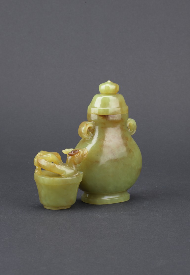 Carved as a baluster vase with two small loop handles, with domed cover and surmounted with a knop finial, the body joined with a smaller vessel with a sinuous chilong clambering on top, the stone is of greenish yellow tone with minor russet inclusions. Mid Qing Dynasty period.