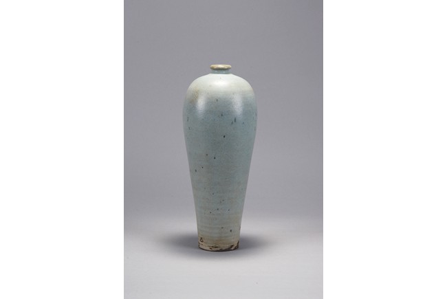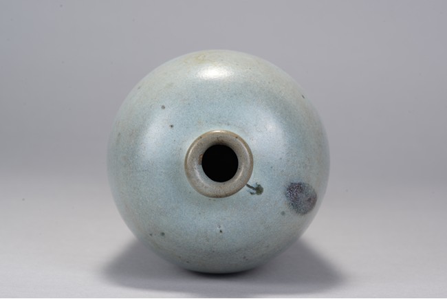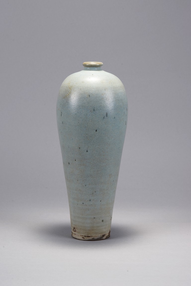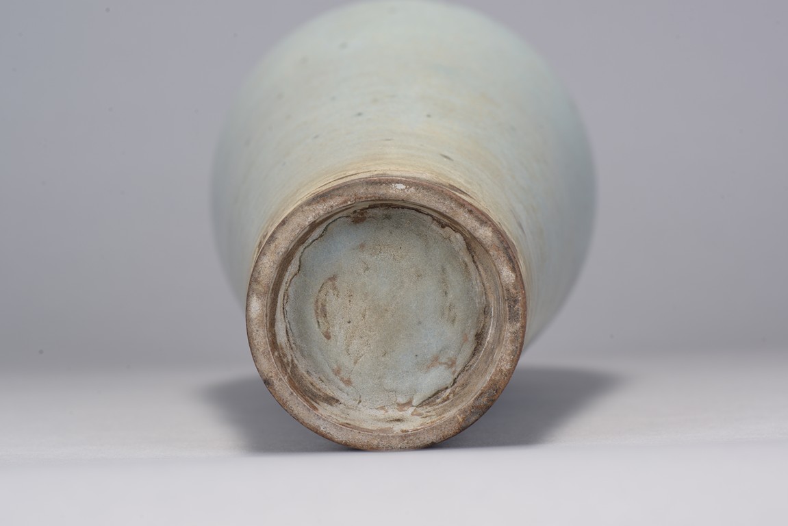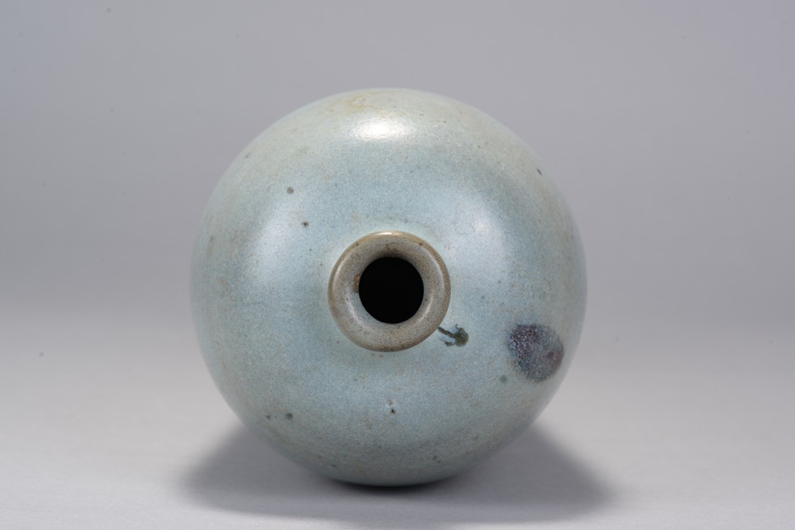鈞瓷乃宋代五大名窯瓷器之一,素有“黃金有價鈞無價”和“家有萬貫,不如鈞瓷一件”之稱。此件梅瓶小唇口外翻式,短頸,豐肩,器身由粗至細逐漸內收,整器施淡青色釉,釉層肥厚,並有紫色斑痕點綴其間,相容自然,和諧雅緻。明人言:“鈞州窯,紅若胭脂者為最,青若蔥翠色,紫若黑色者次之”。器形挺拔秀麗,端莊典雅。此種靛青釉色清新淡雅又不失端莊典雅。通體素色,無任何紋飾,造型秀麗規整,間潔肅穆,古韻十足。