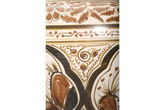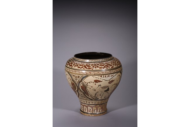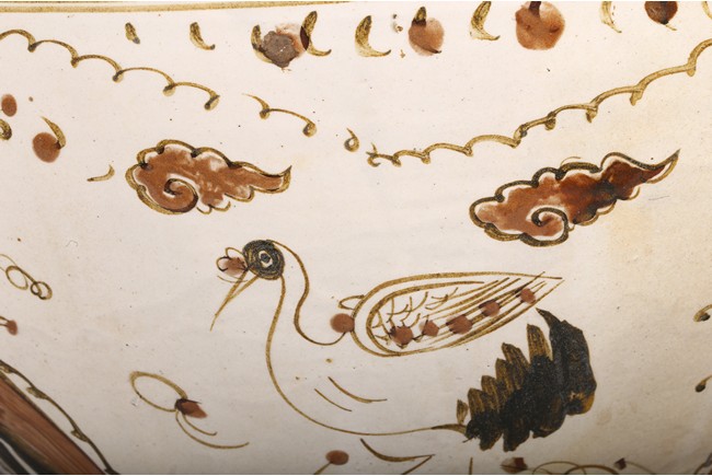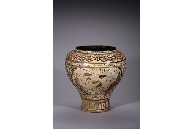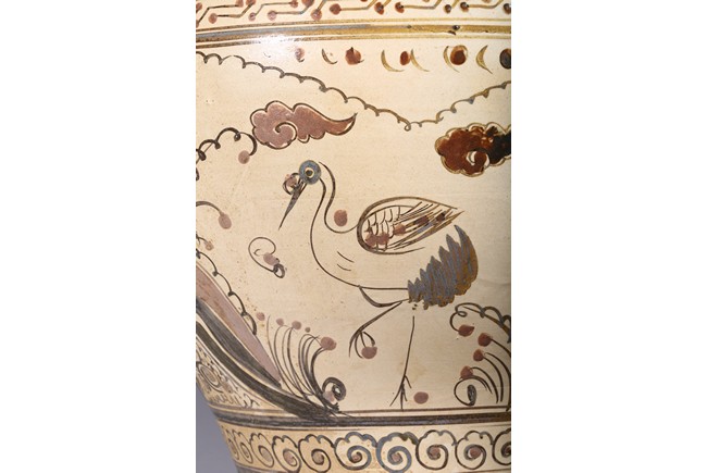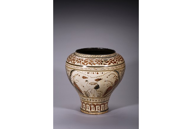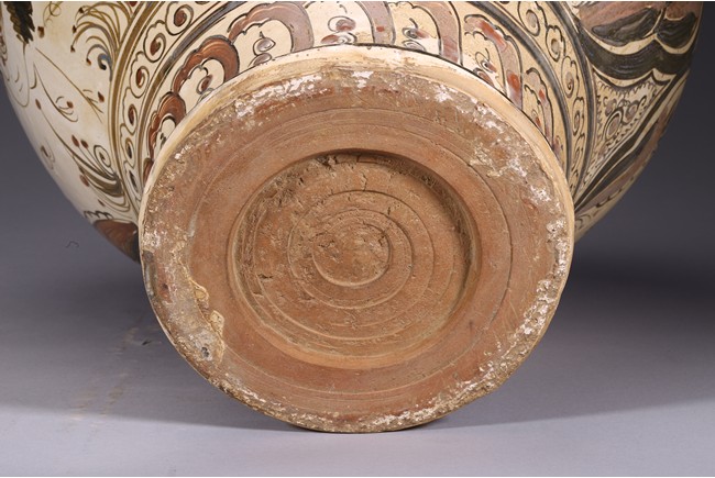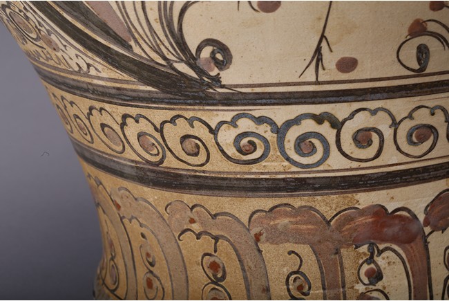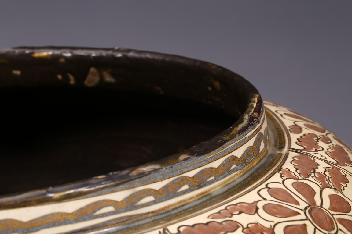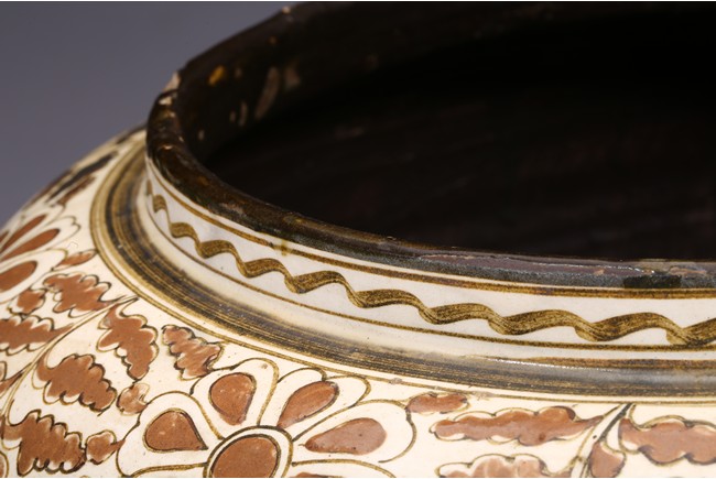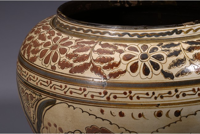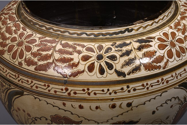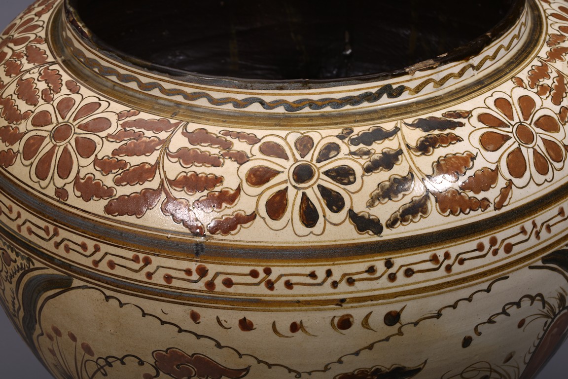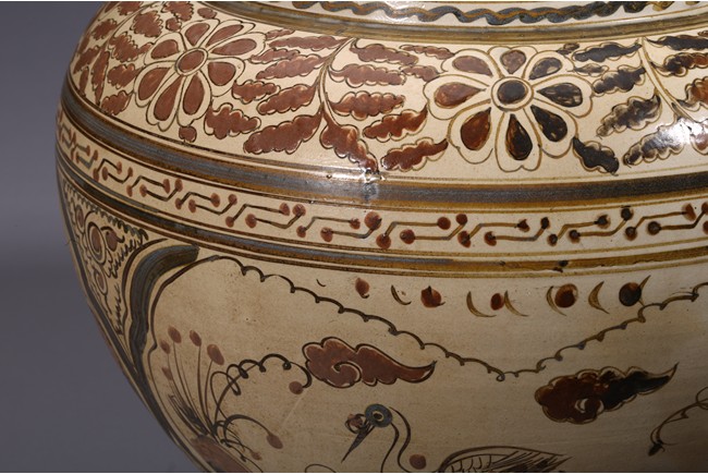 此件磁州窯大罐,器形碩大,線條極其優美,大口,溜肩,下漸收斂,器形飽滿,周正挺拔。器底露胎,質地周密。施黑彩花卉紋、蓮瓣紋、仙鶴紋、卷草紋。整體紋飾一氣呵成,生動自然,毫無刻意造作氣象。整體器形身姿挺拔,線條流暢,製作精美,讓人陶醉於其精湛的技藝。