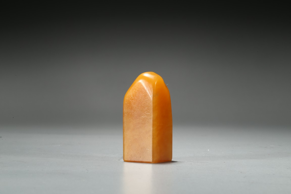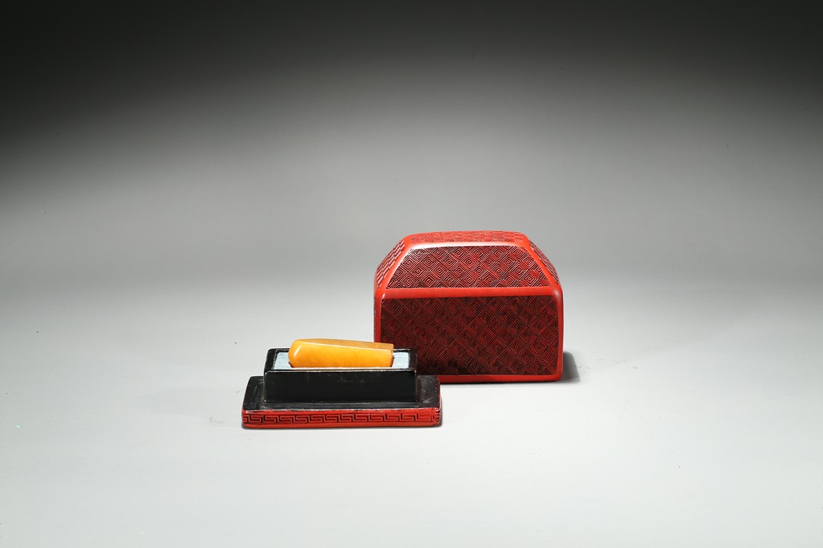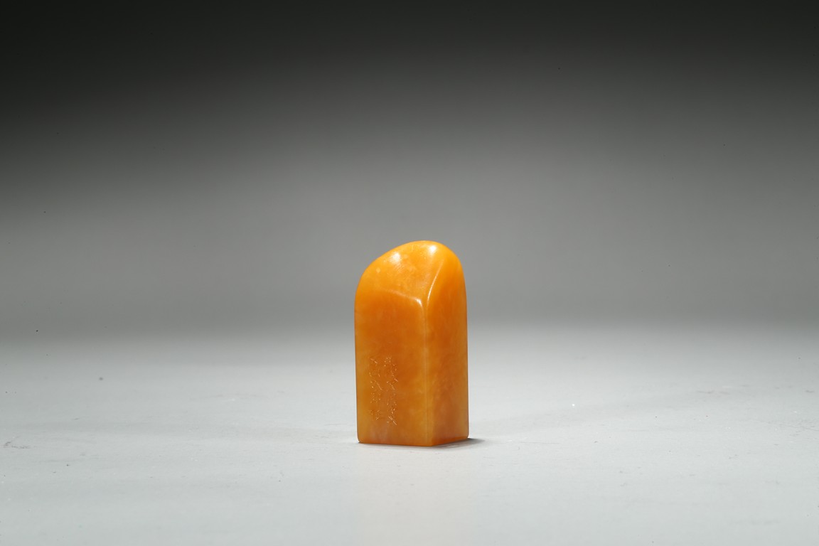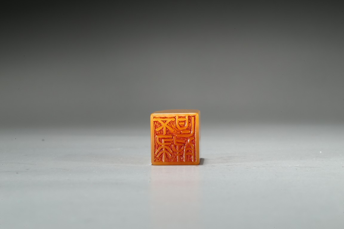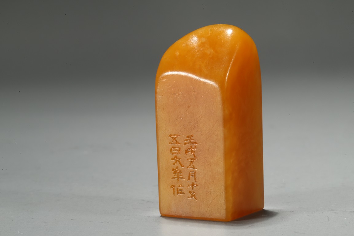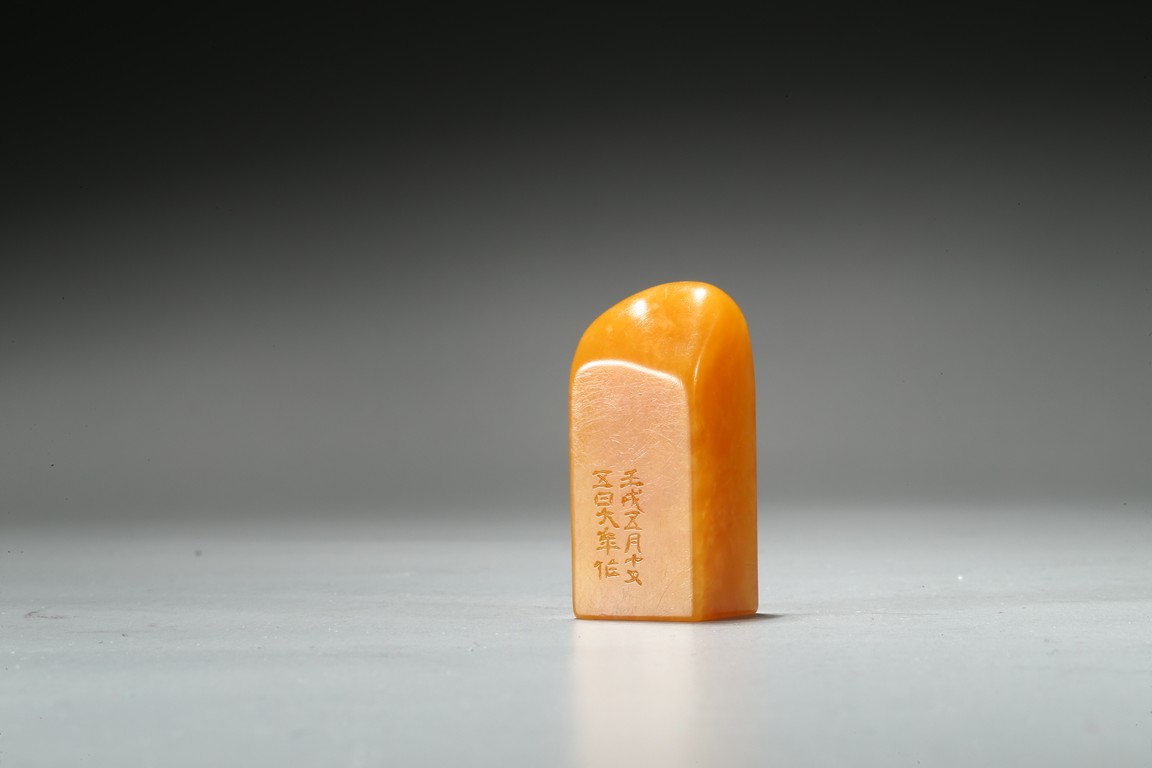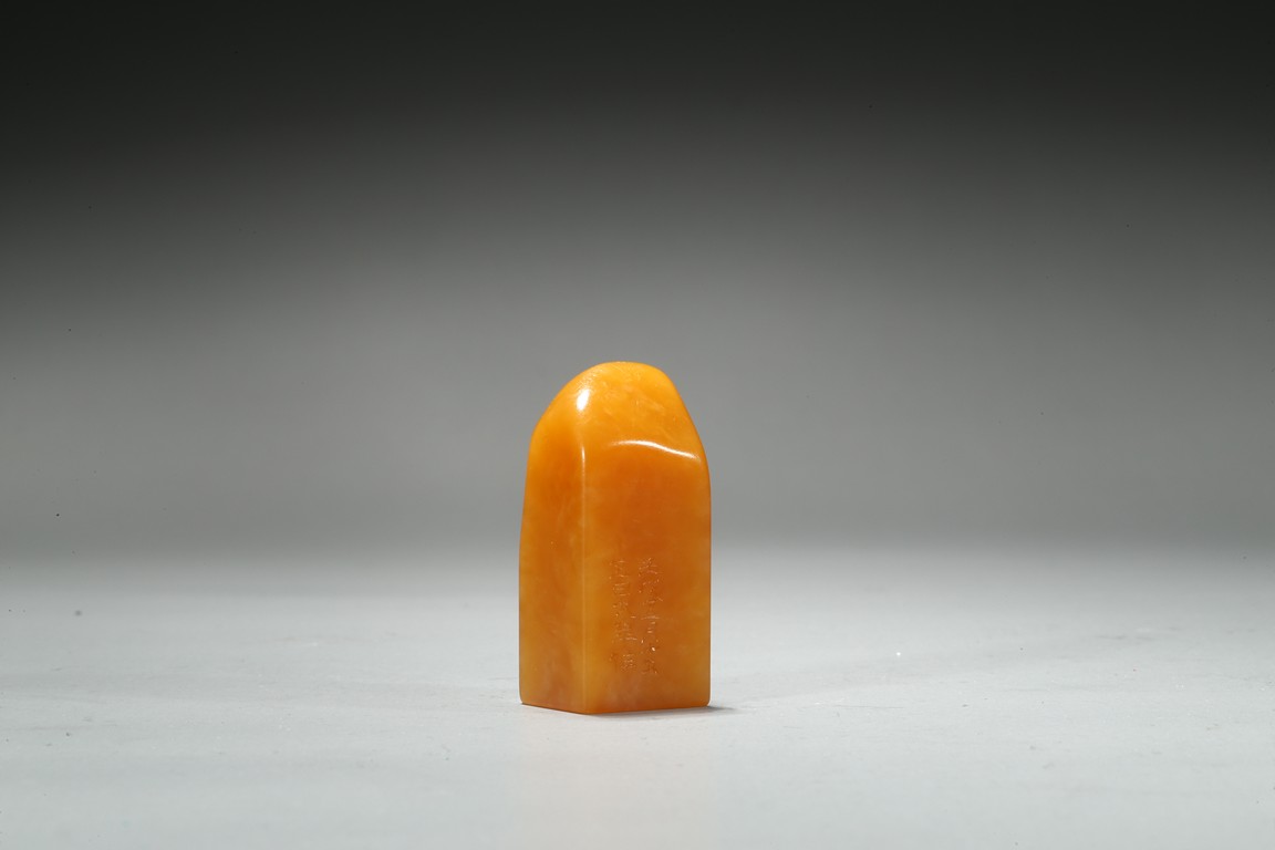 The columnar square-sectioned tianhuang seal with inscription to the body, the seal face carved with four character inscription, the stone is of warm yellowish-orange tone. Accompanied with a cinnabar lacquer box and cover. Qing Dynasty period.