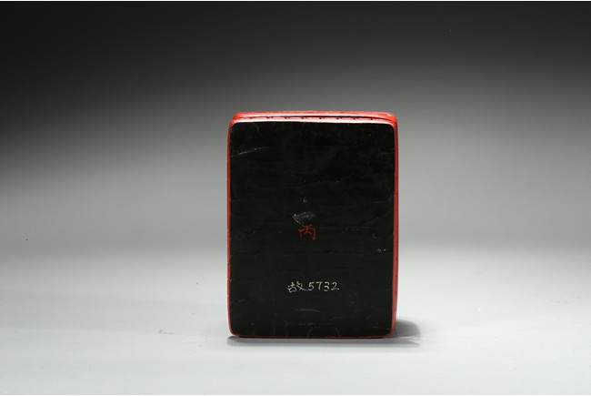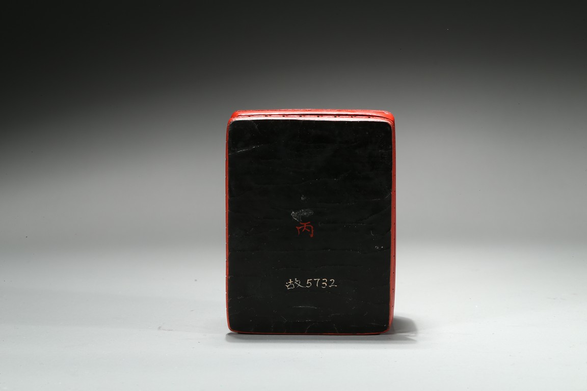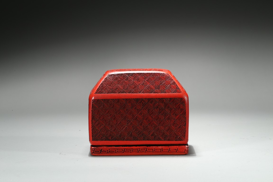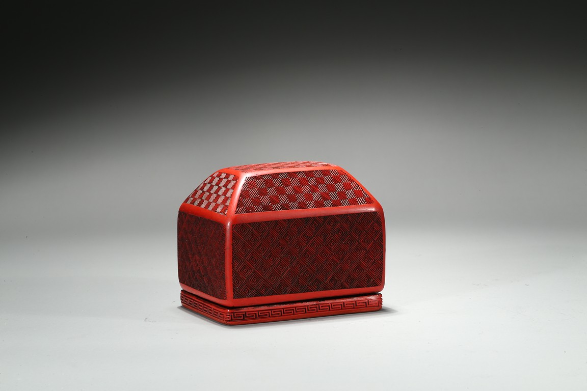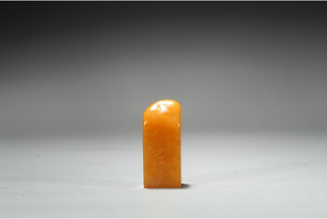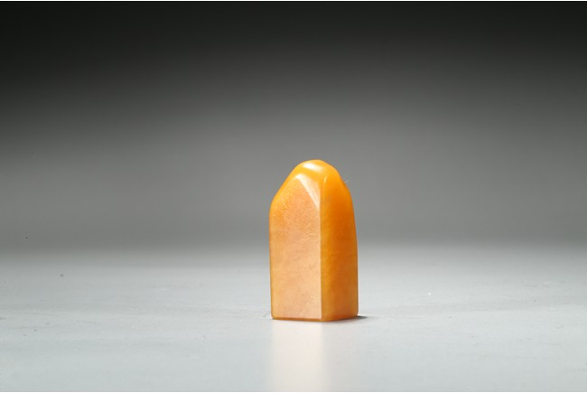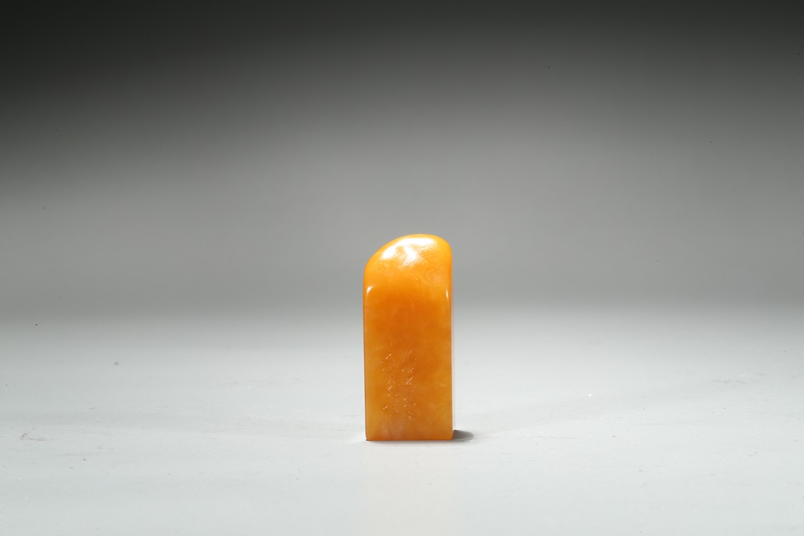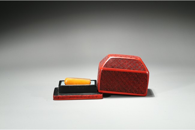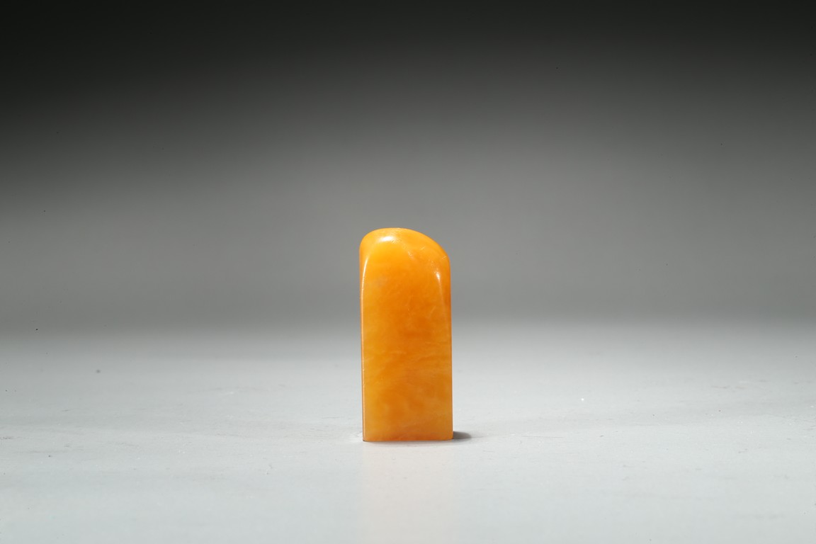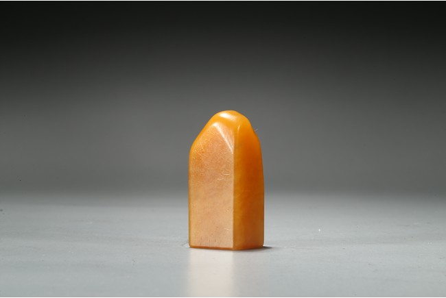 The columnar square-sectioned tianhuang seal with inscription to the body, the seal face carved with four character inscription, the stone is of warm yellowish-orange tone. Accompanied with a cinnabar lacquer box and cover. Qing Dynasty period.
