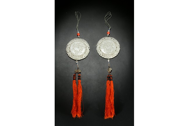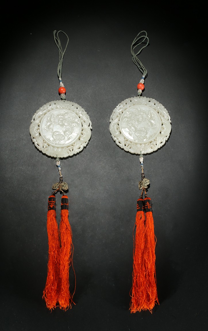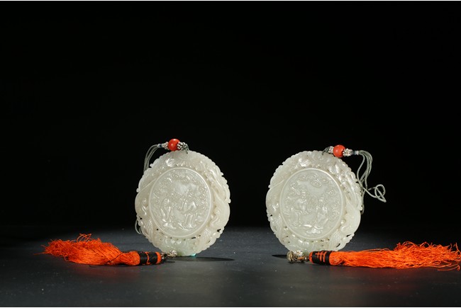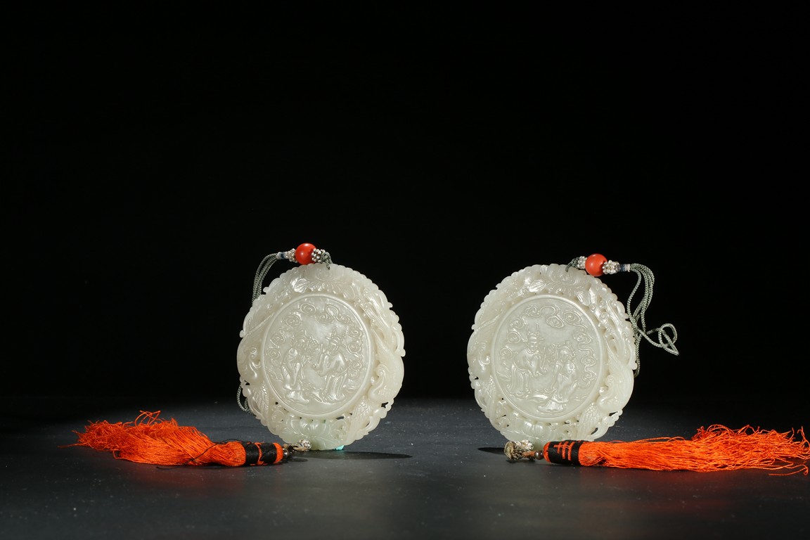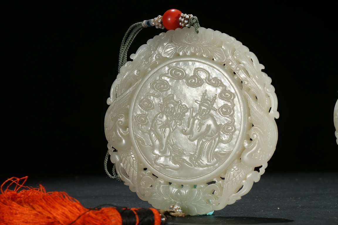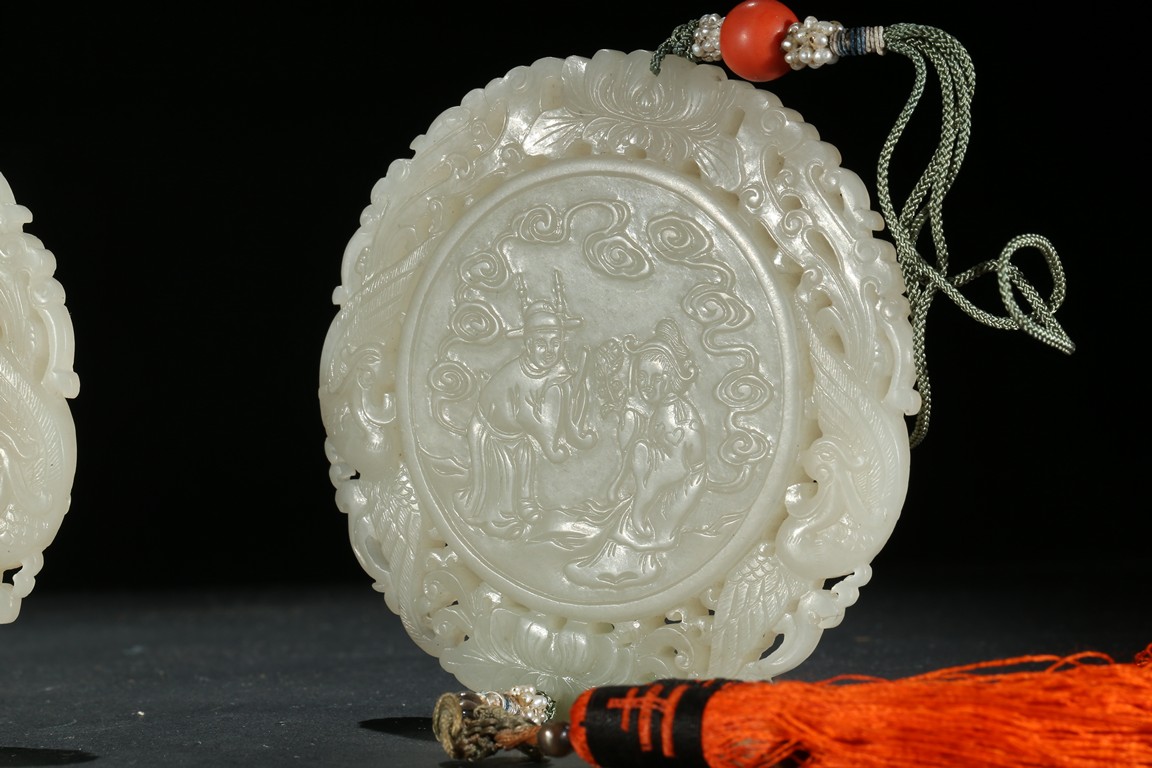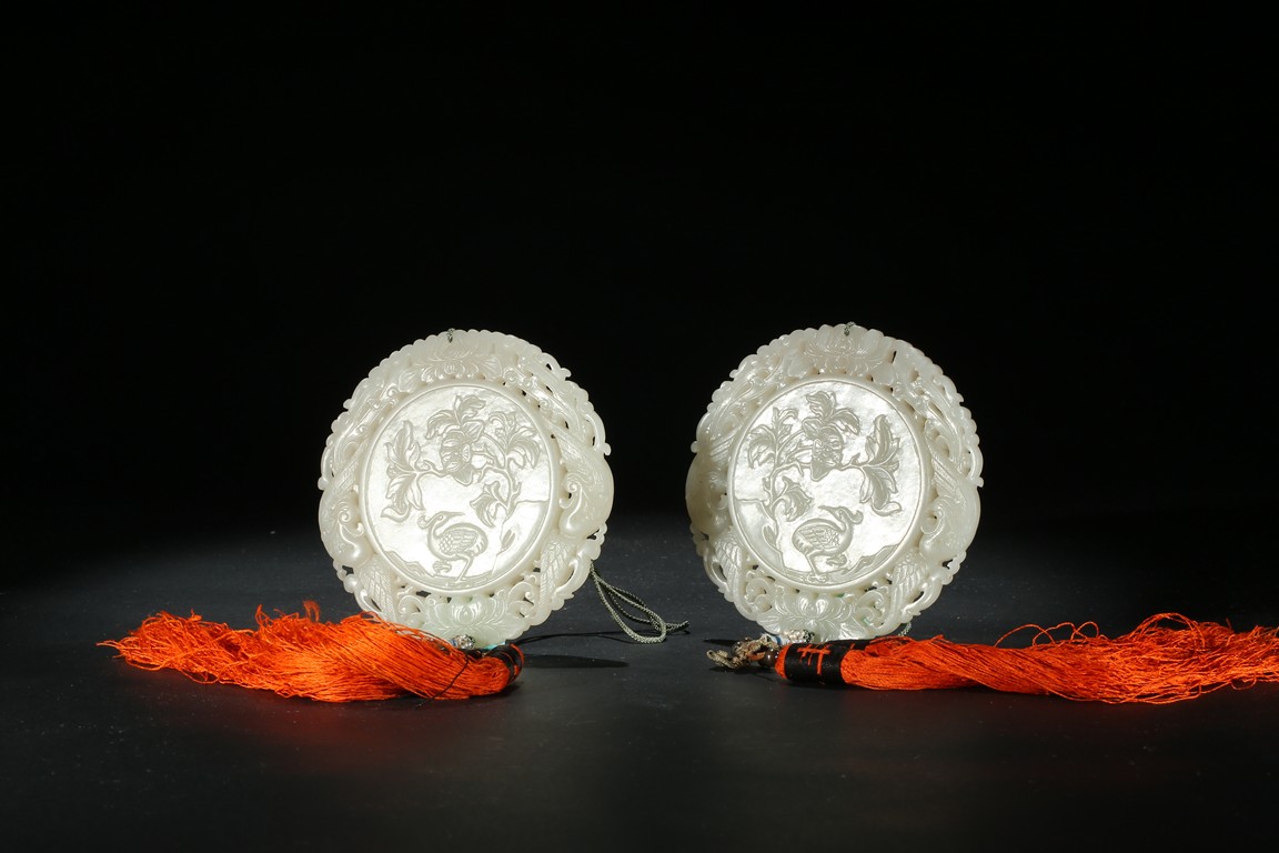 Each of circular form and surrounded by an openwork decoration of phoenix and flower, the center finely carved in low relief on one side with egret and leafy flower, the reverse carved with an official figure worshipping the Queen Mother of the West, the smoothly polished stone of even white color. Qing Dynasty period.