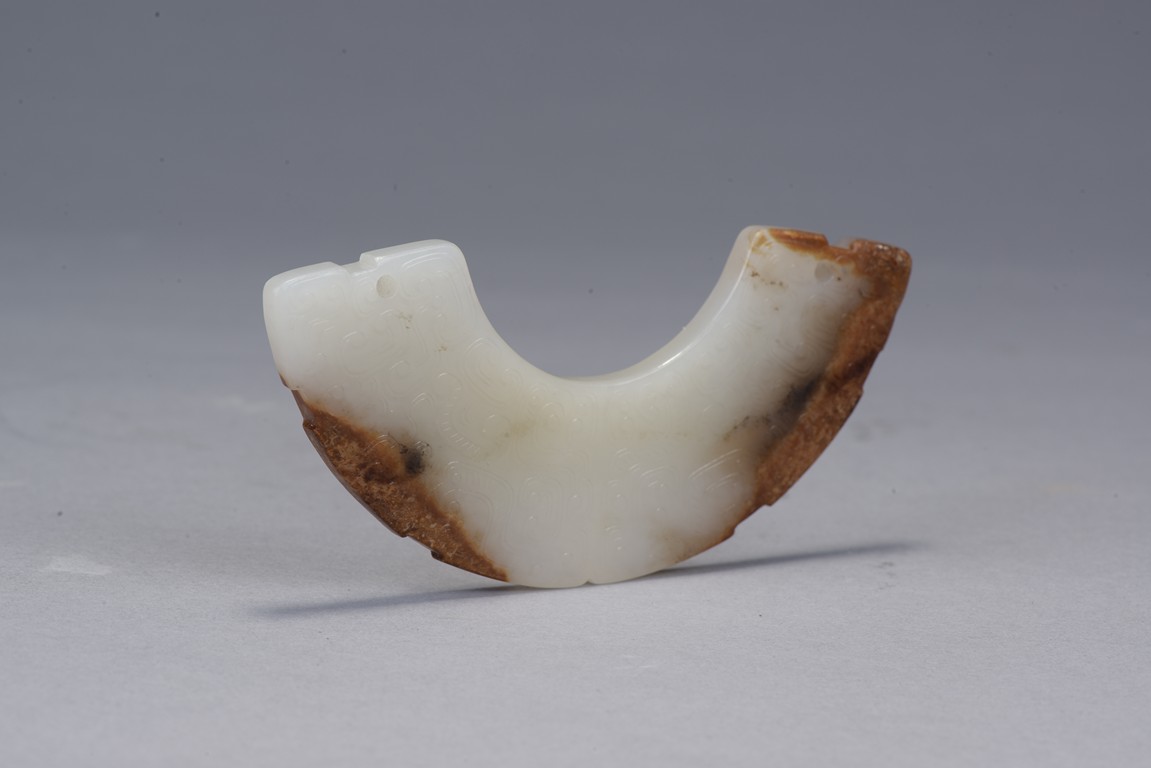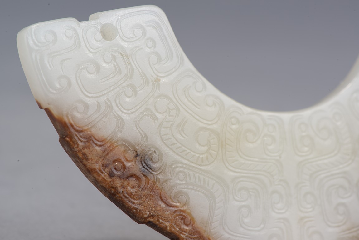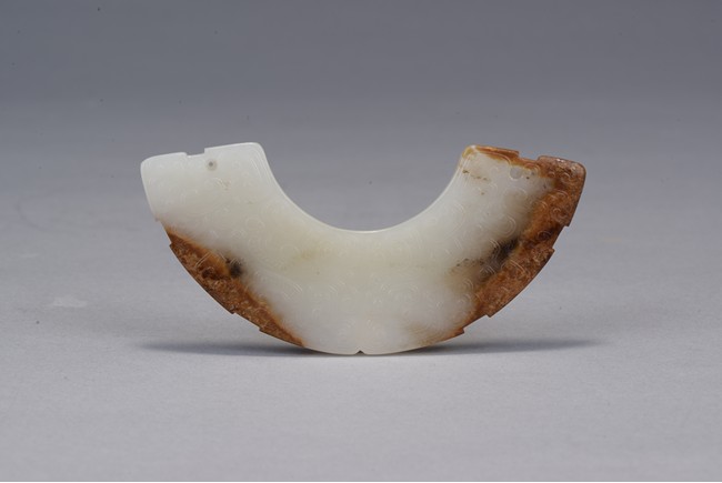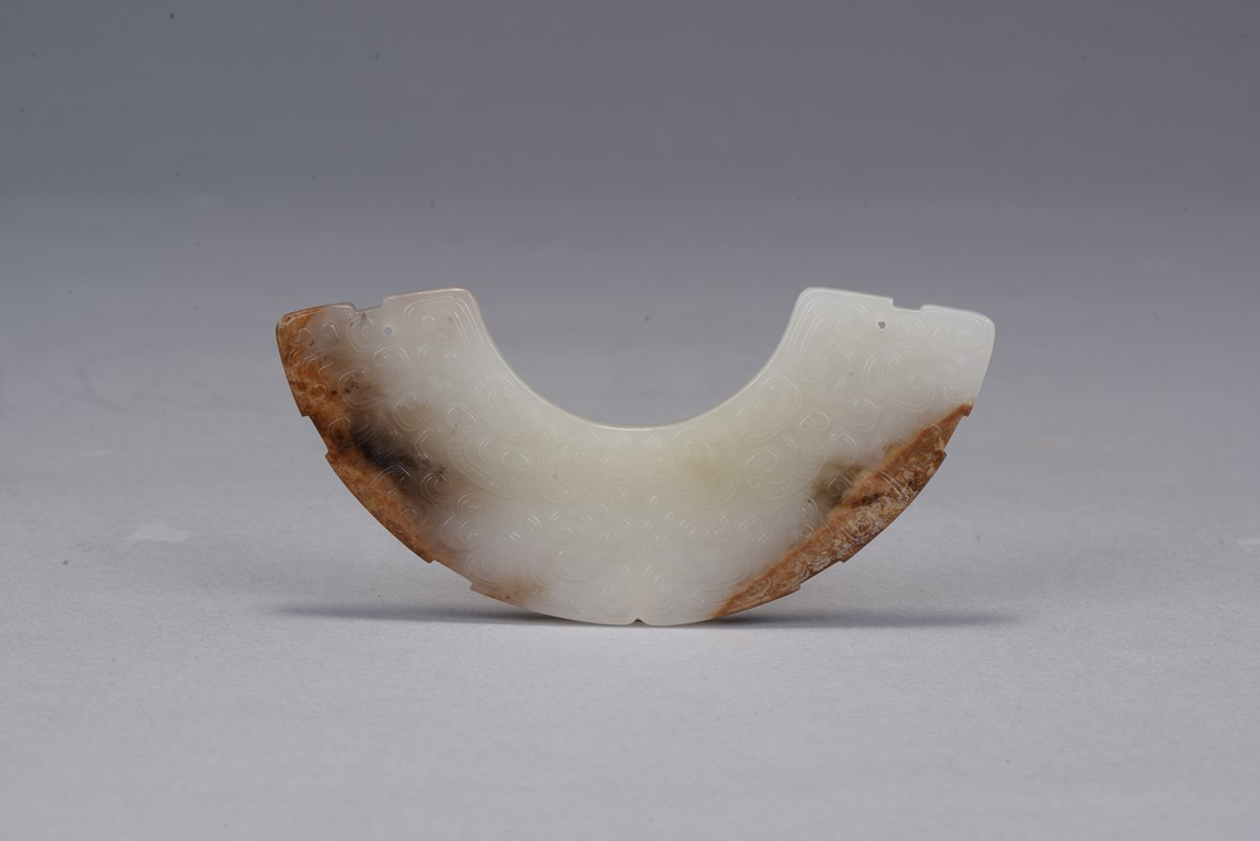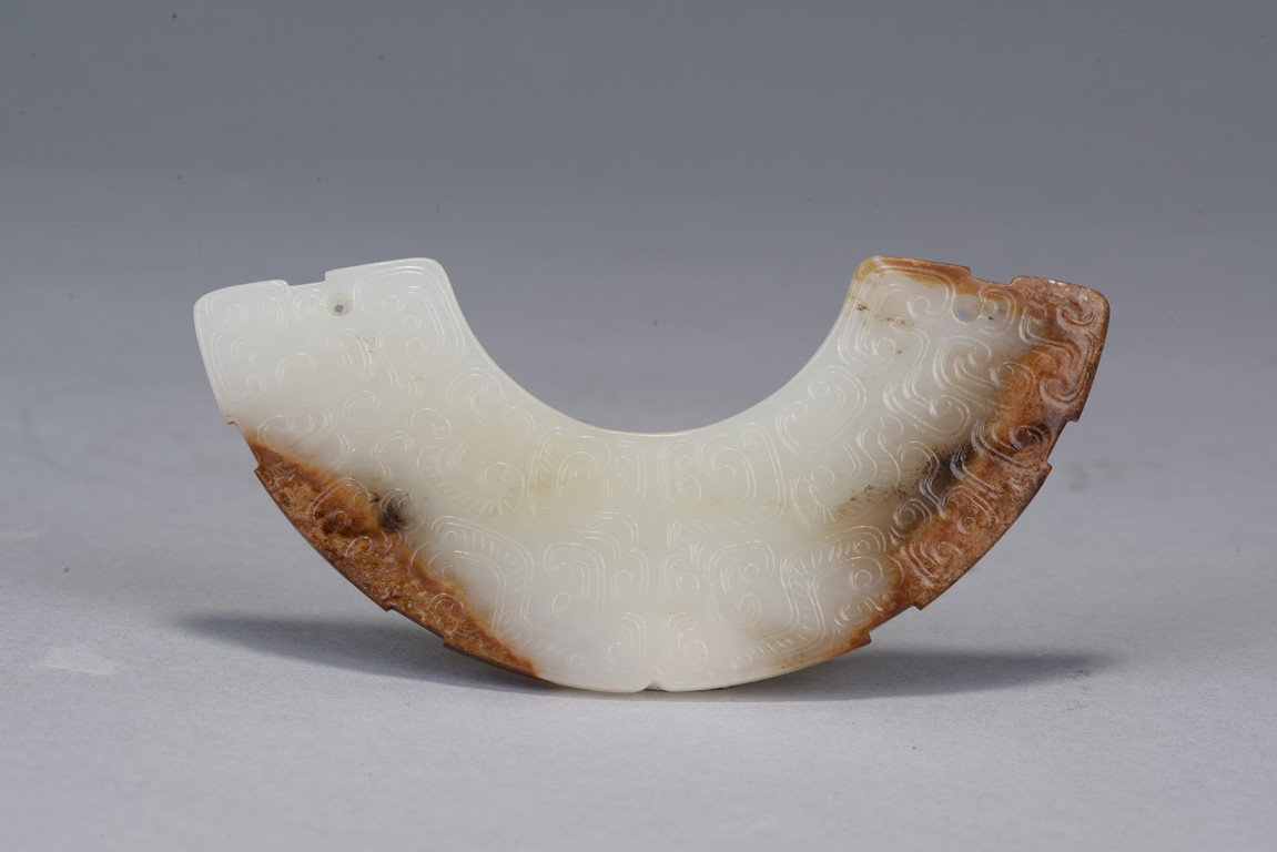 玉璜,呈弧形扁平狀,整體白玉,部分受沁呈褐紅色。玉璜雙面雕刻,滿飾勾雲紋, 排列密實飽滿,觸摸有紮手感。此玉璜製作規整,為戰國古玉之精品。 張先生舊藏