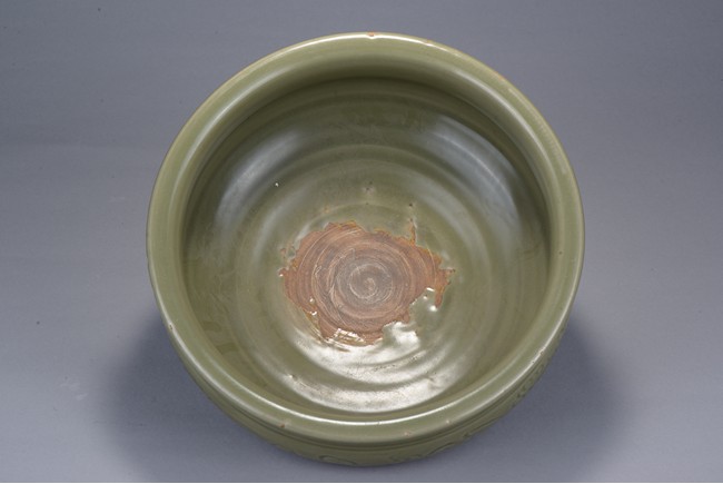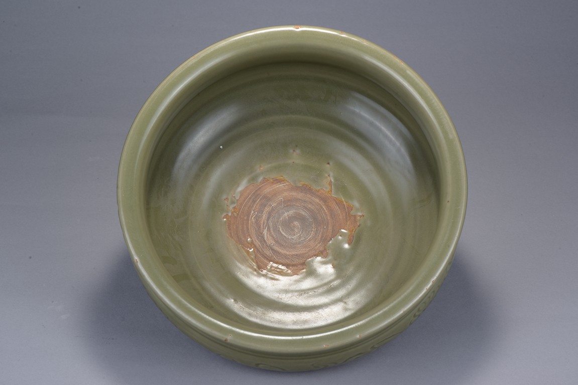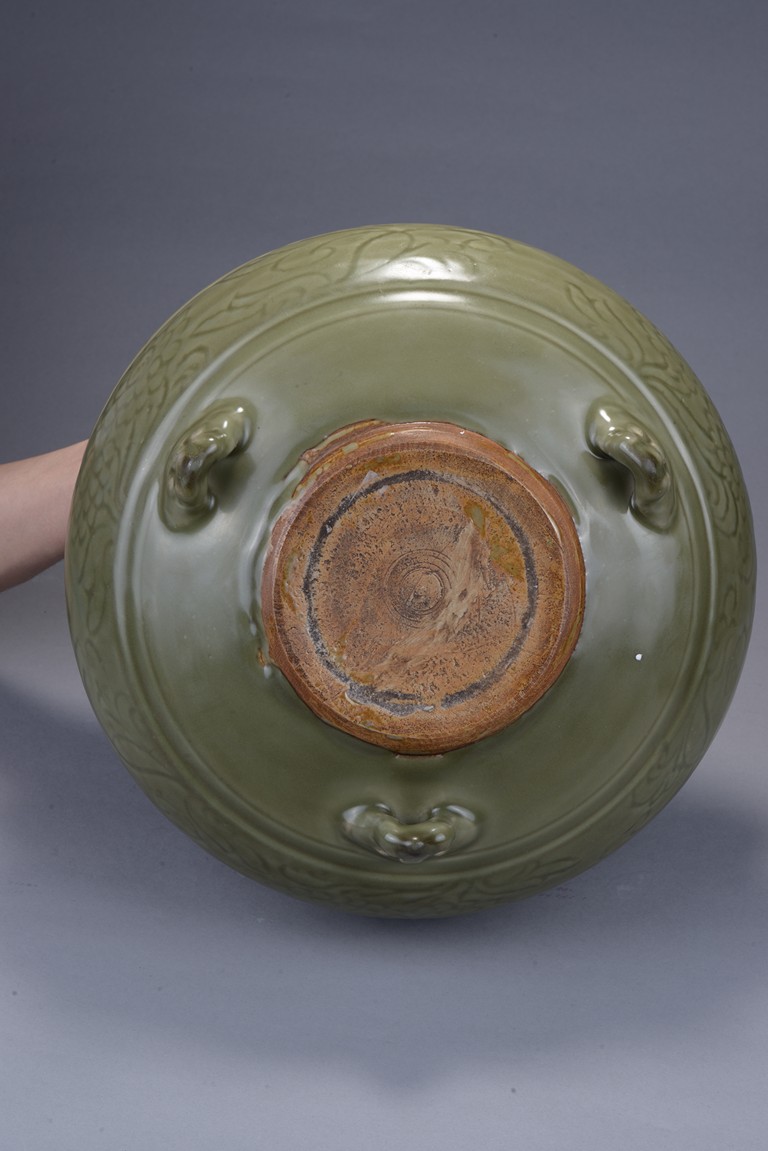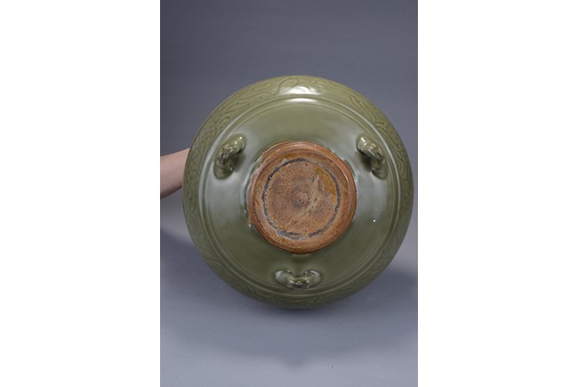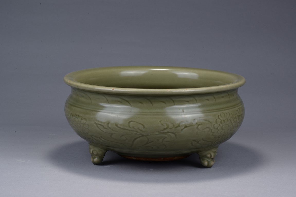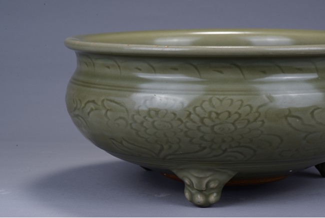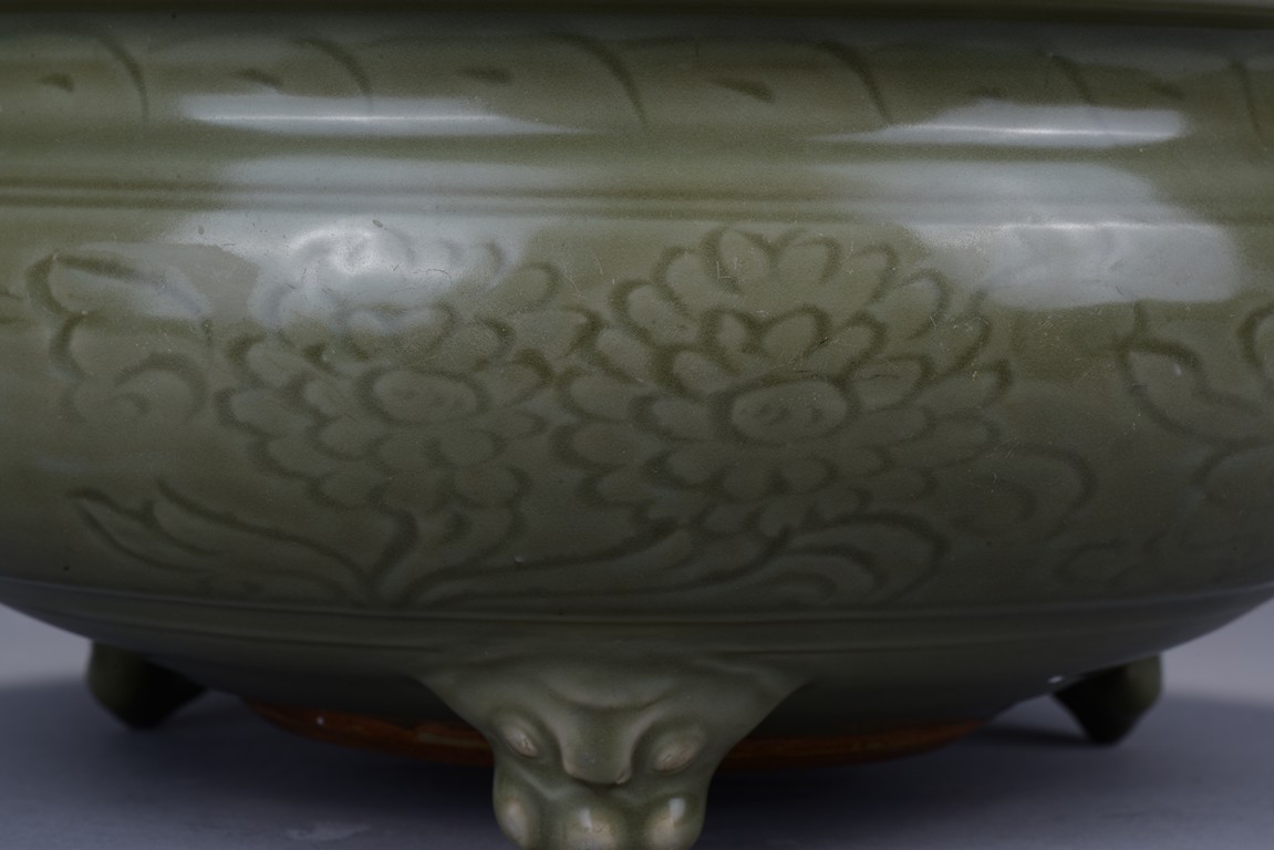 The compressed globular body supported on three paw feet and rising to a waisted shoulder and galleried rim, the exterior carved with a floral band around the body, covered overall in olive green glaze except interior and the base. Ming Dynasty period.