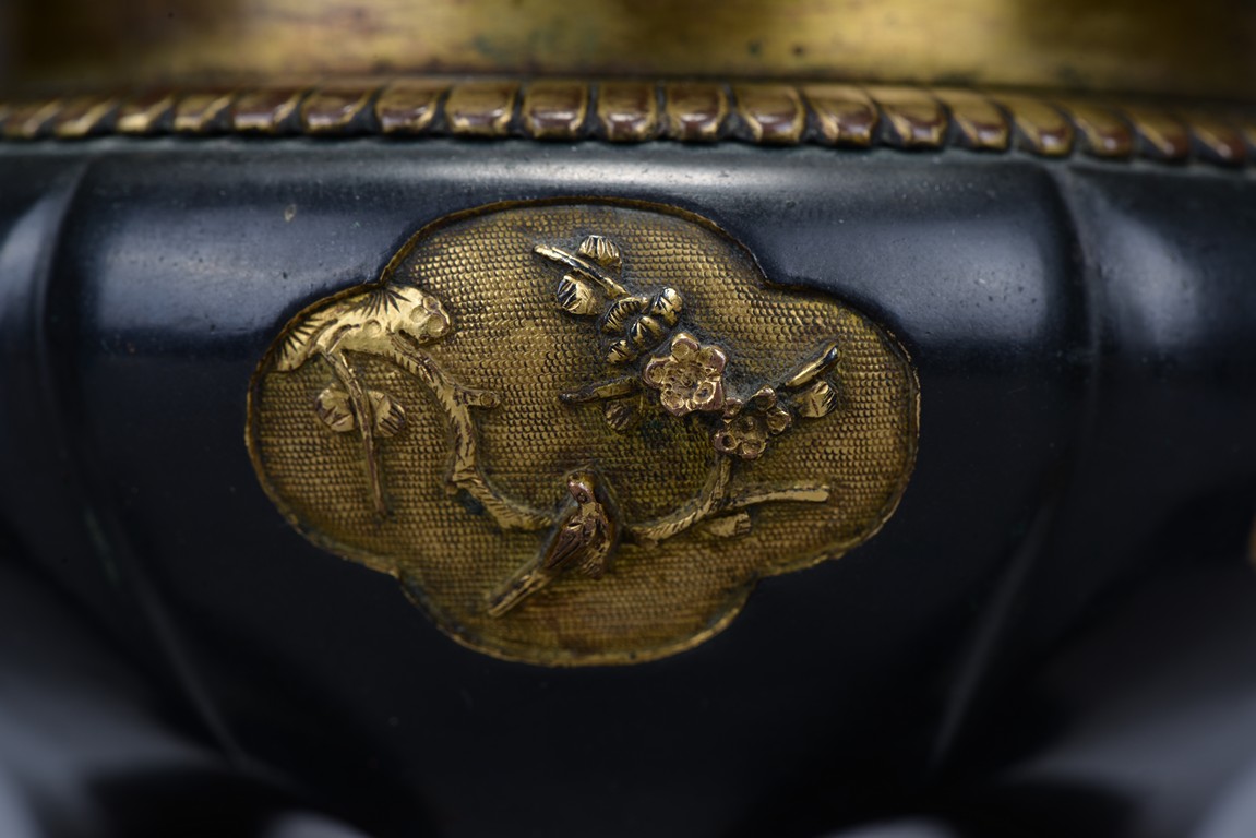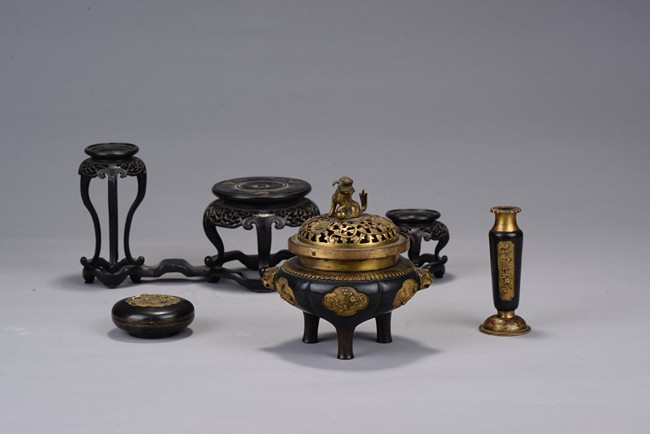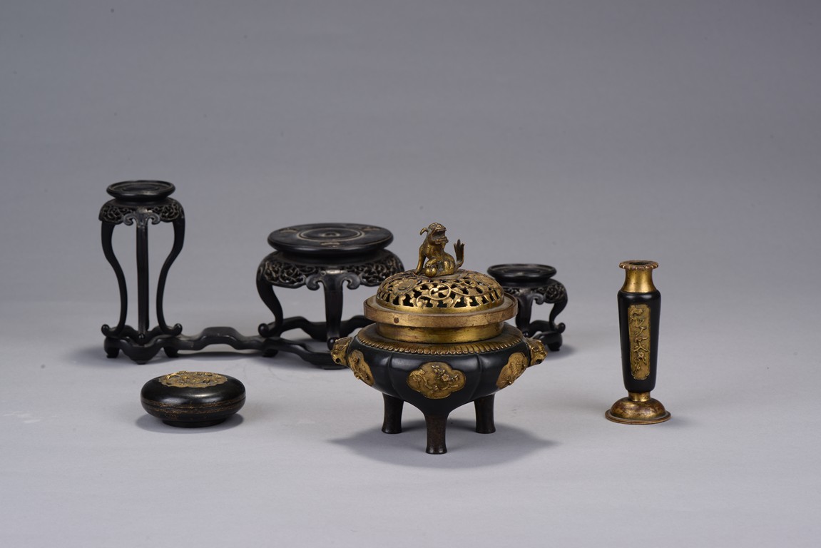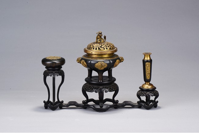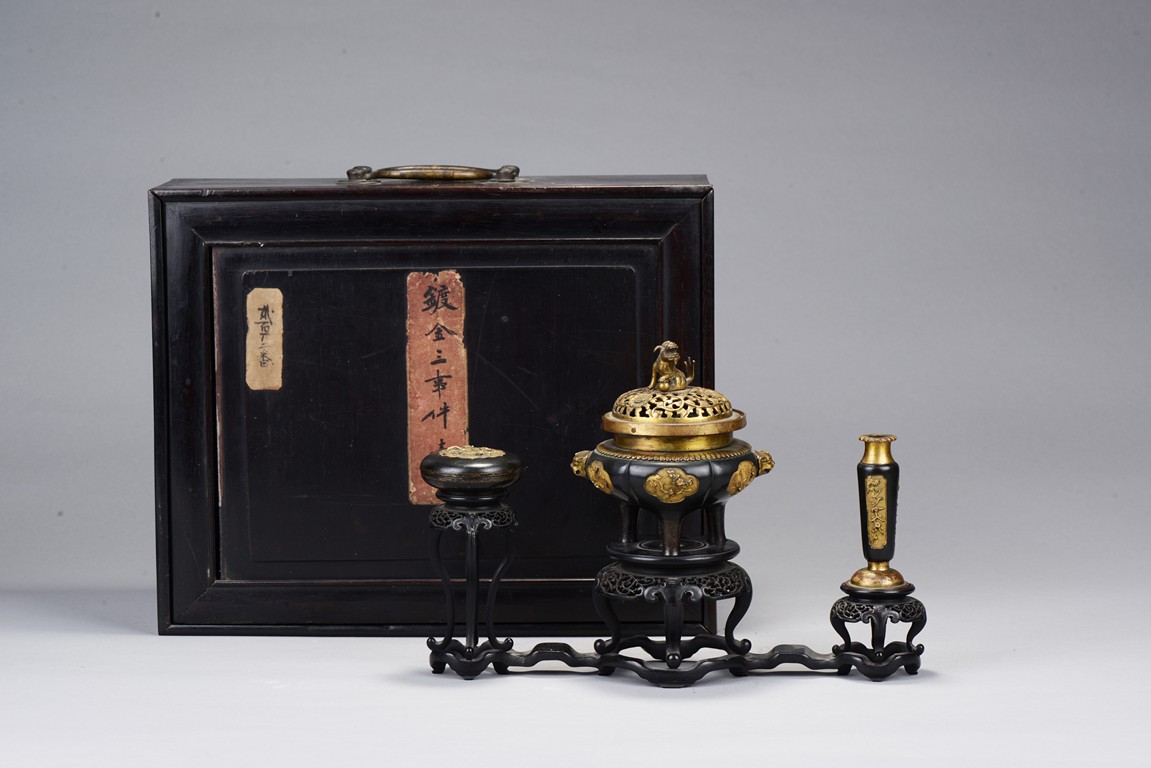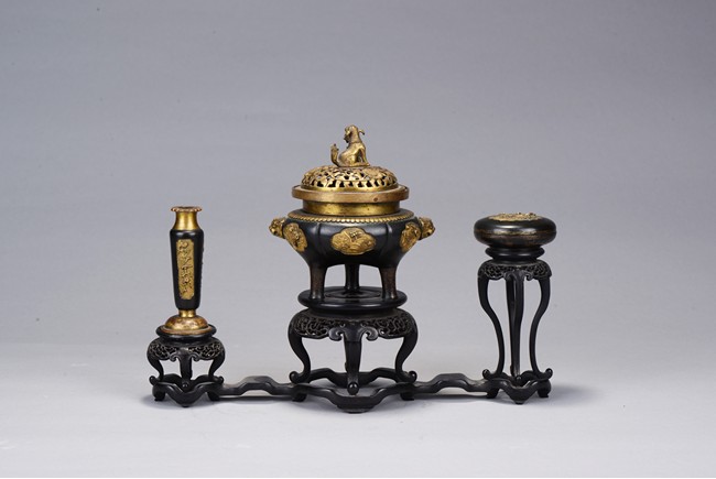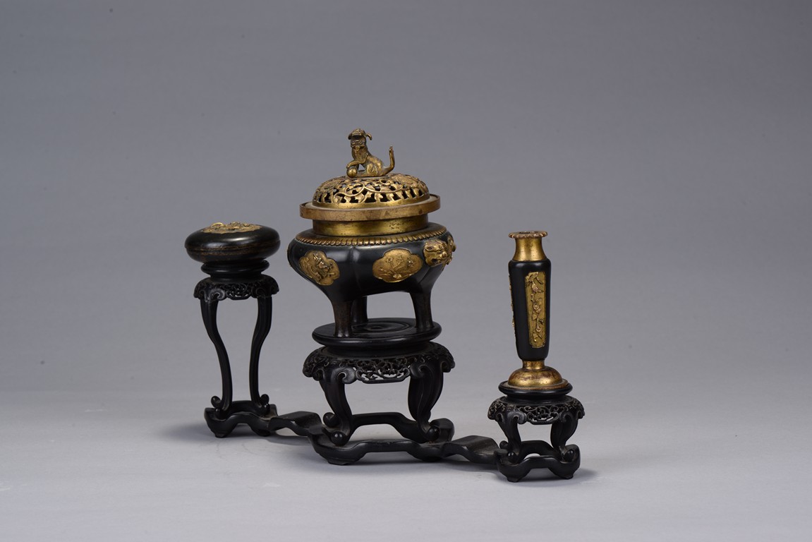 This set comprises of a tripod censer, a circular box and cover, and a cylindrical vase, each mounted with shaped gilt-bronze plaques of elaborate floral decorations in relief. The censer is mounted with a pair of Buddhist lions as handles, and topped with a pierced cover with Buddhist lion finial, all supported on hardwood stand. Mid-Qing Dynasty period.