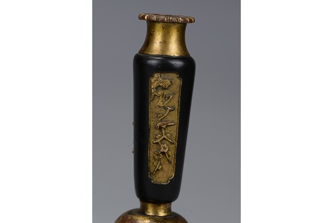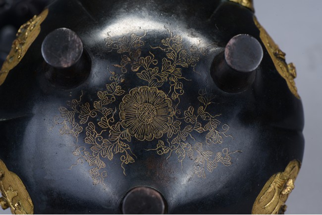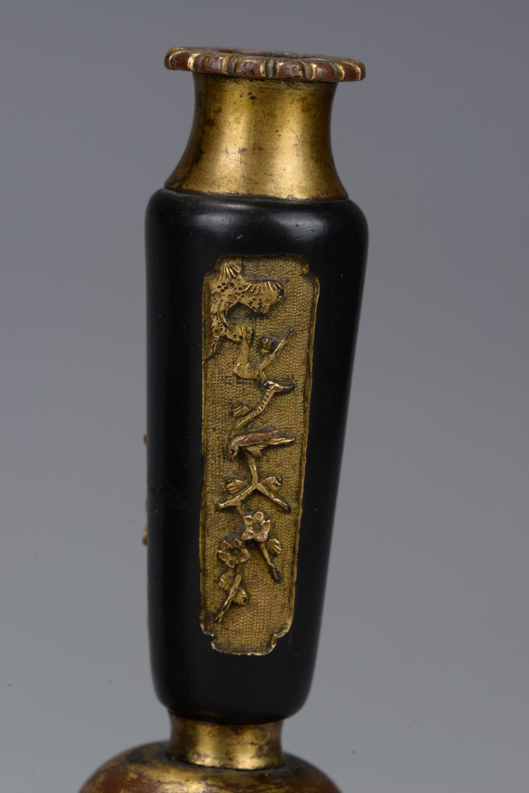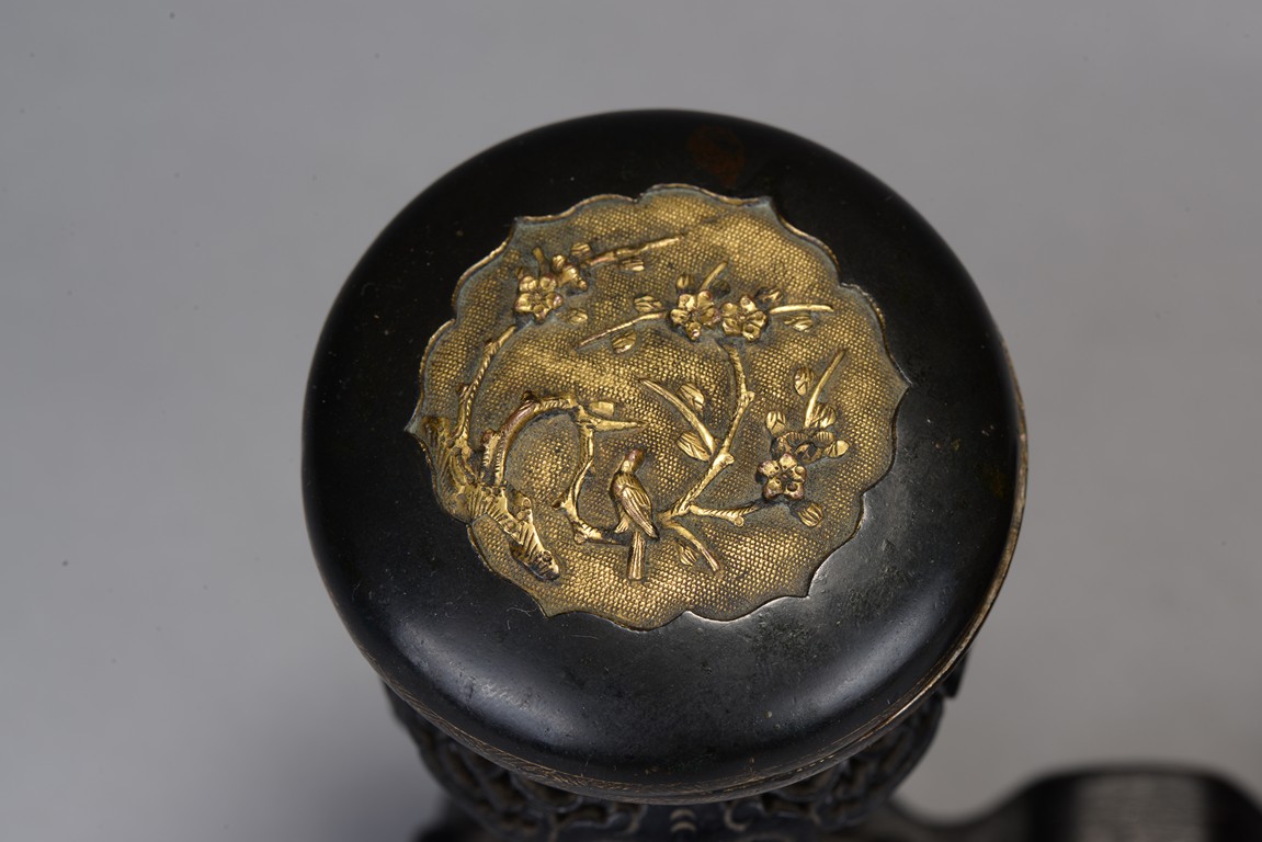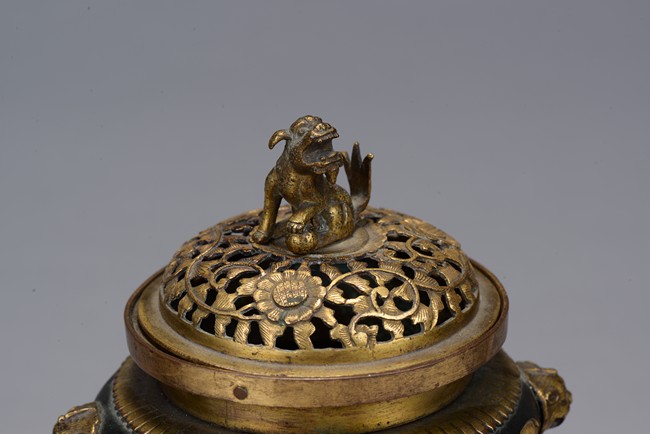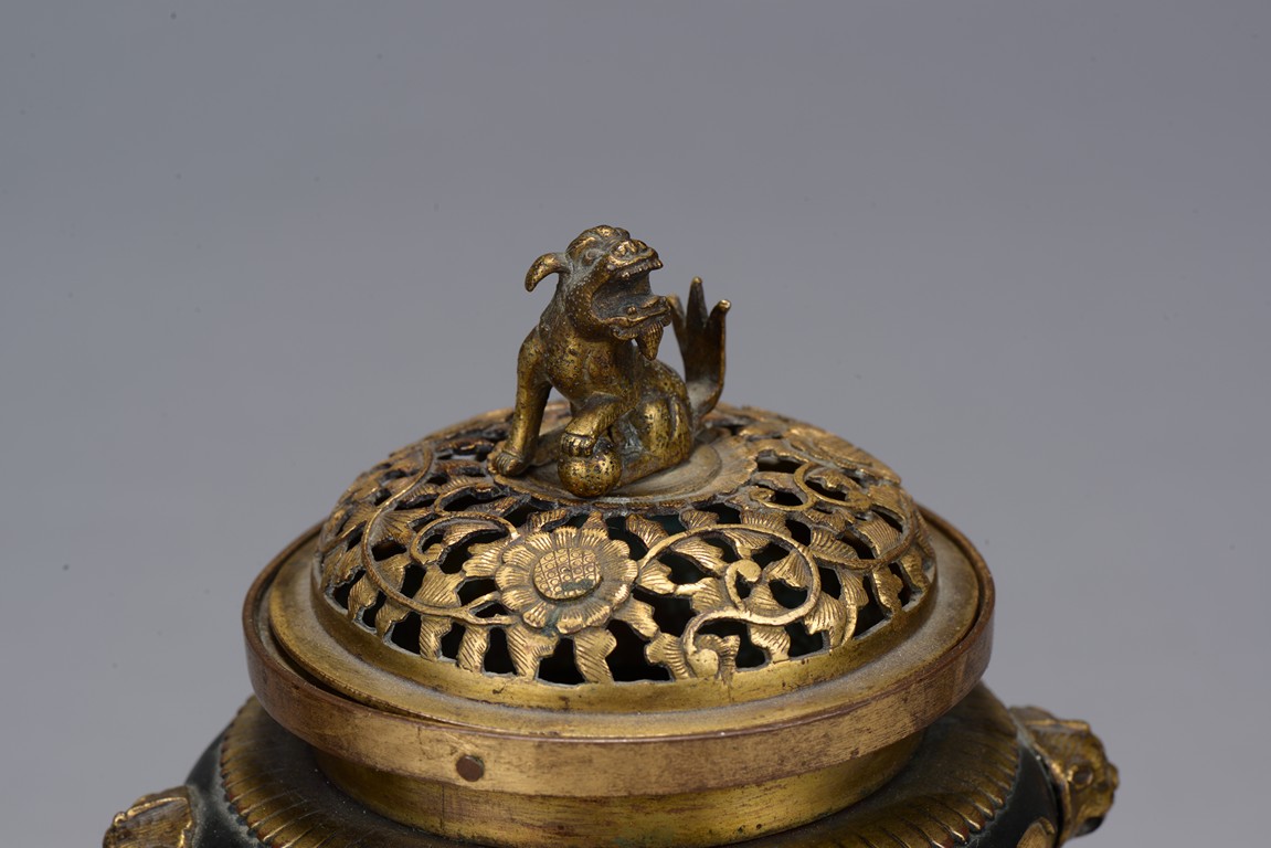 自古以來焚香品香一直就是文人居處齋閣中須臾不可或缺的清雅活動。三式, 由爐、瓶、盒各一件組成,爐用鼎樣式,瓶長頸,盒圓形。此件銅銼金香薰爐,造型大氣,圓潤渾厚。蓋作鏤空,獅鈕。器身兩側飾雙獸耳,下承三足。香盒,器型 飽滿,圓潤富麗,端莊典雅。瓶呈筒狀,小巧精細,用之便利,腹部開光裝飾,整 體構圖飽滿清新,可玩可賞。此組爐瓶盒三式,製作嚴謹,氣韻恢宏,富貴艷麗,乃收藏佳品。 張先生舊藏