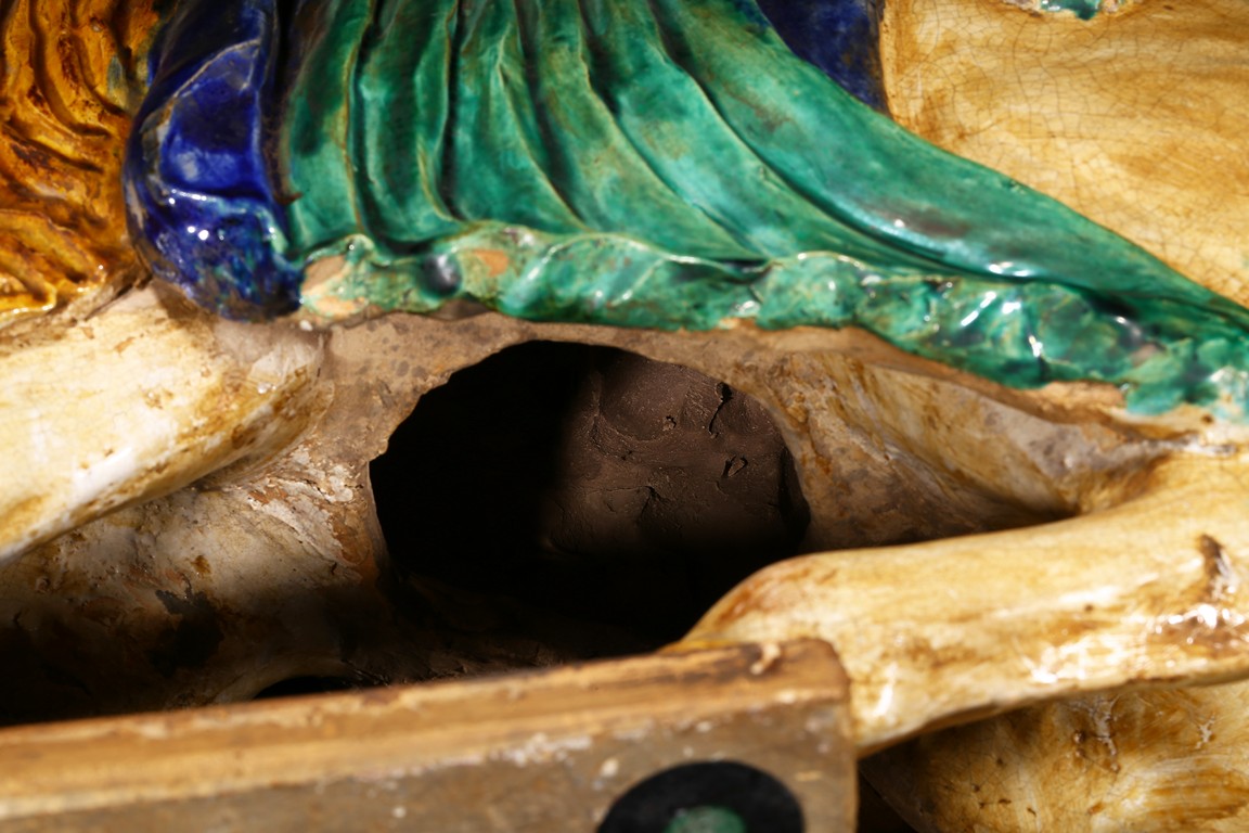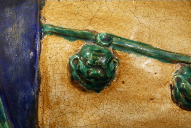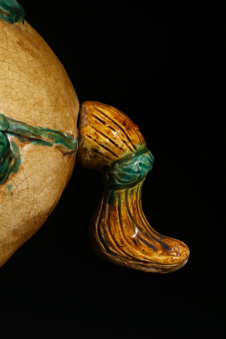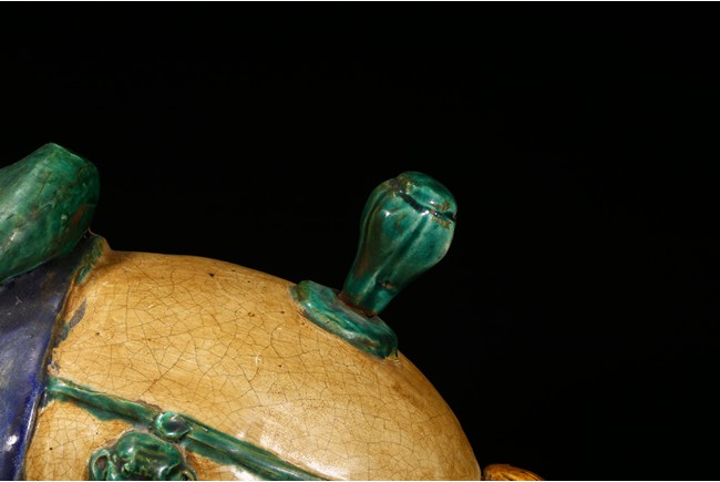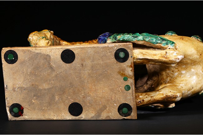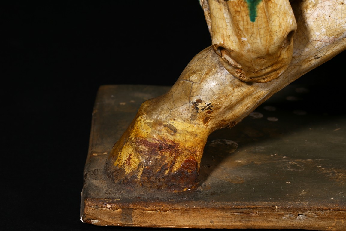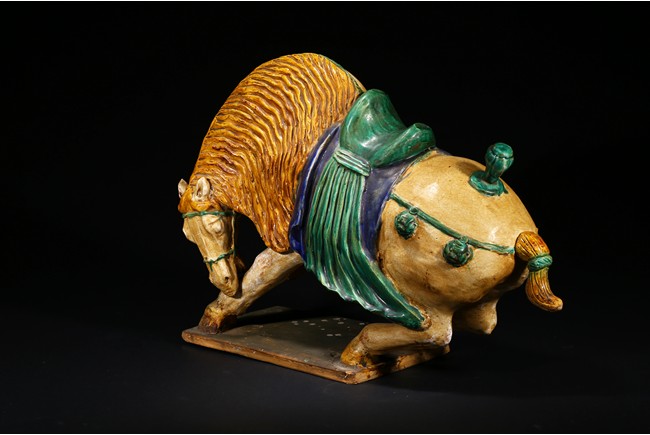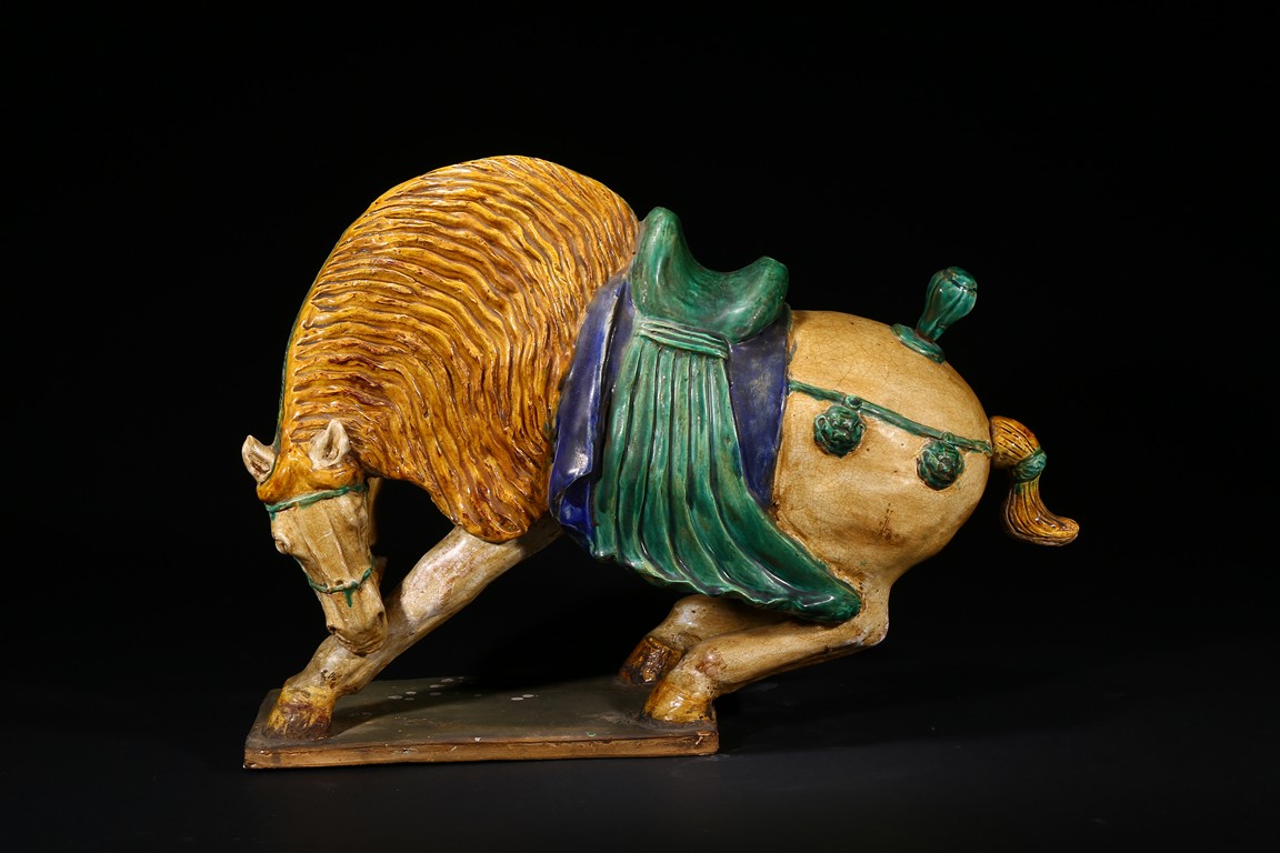 此馬低首回頭,前腿繃直,後退彎曲,直立於托板上,表現出佇立蓄勢待發的狀態。頭戴絡頭,身披攀胸和鞦帶,上掛杏葉形飾物,馬背配鞍,外包鞍袱,下襯雕花墊和障泥,尾系花結。通體施白、綠、赭三色釉。此件唐三彩作品造型準確,比例勻稱,挺拔有力的腿刻畫得尤其生動。馬在唐朝之所以受到重視,與李唐王朝本身俱有遊牧民族血統有關。李世民將騎馬狩獵視為大丈夫三大樂事之一,讓閻立本畫出昭陵(唐太宗李世民陵墓)六駿樣本,命工匠雕刻成石質浮雕,永遠陪伴其左右。唐玄宗李隆基馴養舞馬在自己生日的千秋節上應節踢踏,翩翩起舞。詩人李白吟出“五花馬,千金裘,呼兒將出換美酒,與爾同銷萬古愁”之佳句。 張先生舊藏