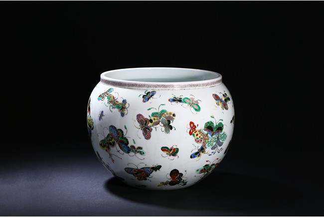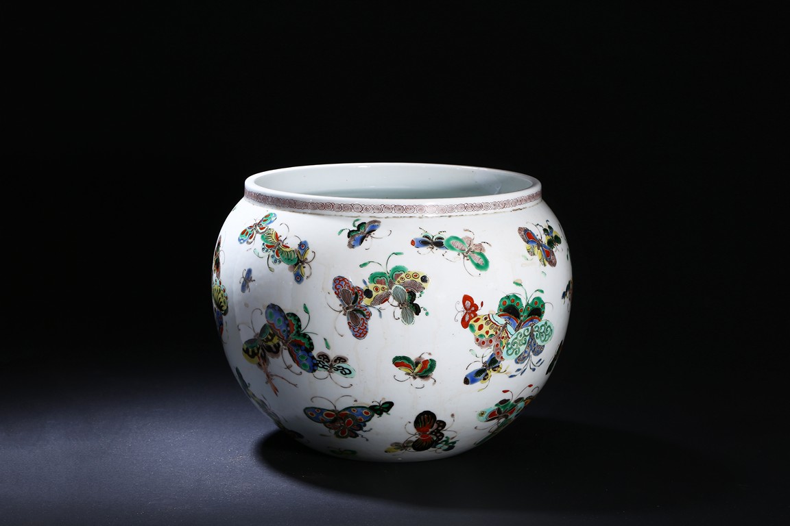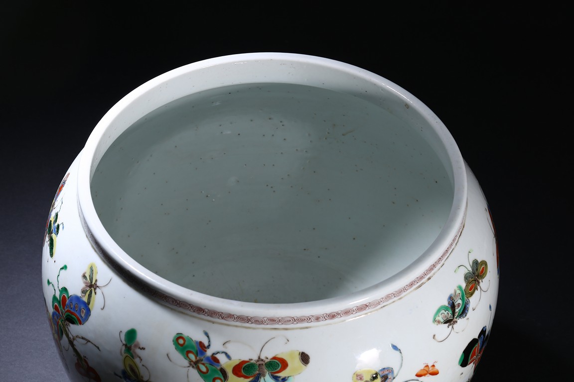Of globular form, exterior painted with various butterflies in flight in famille rose. Qing dynasty period.