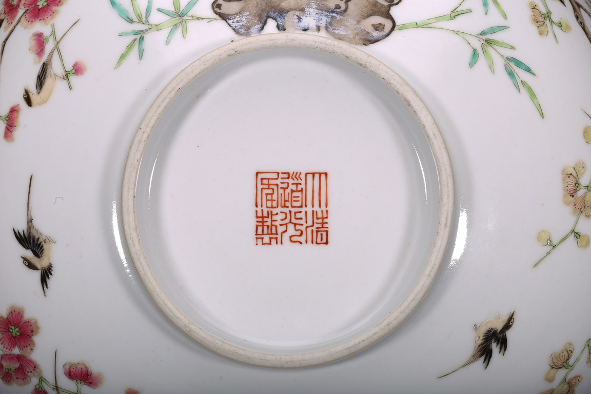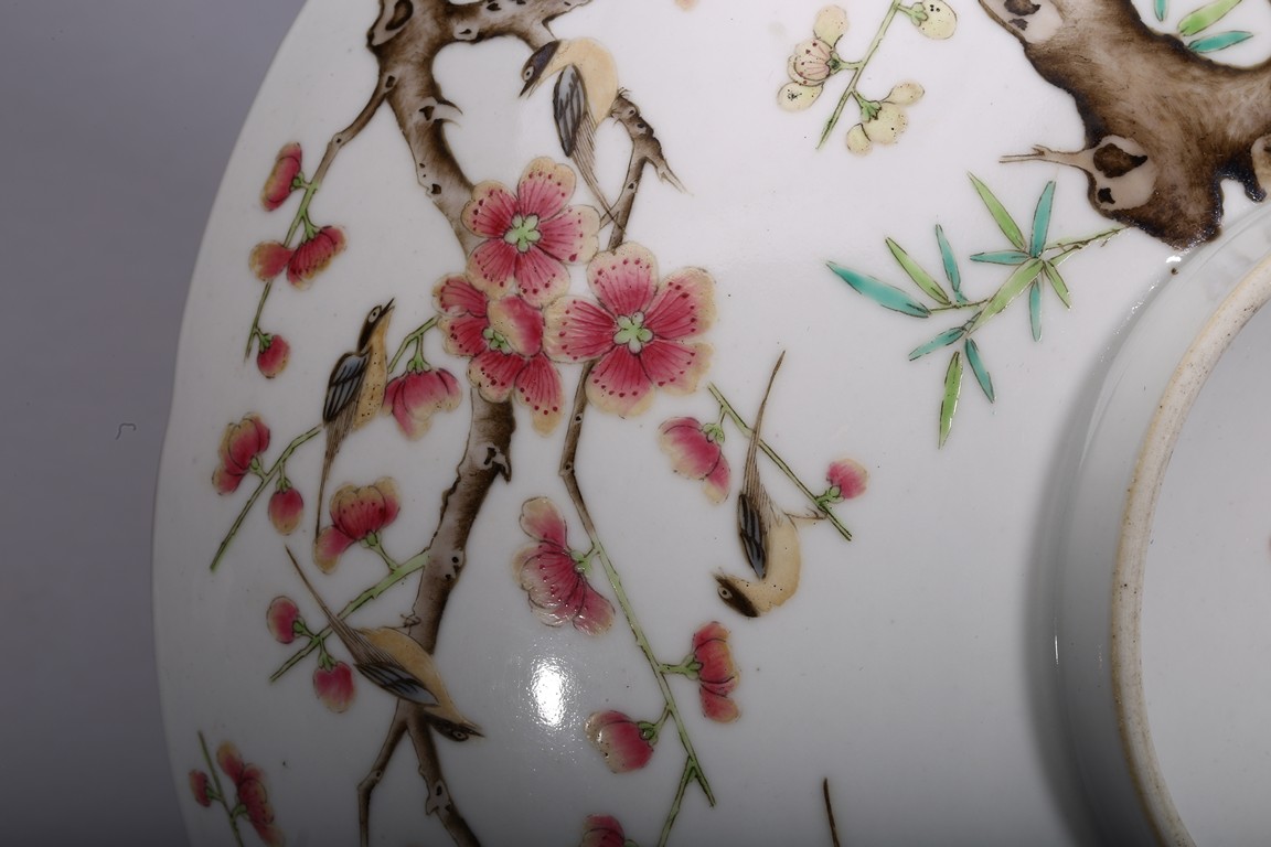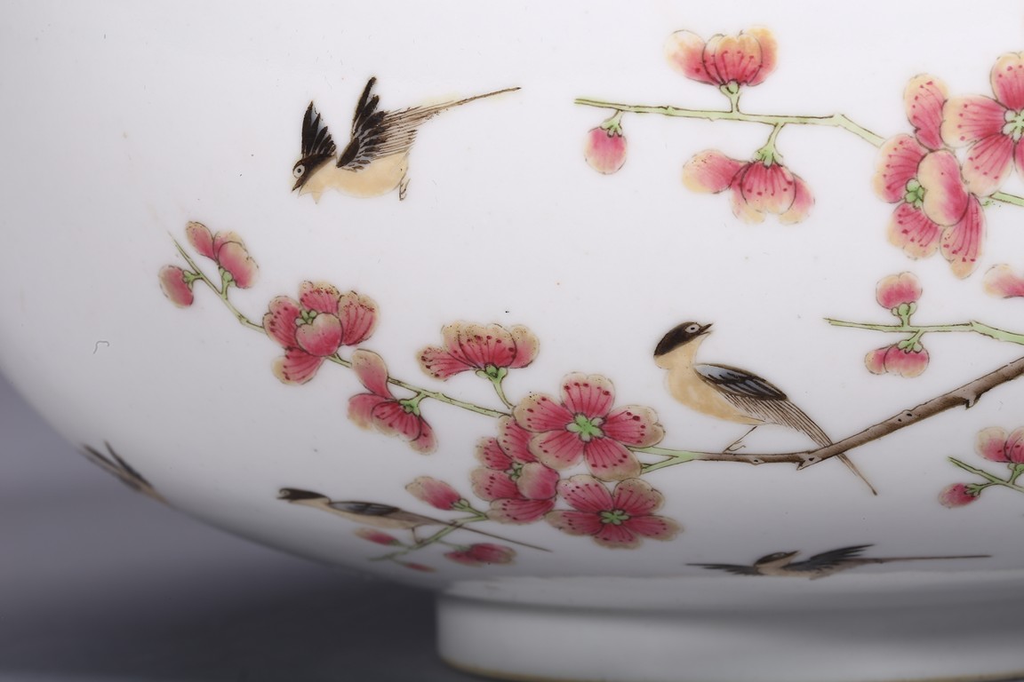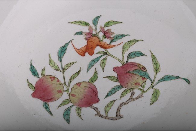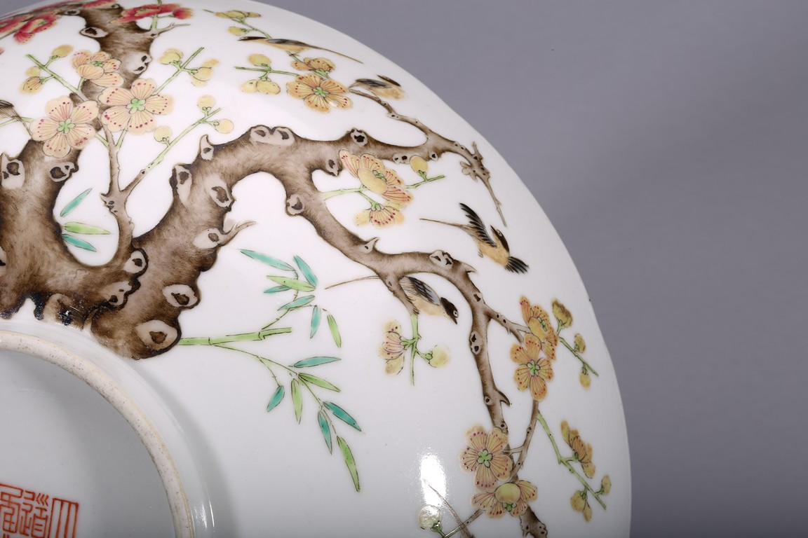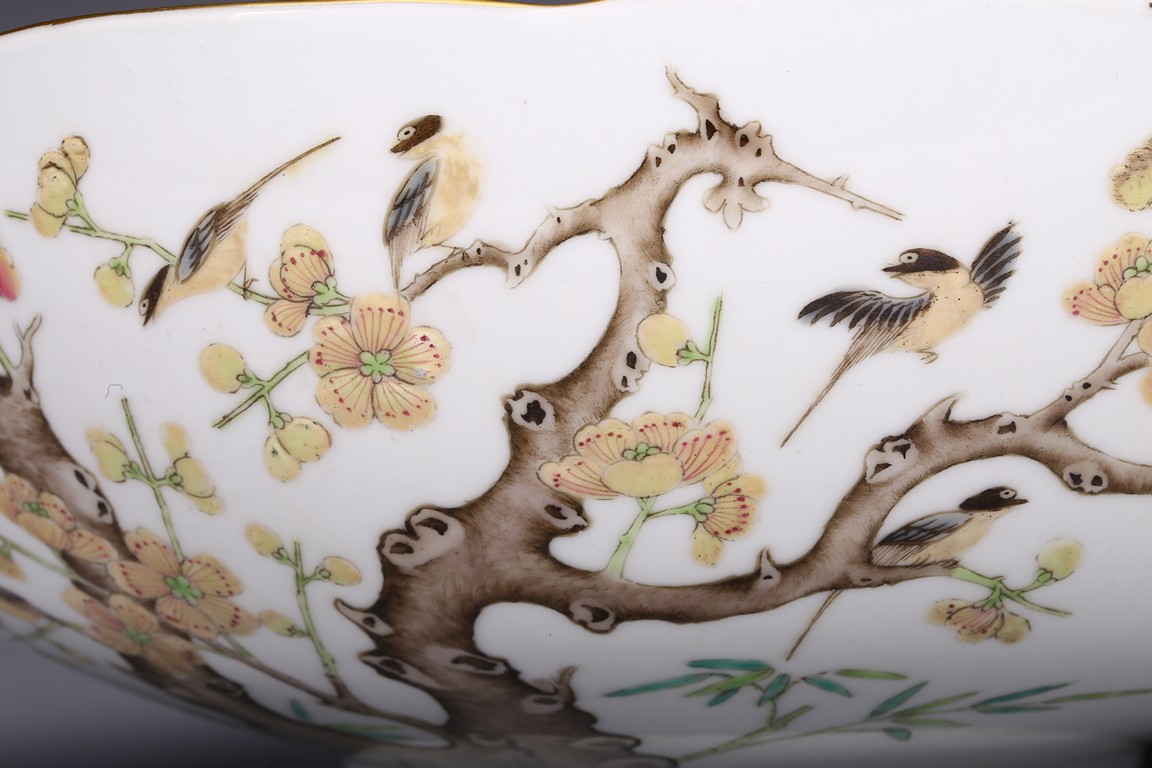 Potted with rising from a low foot to a floriform-lobed rim, finely painted with intertwining gnarled branches of pink and yellow plum blossoms, the interior painted with leafy three-peach sprigs, base with mark. Republic period.