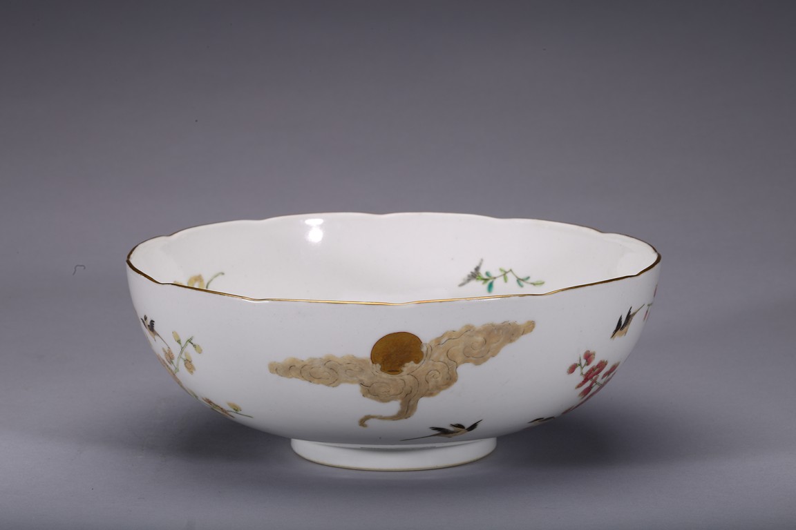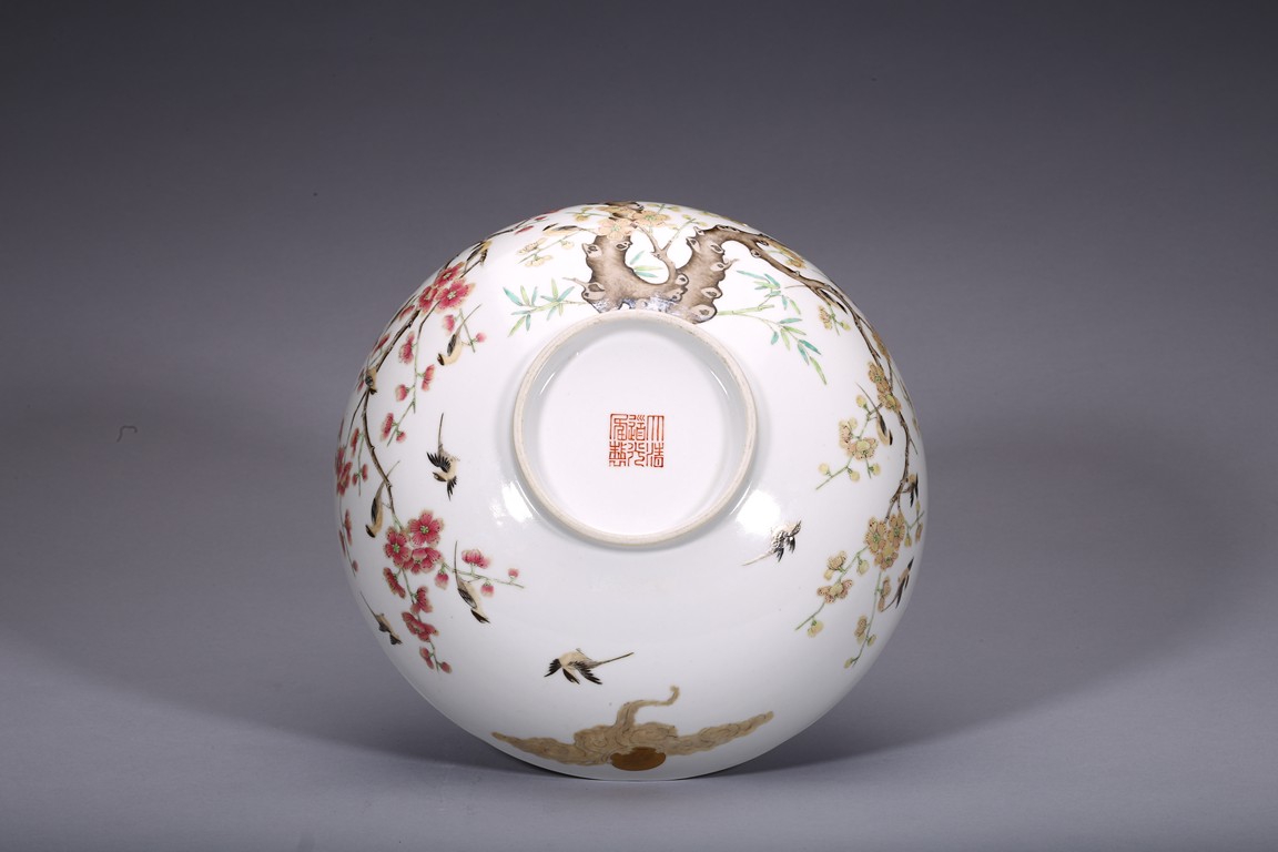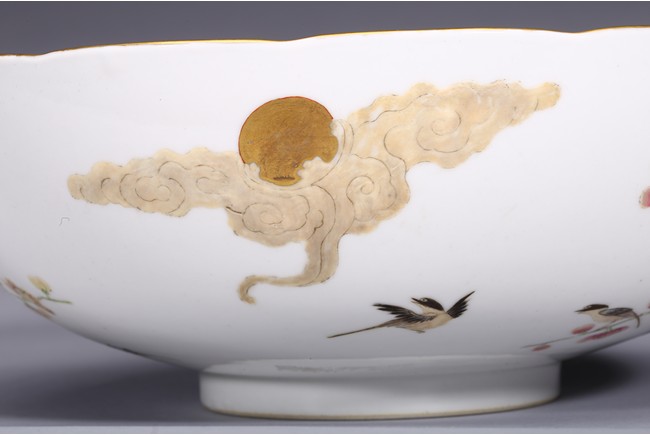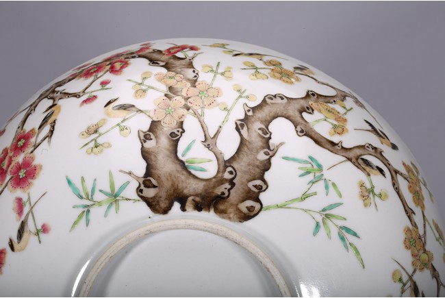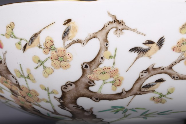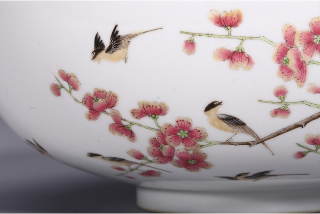 碗圓形葵口,深腹,圈足。此碗內外壁以梅花,桃花等圖樣。碗外壁飾桃花,梅花以及幾只喜鵲立於梅花之上,寓意喜鵲登梅之意,喜鵲登梅是中國傳統吉祥圖案之一,也是徵兆吉祥的雕刻題材。民間常把喜鵲登梅的作品陳列家中,以兆好運。喜鵲叫聲婉轉,在中國民間將喜鵲作為吉祥的象徵,象徵好運與福氣。梅,古代稱"春花"。 張先生舊藏