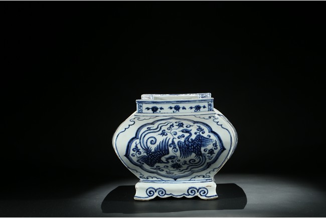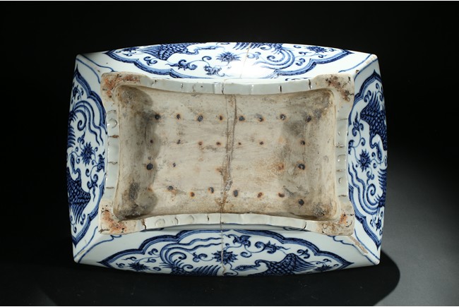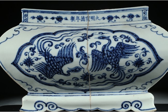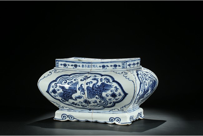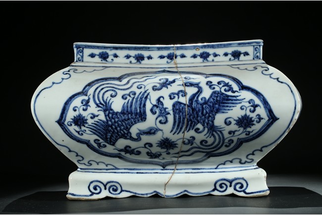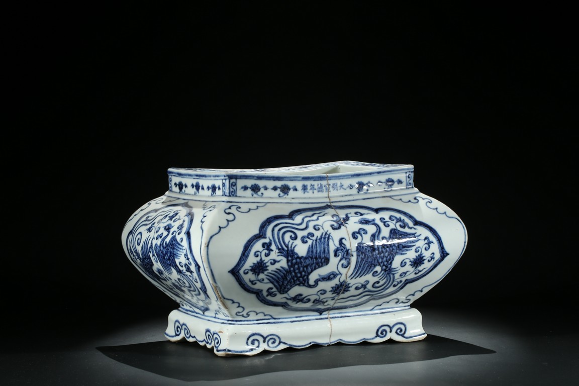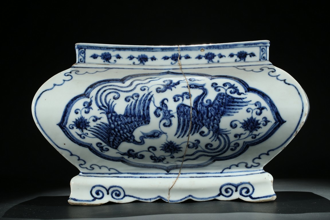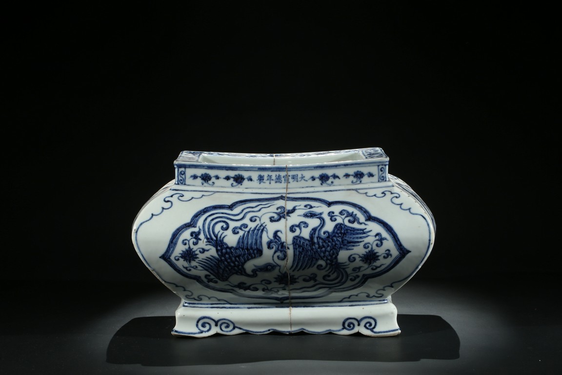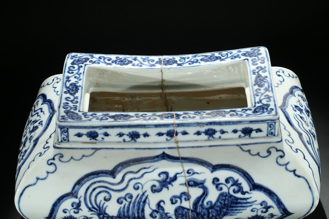 The jardiniere robustly potted of rectangular form with four bombe sides rising from four stylized ruyi cloud bracketed feet connected by an apron, the body finely painted in cobalt-blue on each side with two phoenix in flight enclosed within a ruyi-shaped cartouche, the front rim decorated with six character xuande mark flanked by two floral sprays. The base unglazed. Ming Dynasty period.