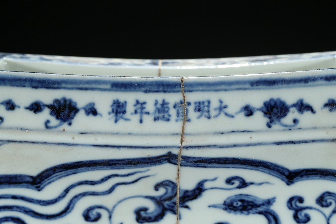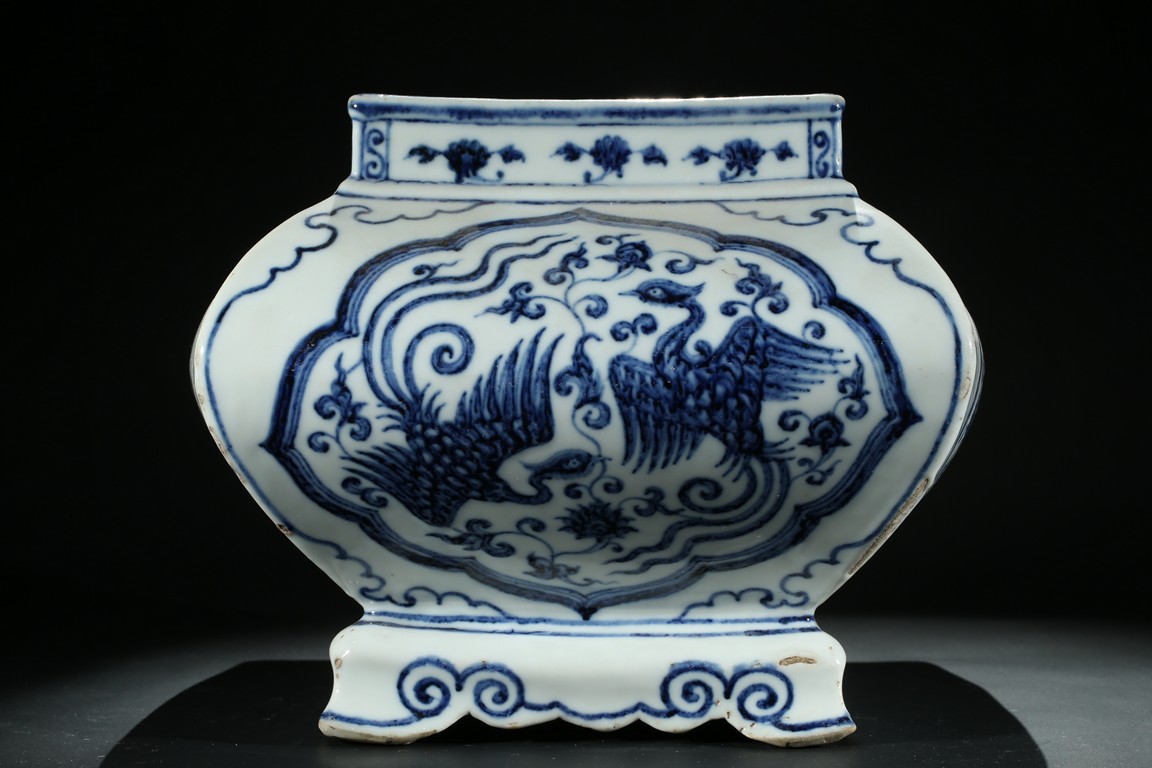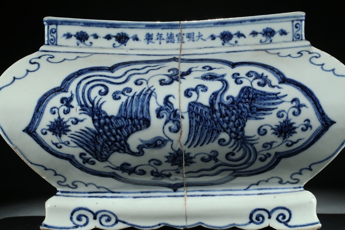 此青花爐器形十分罕見,方口出唇,扁腹,下承四如意折角足,通體青花紋飾,口沿飾纏枝靈芝紋,頸飾小朵花紋,腹部菱形開光內繪雙鳳穿蓮花紋,構圖有度,筆觸細膩,鳳凰之飛躍的動態感,躍然於其上,格調清新優雅,繪畫水平令人嘆止。腹、足四角各飾如意雲頭紋。口沿下從右向左署青花楷體“大明宣德年制”六字壹行款。此件作品為宣德禦窯精品,等級頗高,胎釉俱佳,雖有修復,但歷數代而不減光華,保持至今尤為難得。類似器物可慘考震旦博物館藏“明宣德青花四方爐” 以及北京故宮博物院藏“青花菱形開光雙鳳穿蓮花紋長方爐”。 張先生舊藏