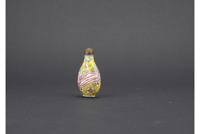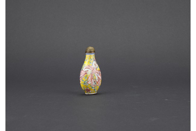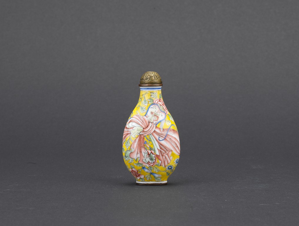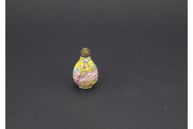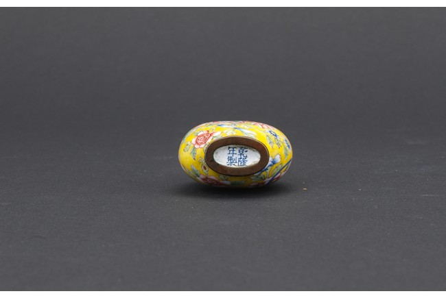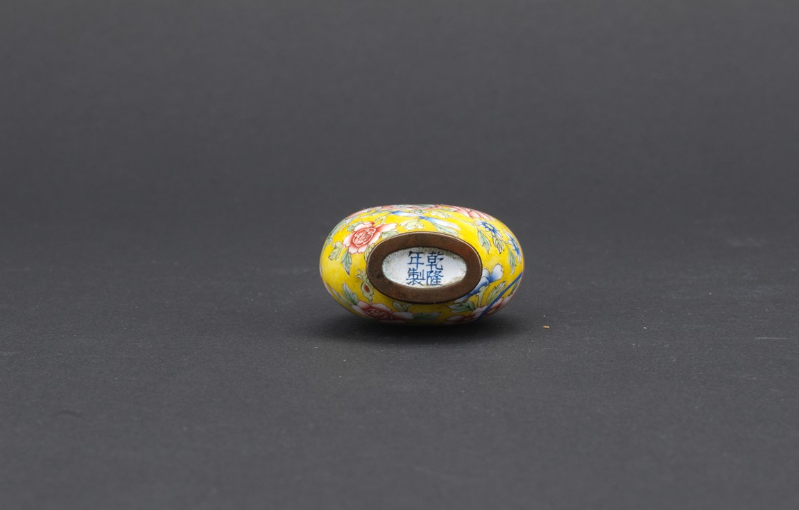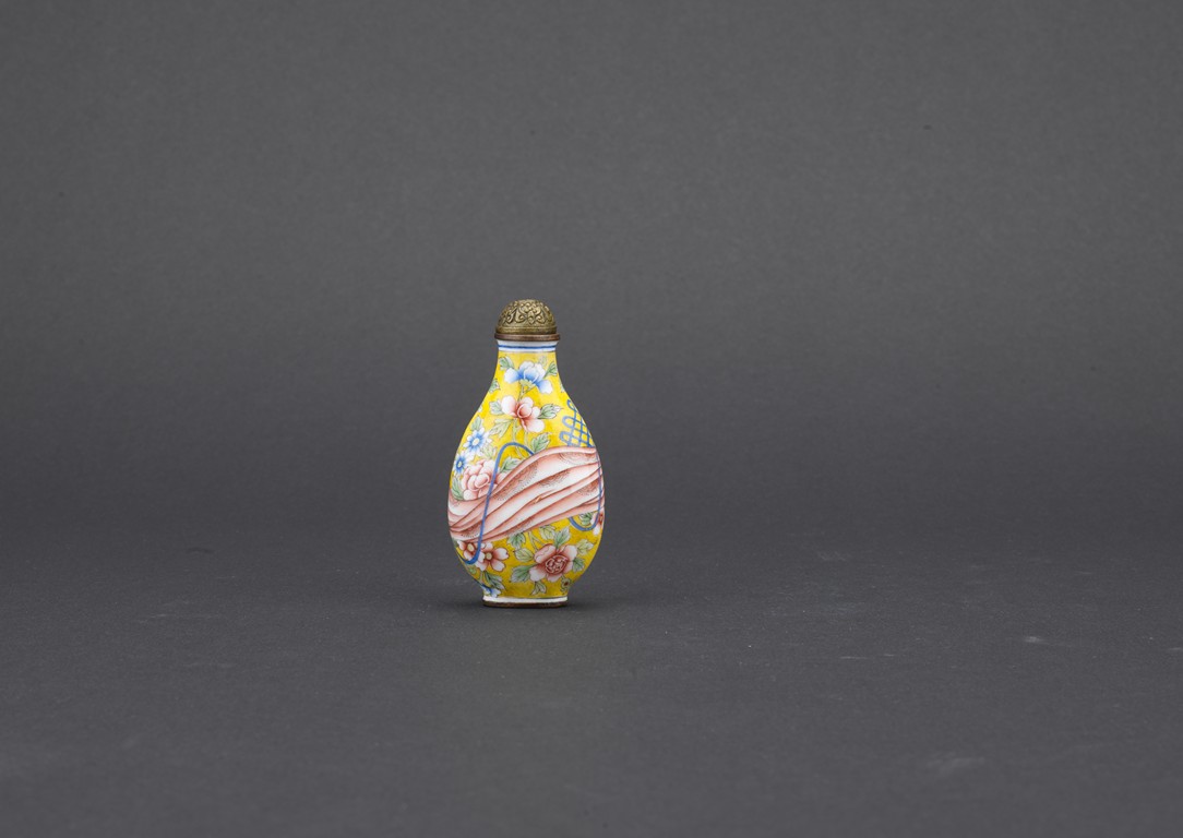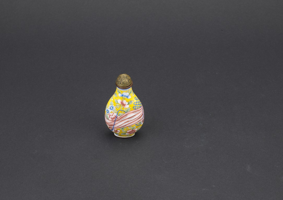 Of pear shaped, the body finely enamelled with a red sash tied to the middle, reserved on overall yellow ground decorated with peony branches and leaves, completed with a metal stopper with decoration, the base with four character QIANLONG mark. Qing Dynasty period.