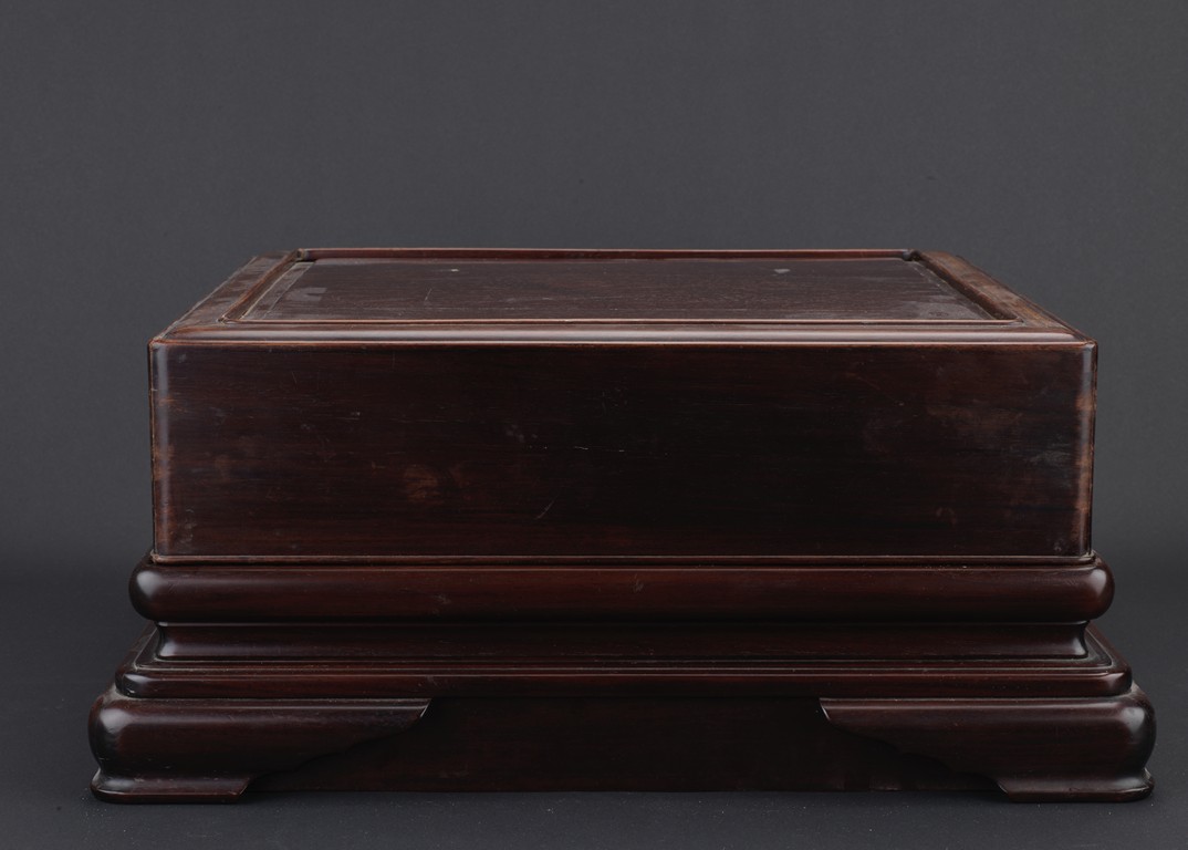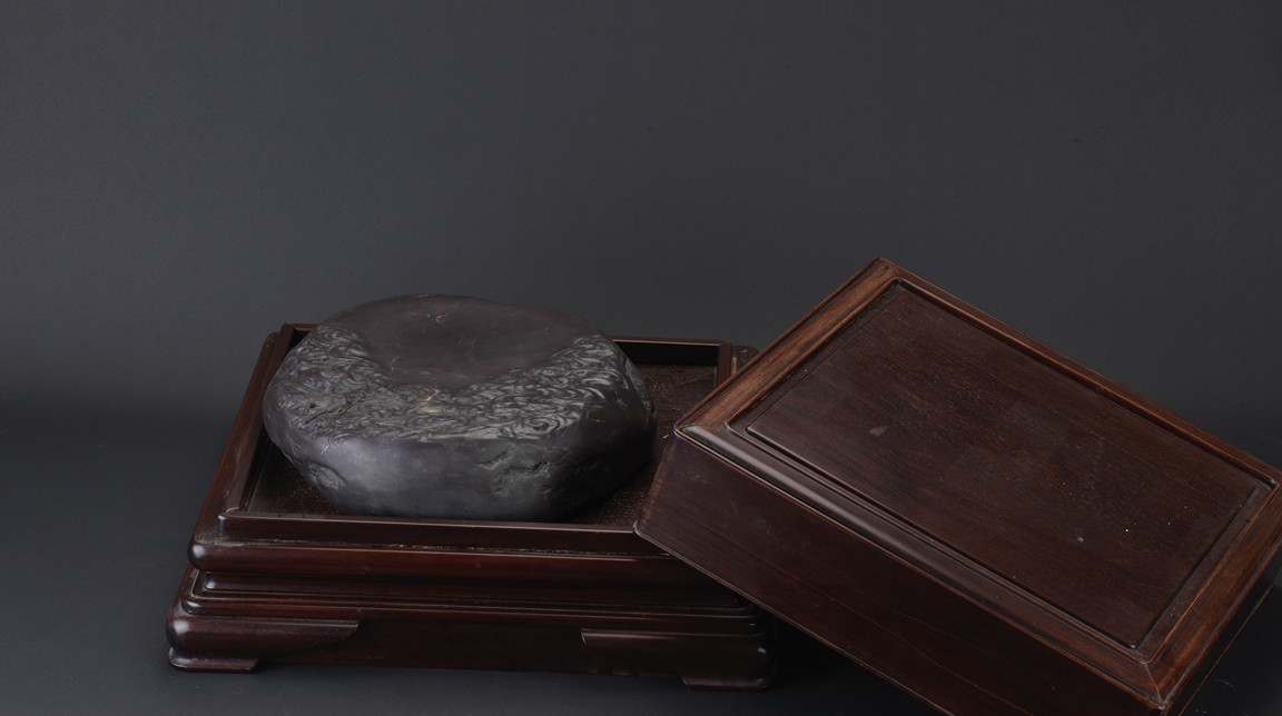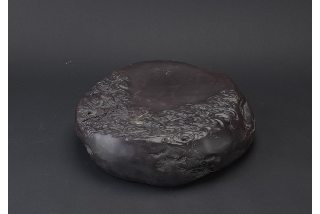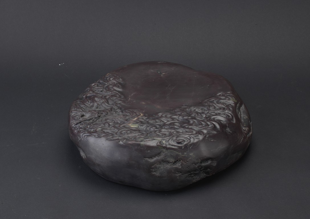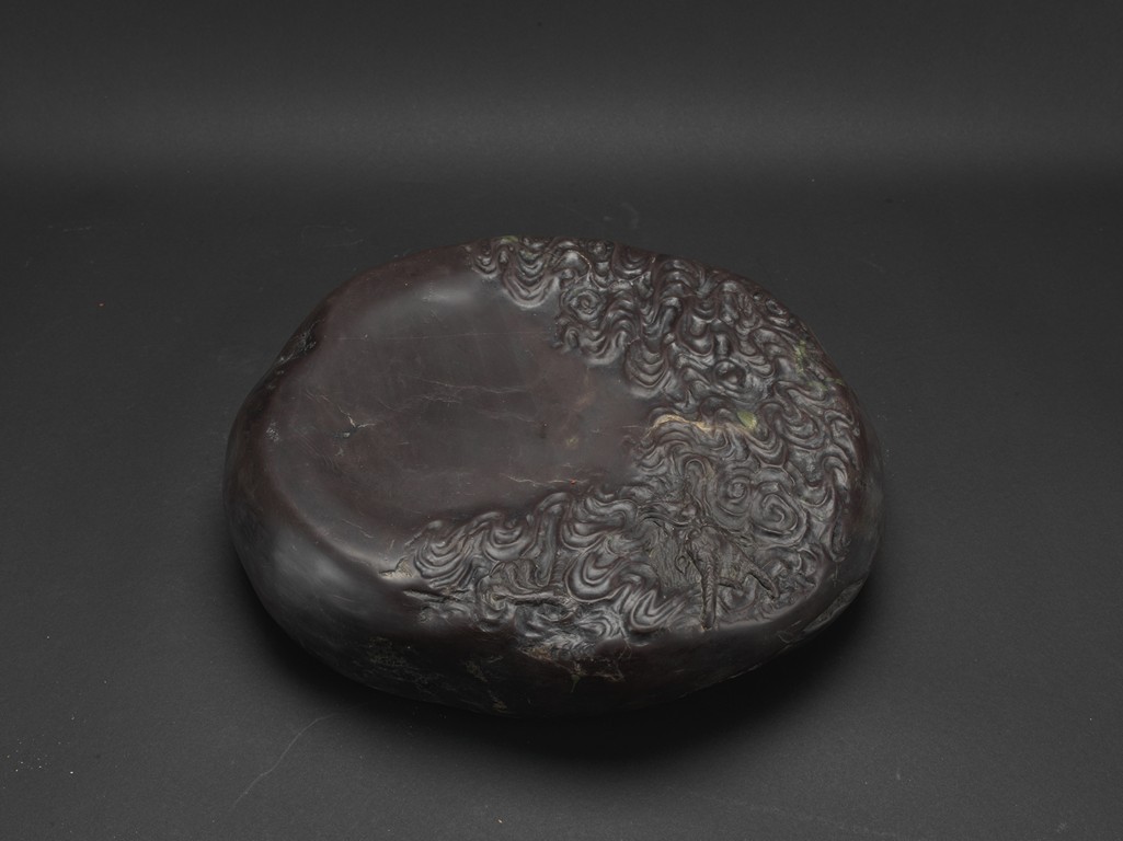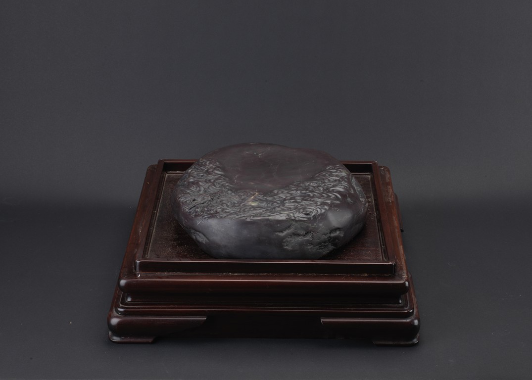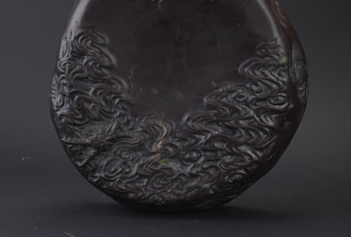 Of shaped rounded form, one side carved with a dragon emerging from dense clouds bordering the inkwell, accompanied with a hardwood stand and cover. Qing Dynasty period.