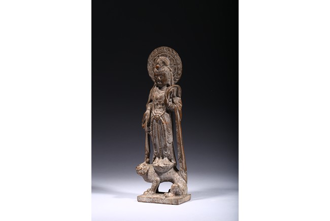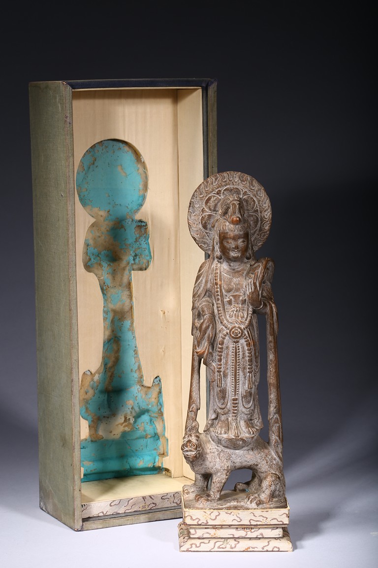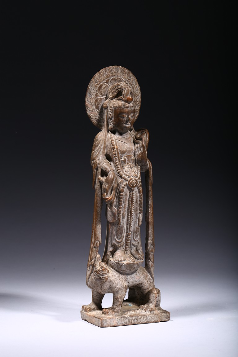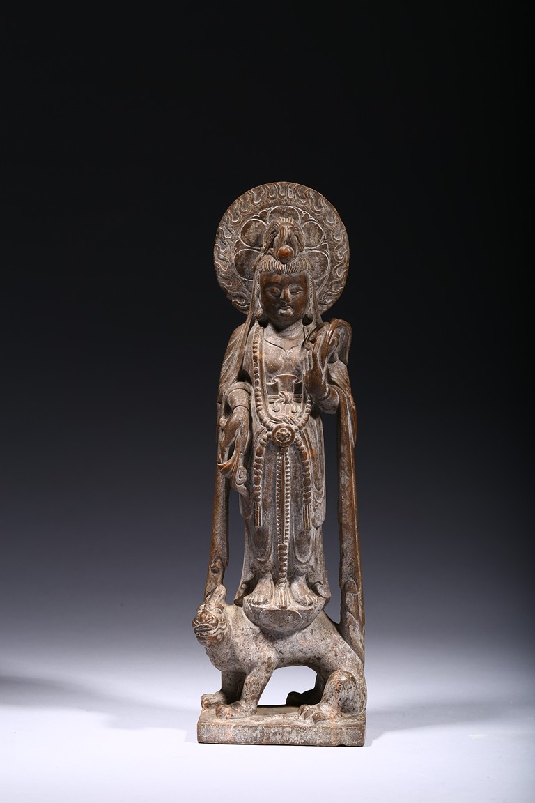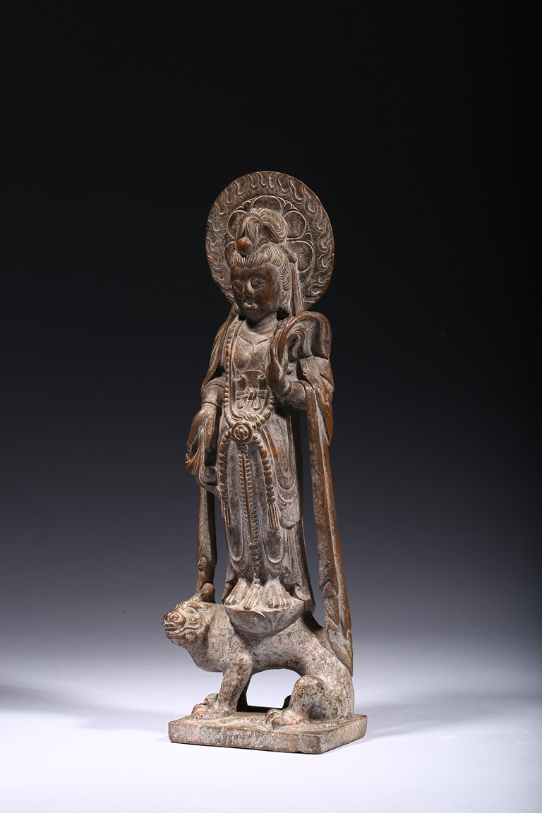 此件造像五官線條硬朗分明,雙耳低垂,雙耳碩大,鼻樑挺拔,嘴含笑意,身著飄帶天衣,站立於雄獅之上。為盛唐時期產物,石質優良,雕工精細。 張先生舊藏