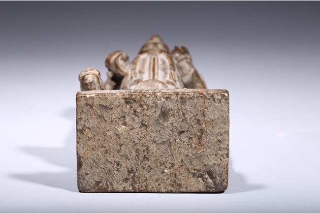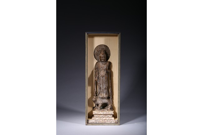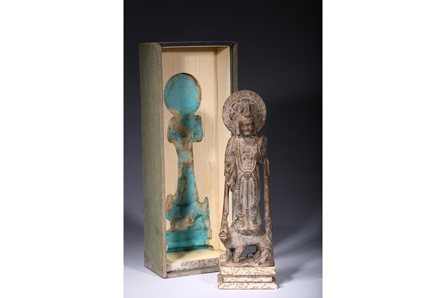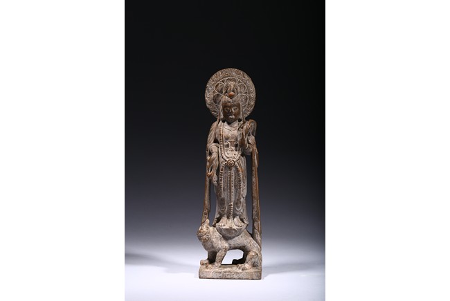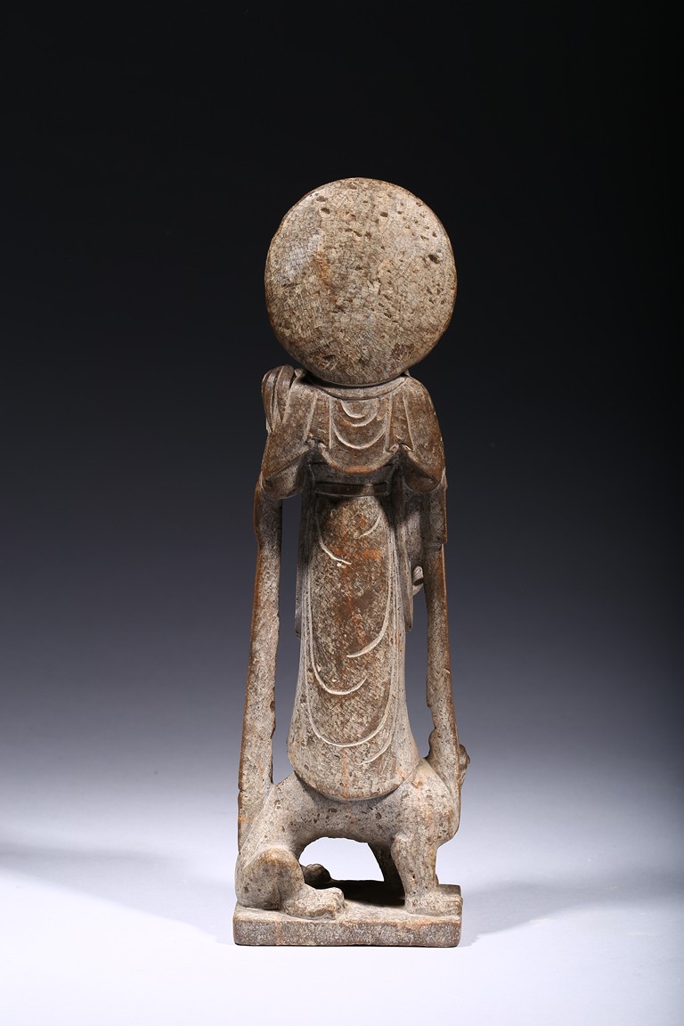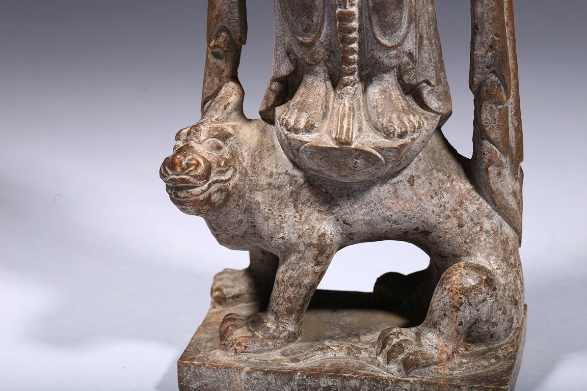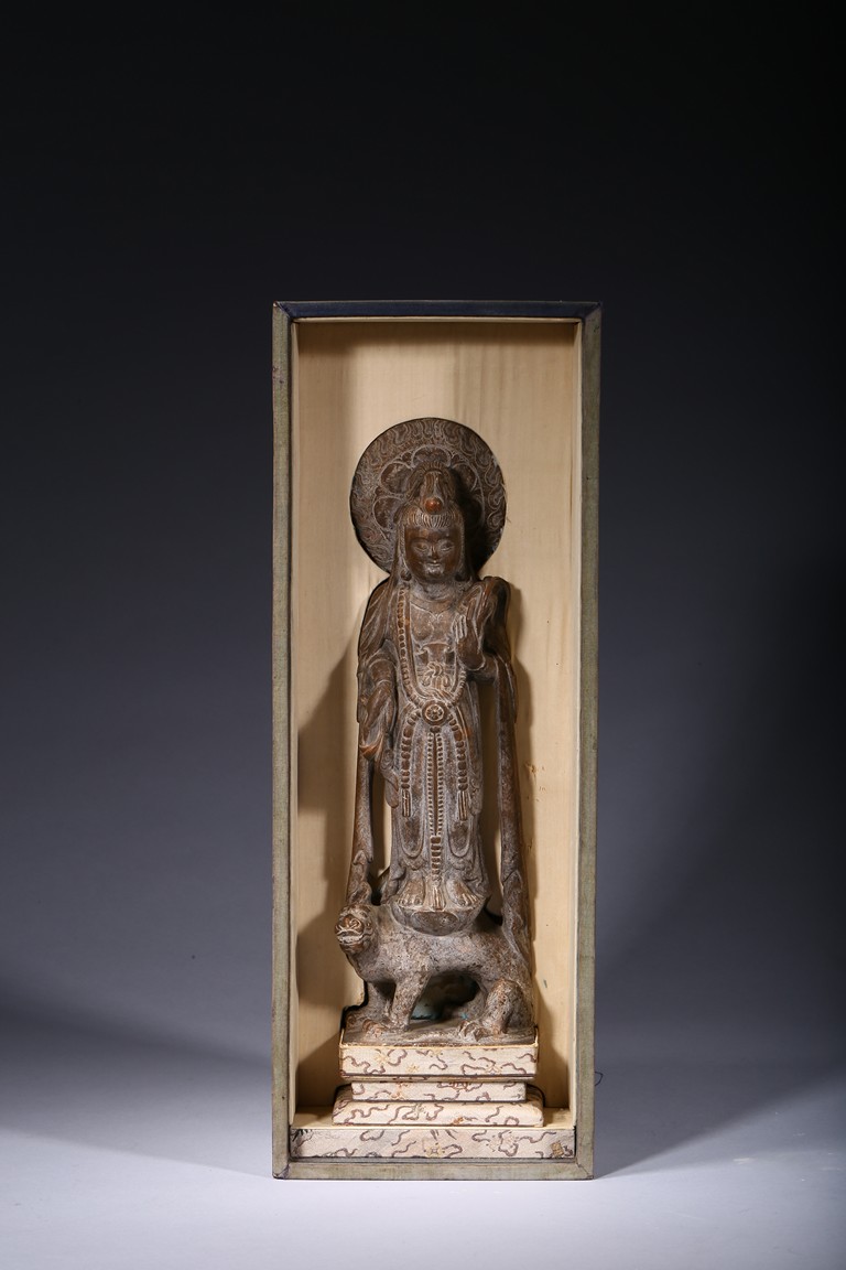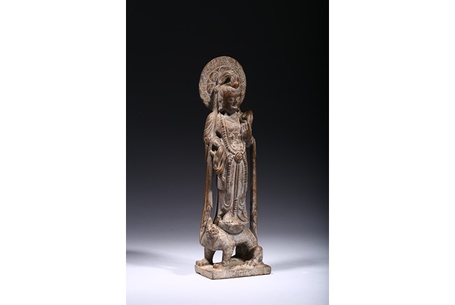 此件造像五官線條硬朗分明,雙耳低垂,雙耳碩大,鼻樑挺拔,嘴含笑意,身著飄帶天衣,站立於雄獅之上。為盛唐時期產物,石質優良,雕工精細。 張先生舊藏