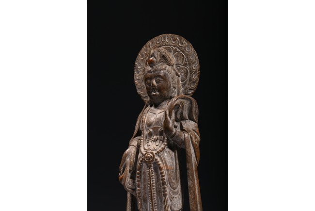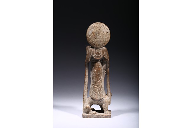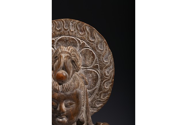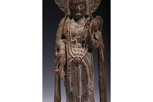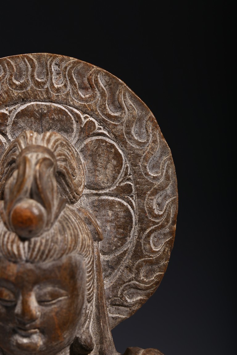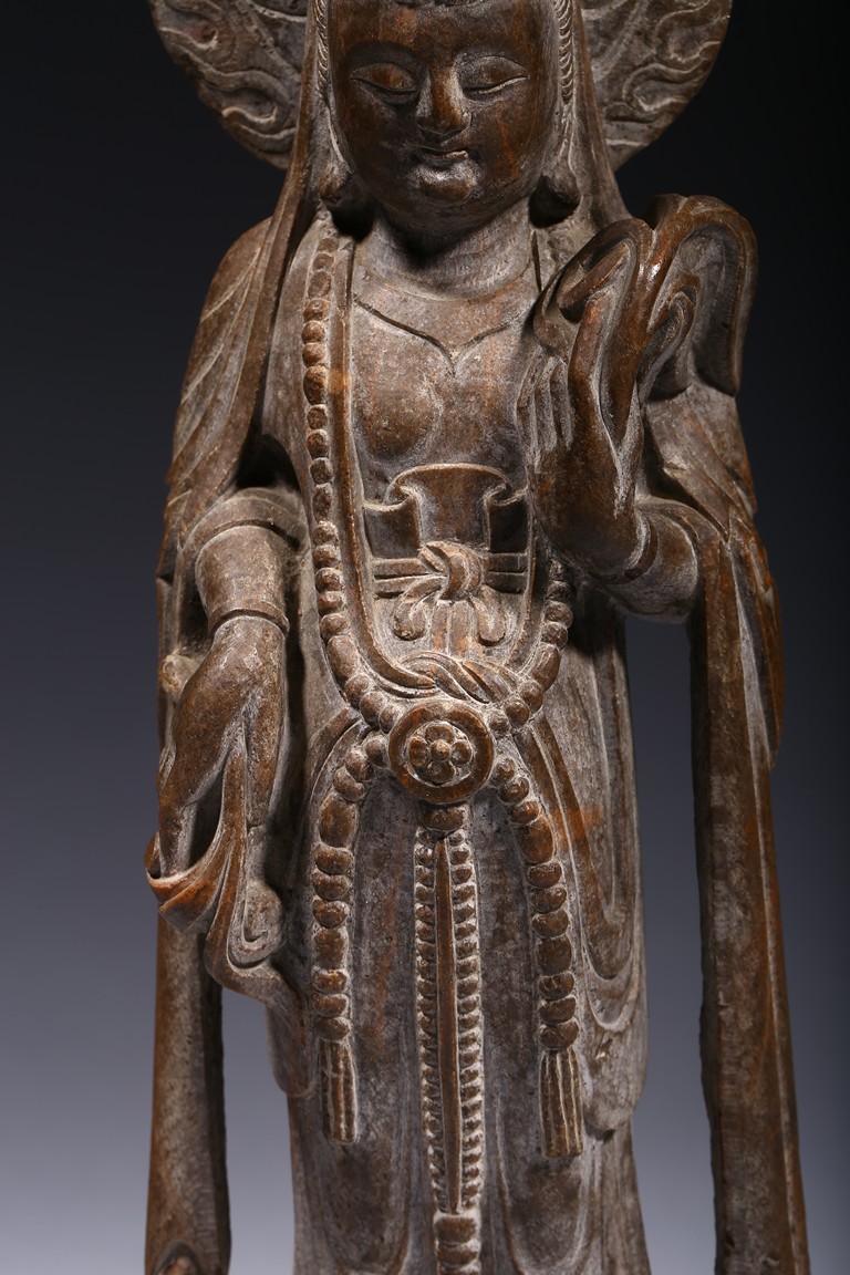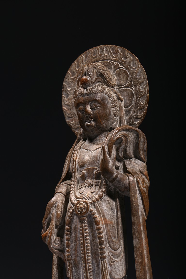 The deity standing on back of a mythical beast base and with a round mandorla framing the head, the face carved with a tranquil expression and delicate features, the body draped in loose robes and tied sashes, left hand raised holding willow tree sprig. Tang Dynasty or later.