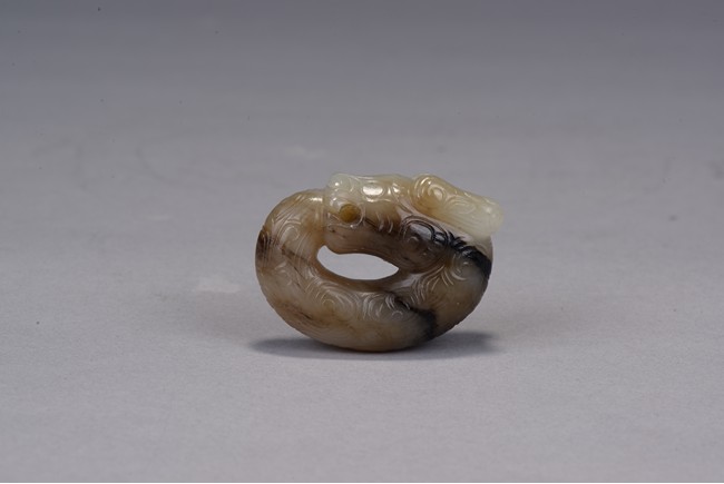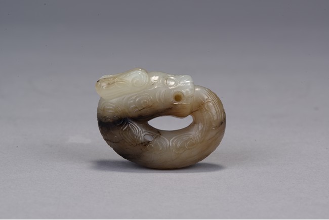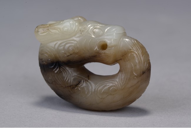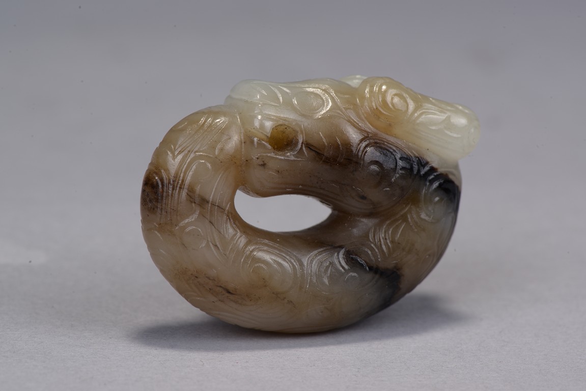 The archaistic coiled dragon with tail to head, body incised with scrolled pattern. Qing Dynasty period.