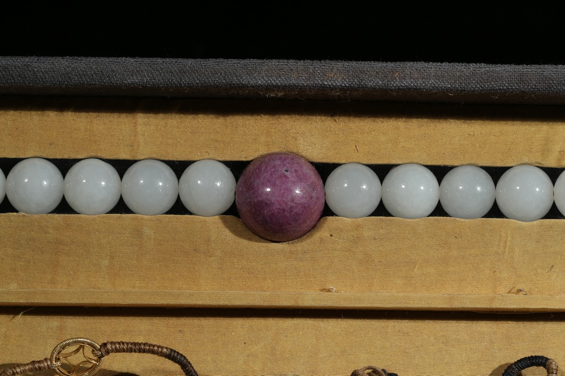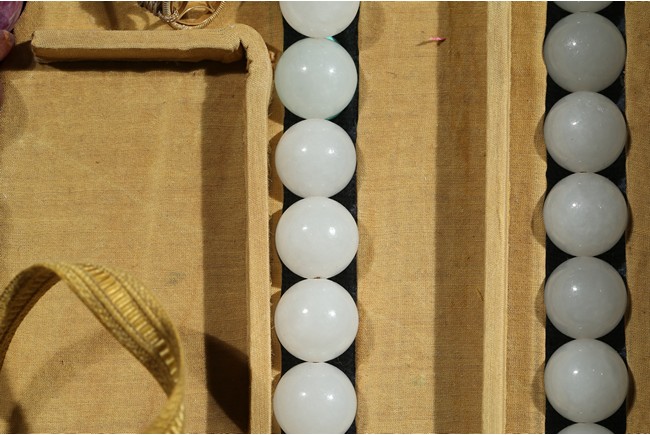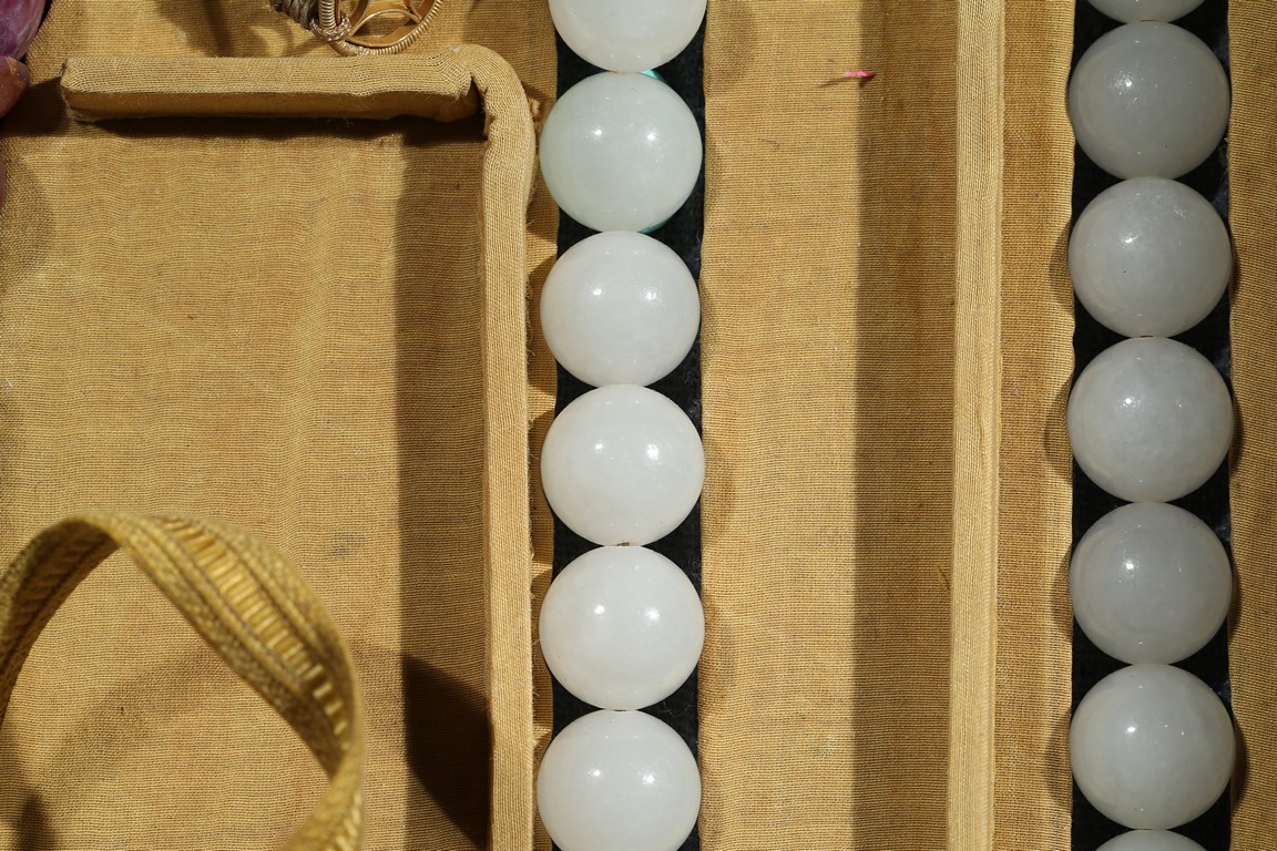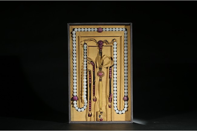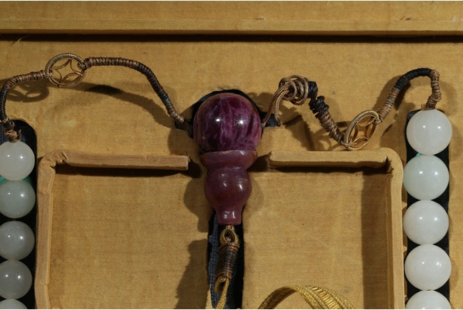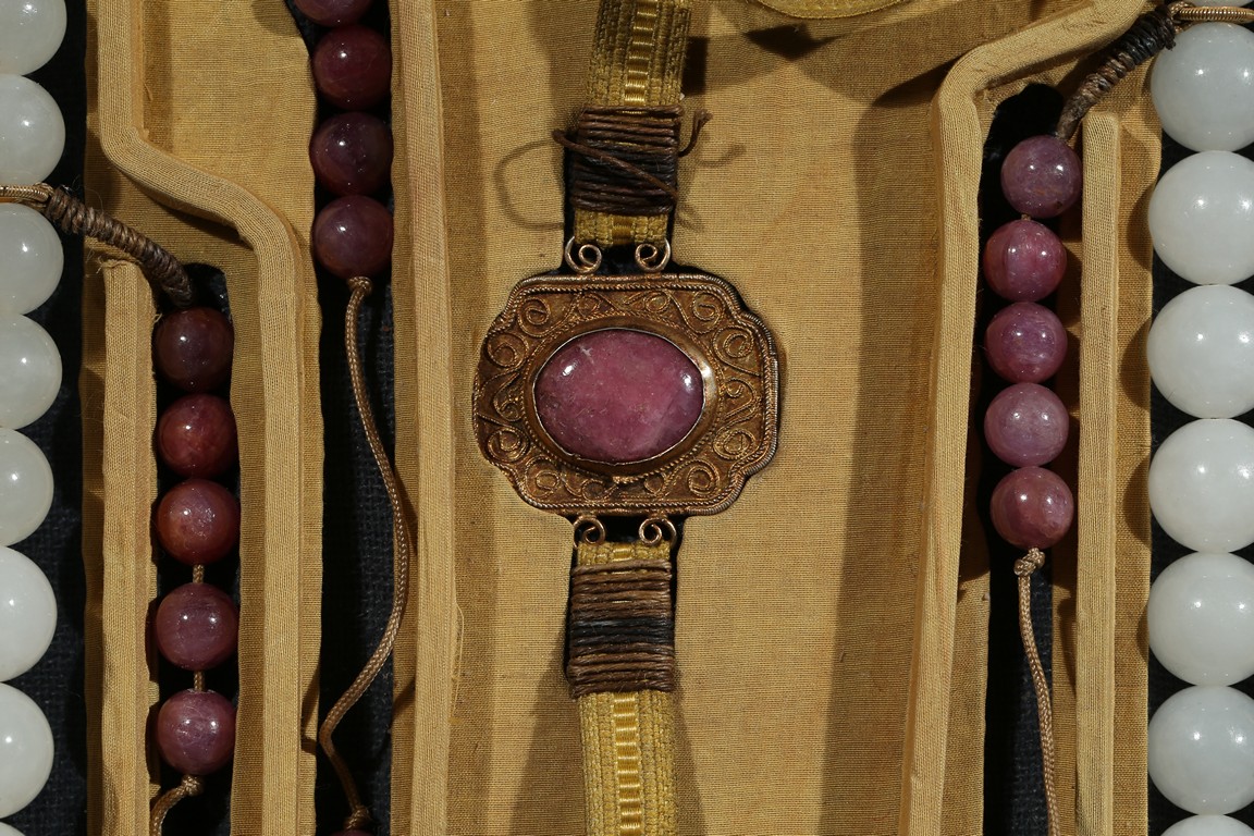 The 108 white jade beads divided by four tourmaline fotou (Buddha heads), the fotou at the back connected to a gourd-shaped fotouta (Buddha head stupa), supporting a silk cord tassel intersected by a flattened rectangular tourmaline inlaid pendant, terminating to a filigree-mounted tourmaline tear-shaped bead, enhanced by three jinnian strands of tourmaline beads each further suspending filigree-mounted tear-shaped drops.