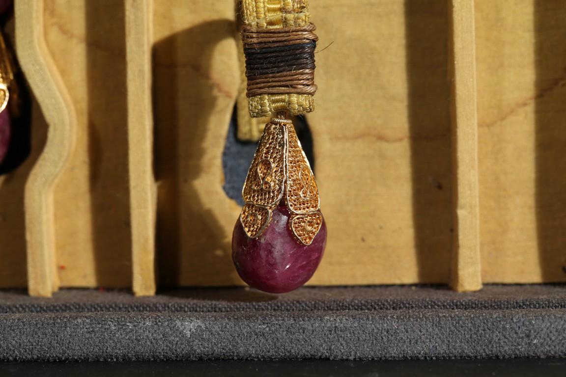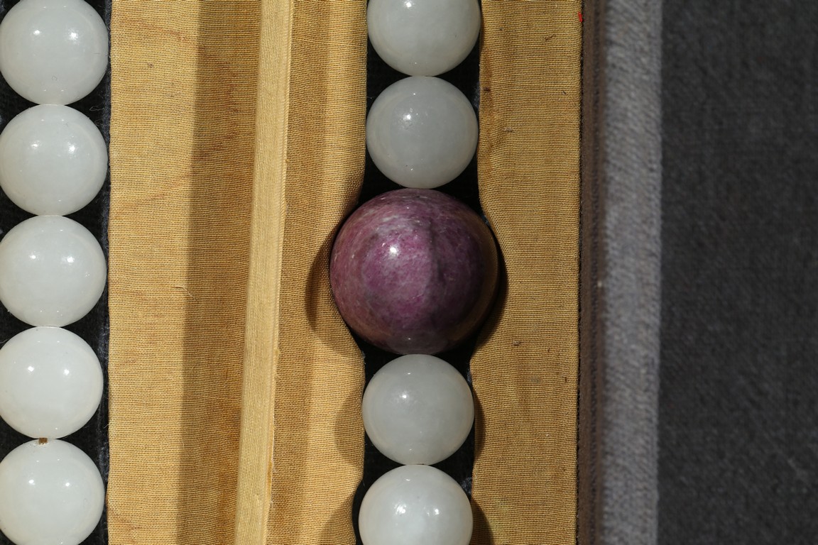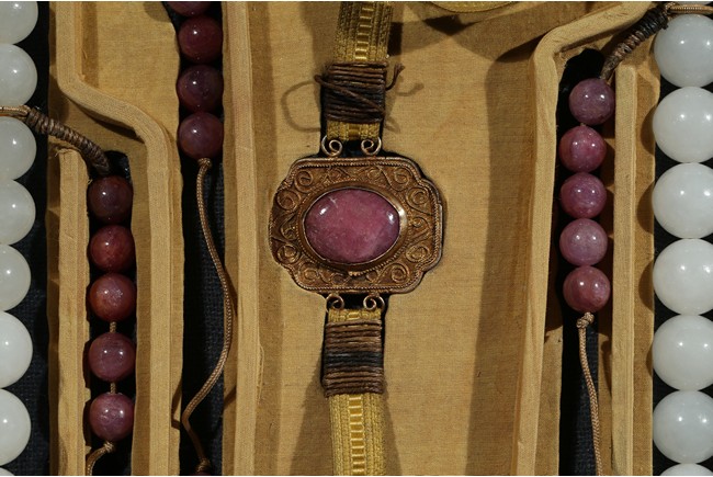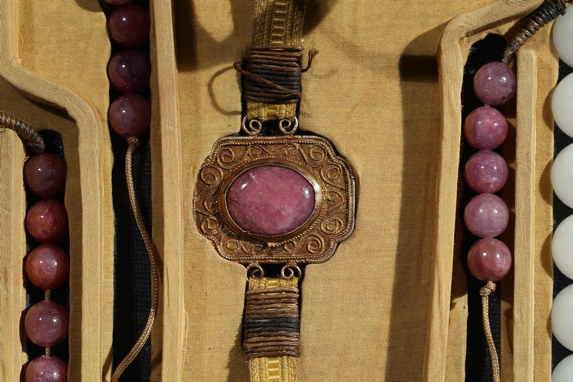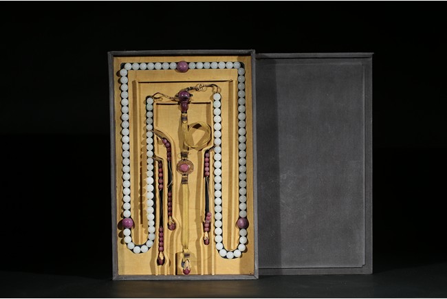 The 108 white jade beads divided by four tourmaline fotou (Buddha heads), the fotou at the back connected to a gourd-shaped fotouta (Buddha head stupa), supporting a silk cord tassel intersected by a flattened rectangular tourmaline inlaid pendant, terminating to a filigree-mounted tourmaline tear-shaped bead, enhanced by three jinnian strands of tourmaline beads each further suspending filigree-mounted tear-shaped drops.