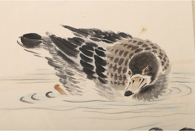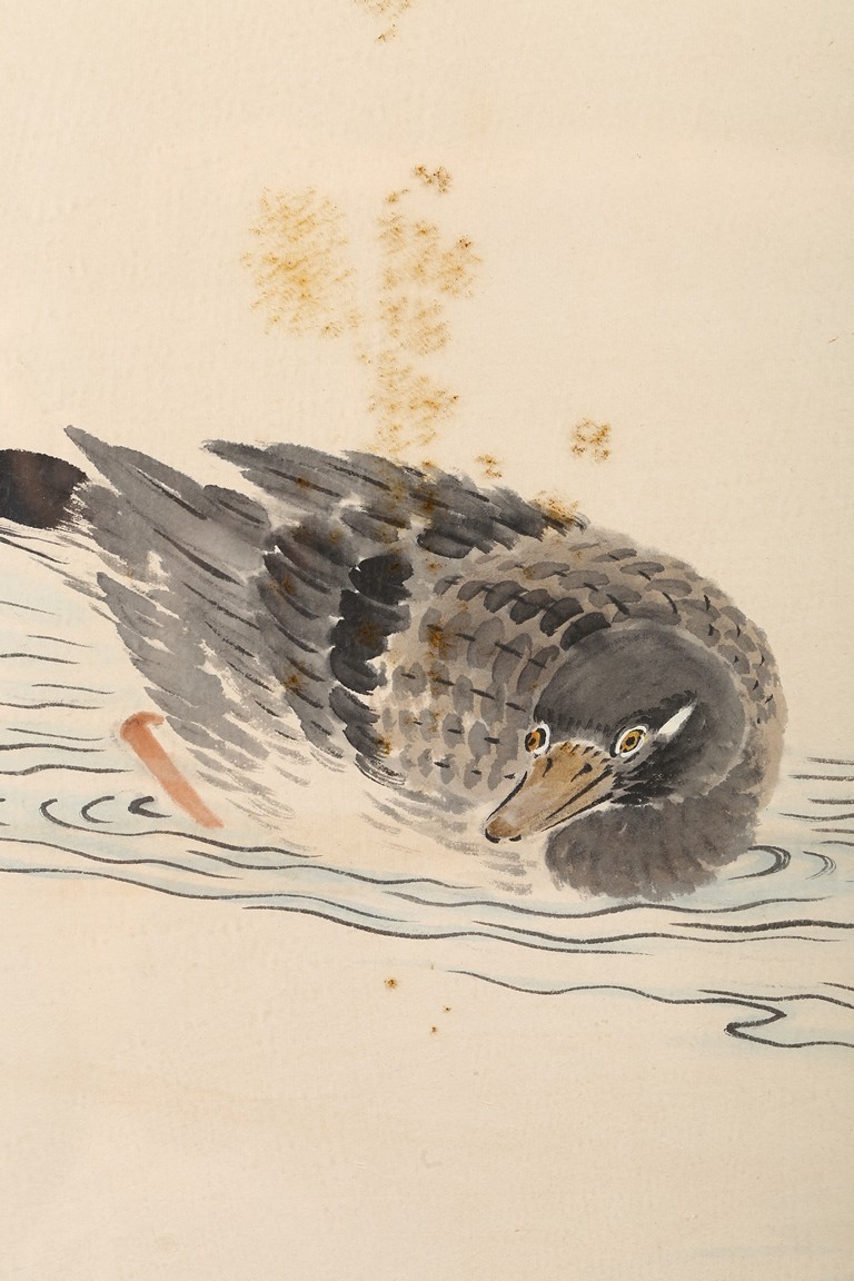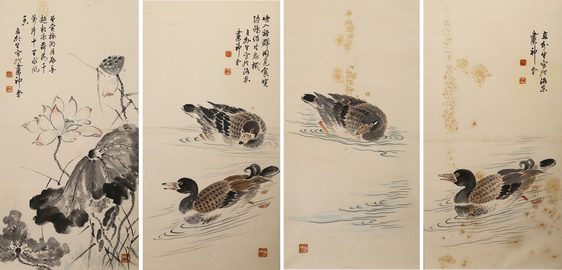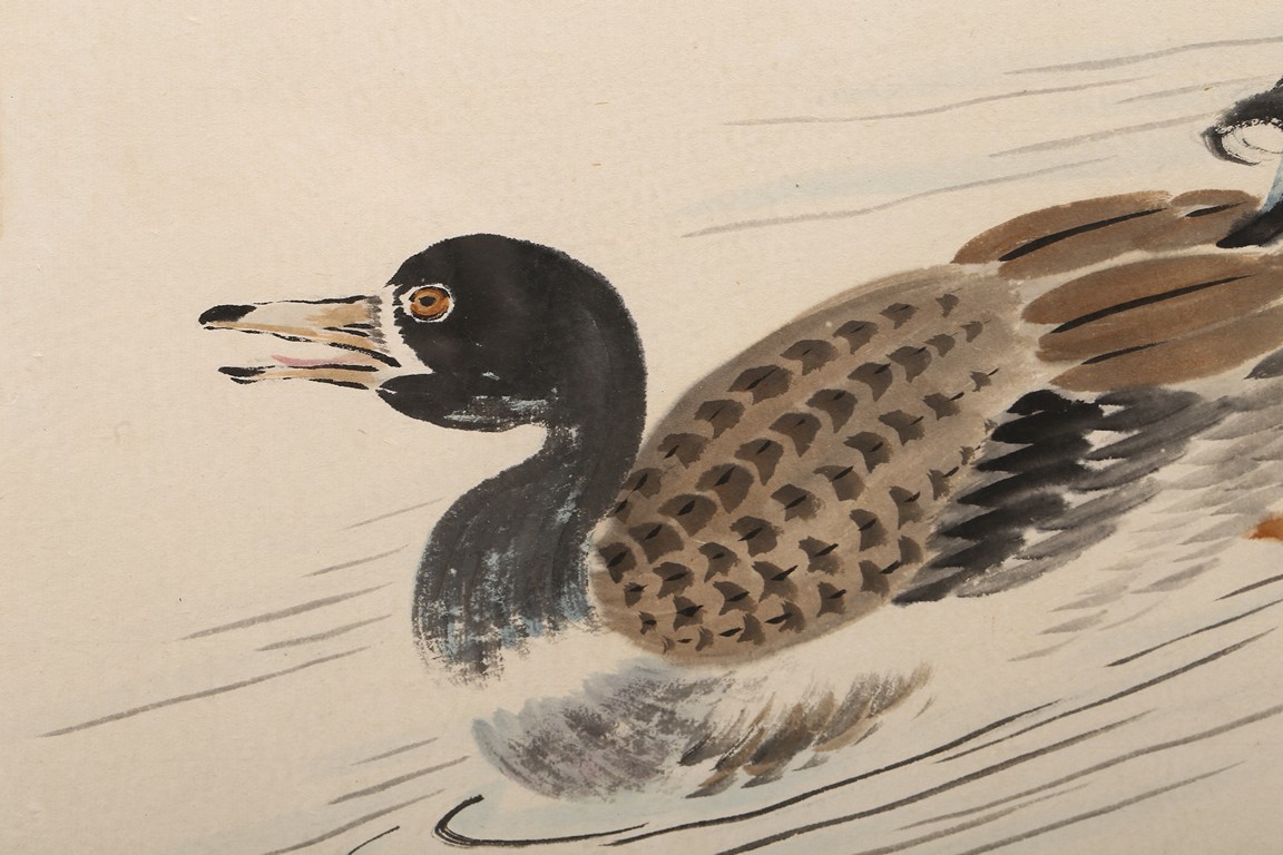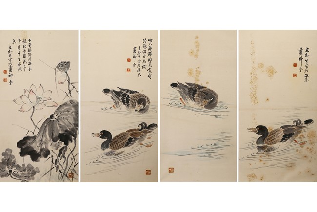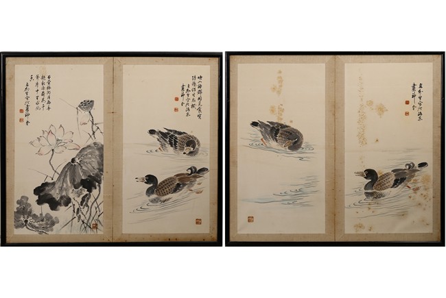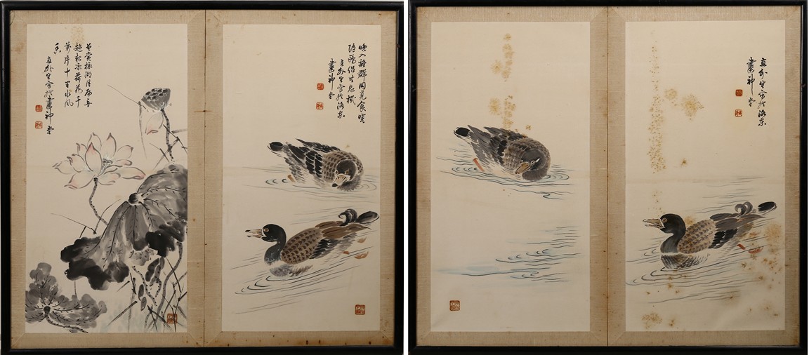 Set of four color and ink on paper. Mandarin Duck. Framed. Inscribed and signed, with total of nine seals of the artist.